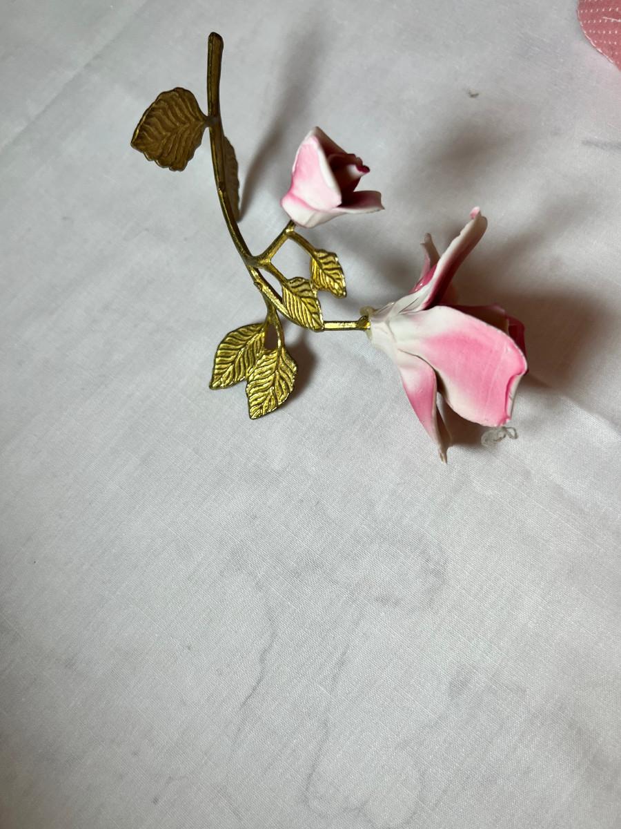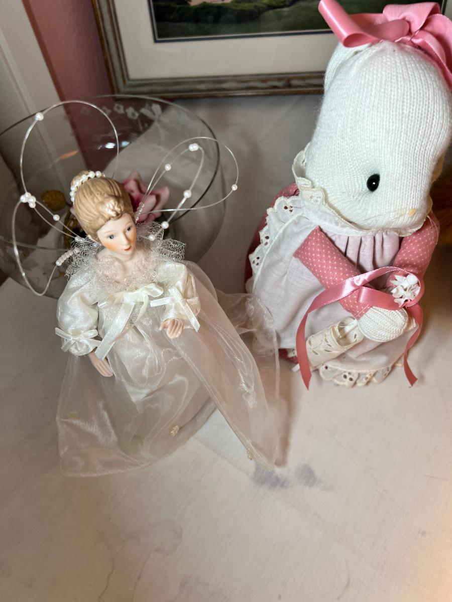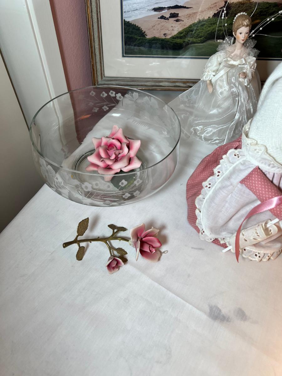 Teddy bears, Precious Moments lamp, ceramic roses in an etched glass dish