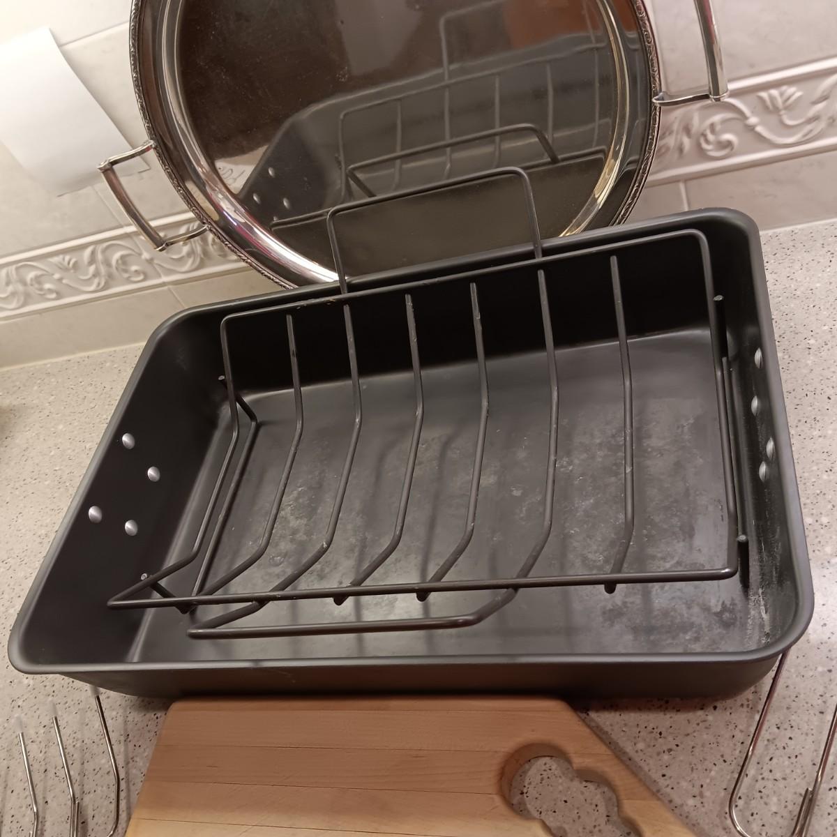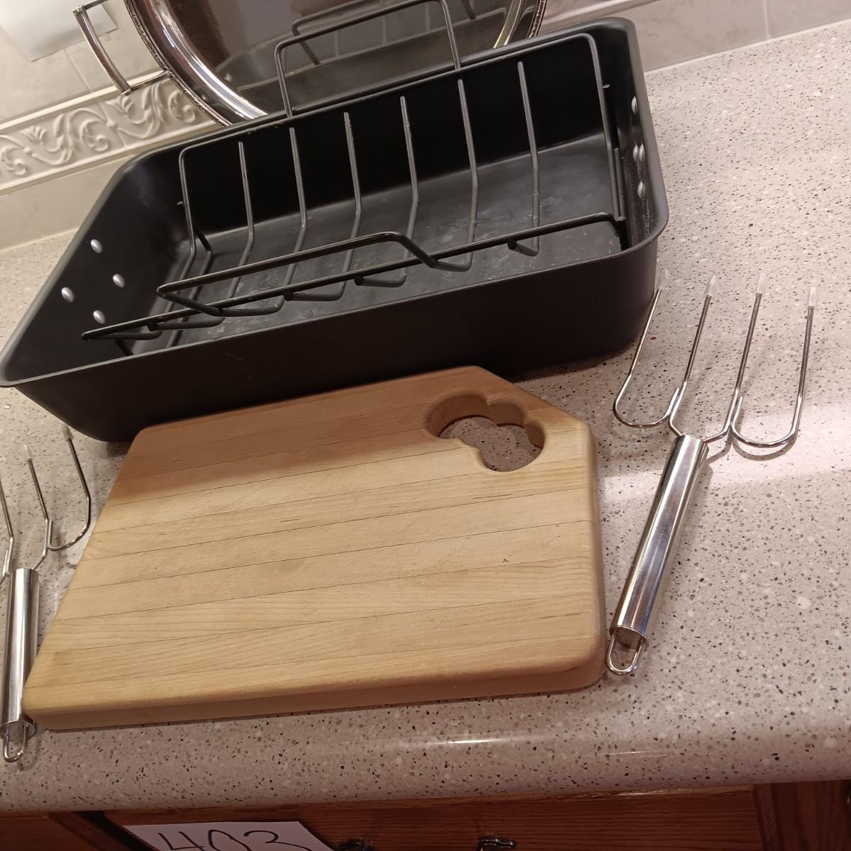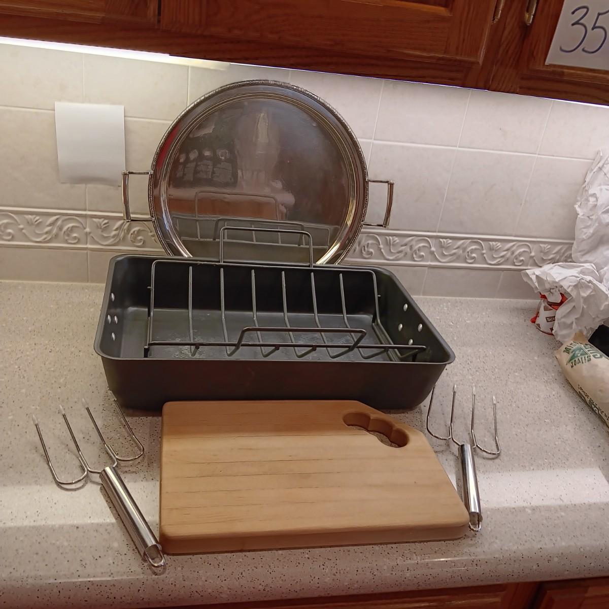 TEFLON ROASTING PAN, LARGE PLATTER WITH HANDLES, WOODEN CUTTING BOARD AND CARVING FORKS
