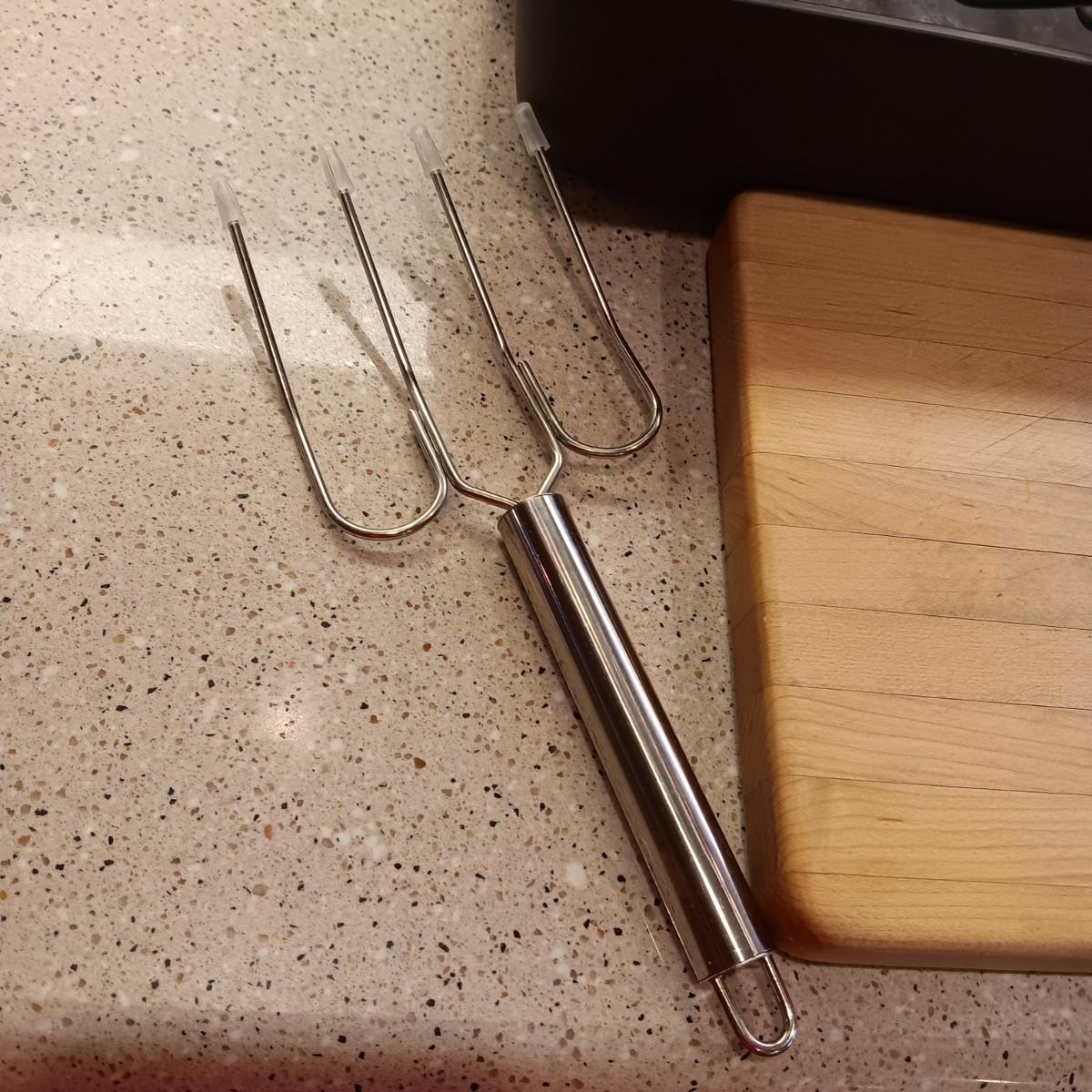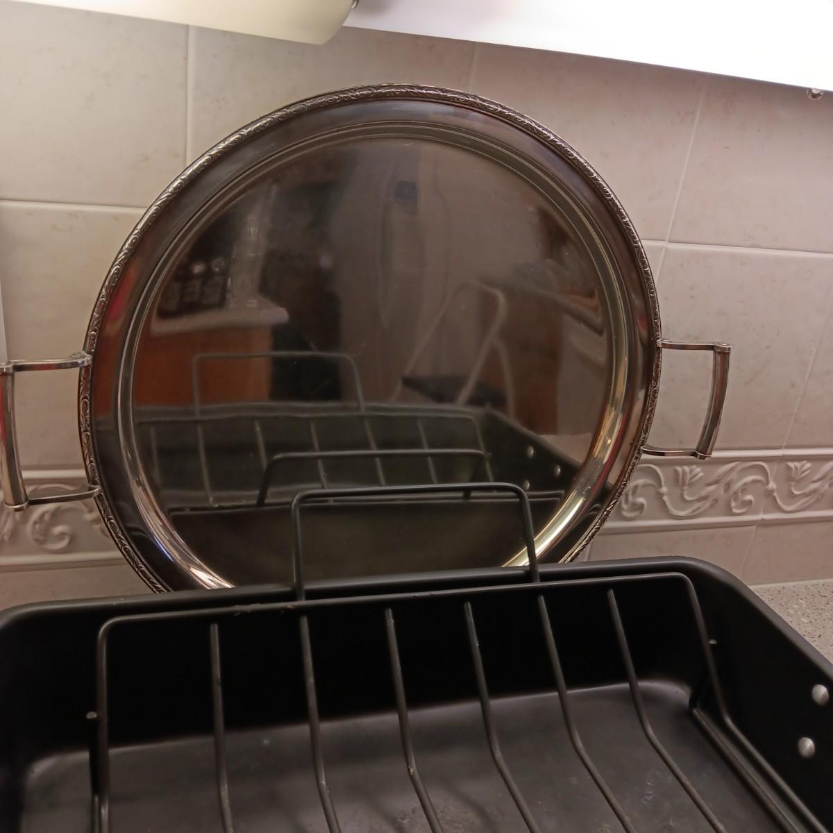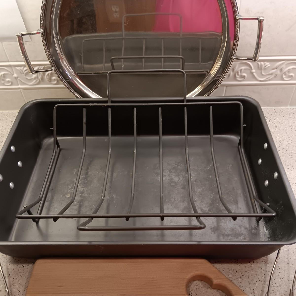 TEFLON ROASTING PAN, LARGE PLATTER WITH HANDLES, WOODEN CUTTING BOARD AND CARVING FORKS