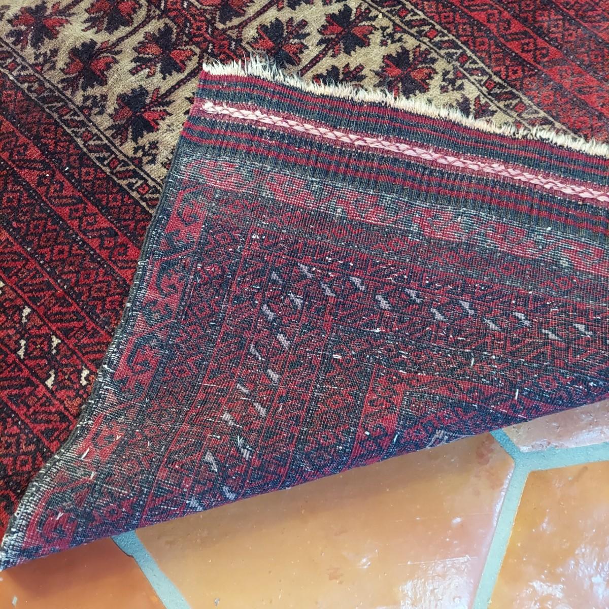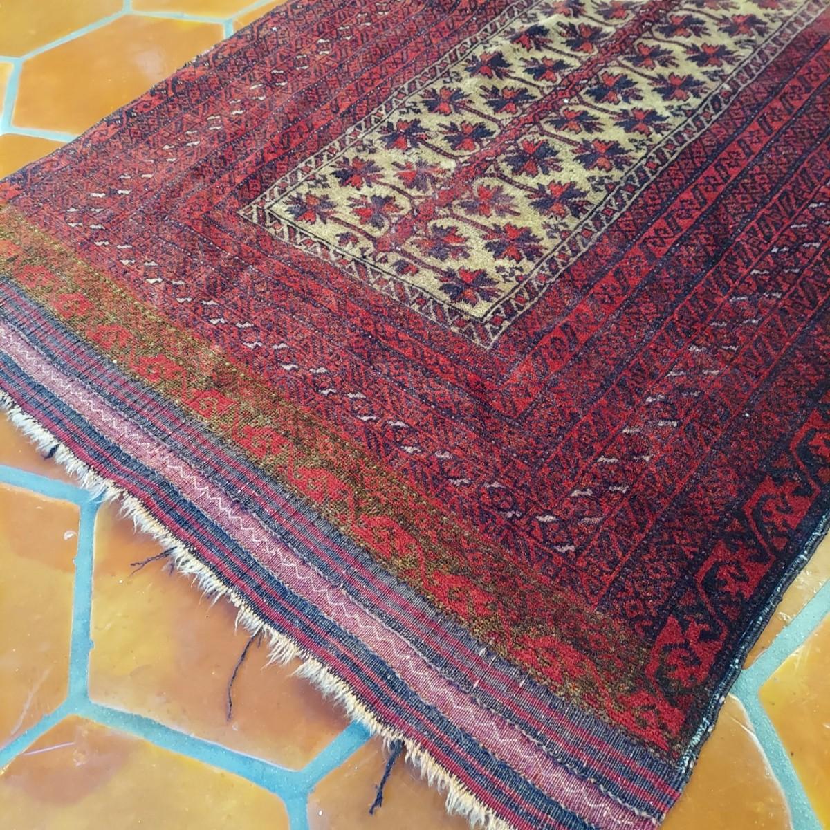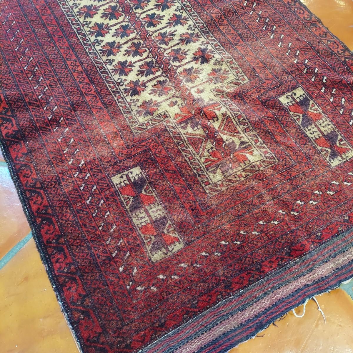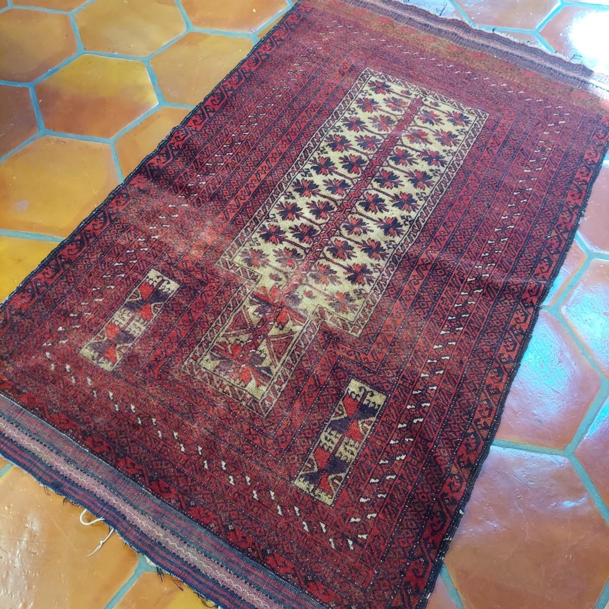 Beautiful hand-woven area rug in a Tekke Turkish style that appears to be wool. Measures 62” x 38”. Some wrinkling overall and some discoloration at one end. Please see photos for details. Shipping available.