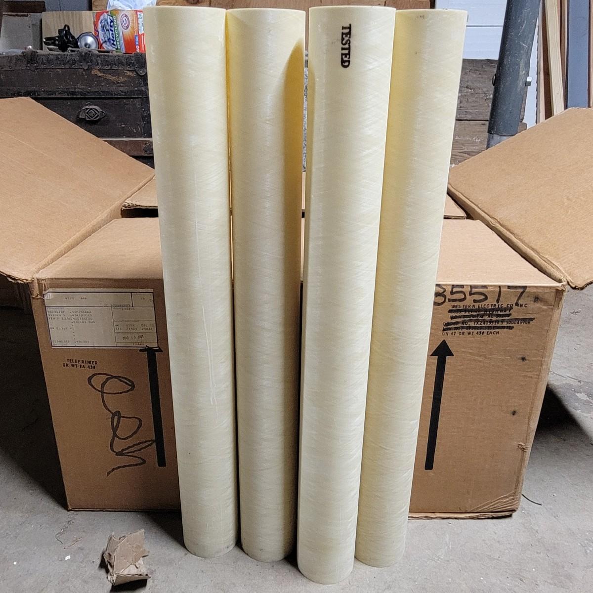 A box of what appears to be telecommunications fiberglass tunes. Each tube measures approximately 2.75"D x 24"H. There are approximately 35 or more pieces in the box. Local pickup only