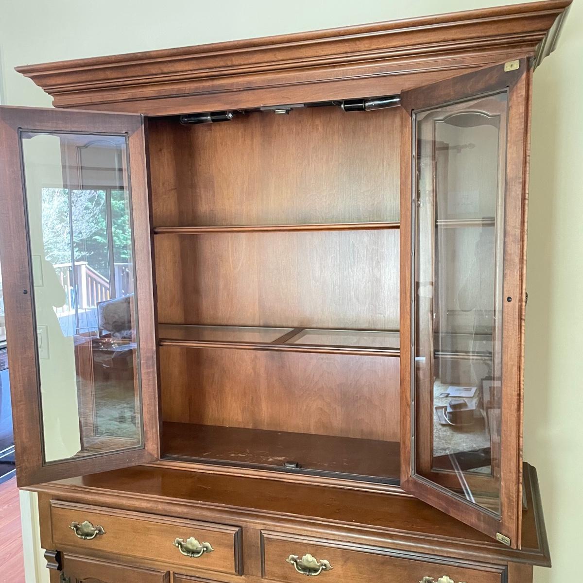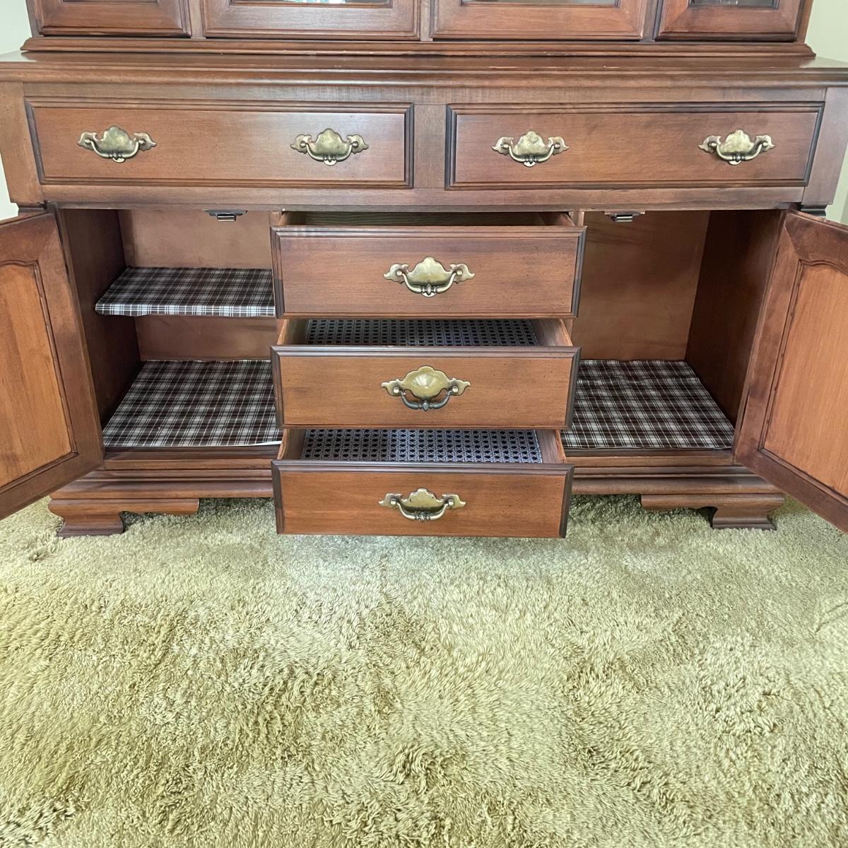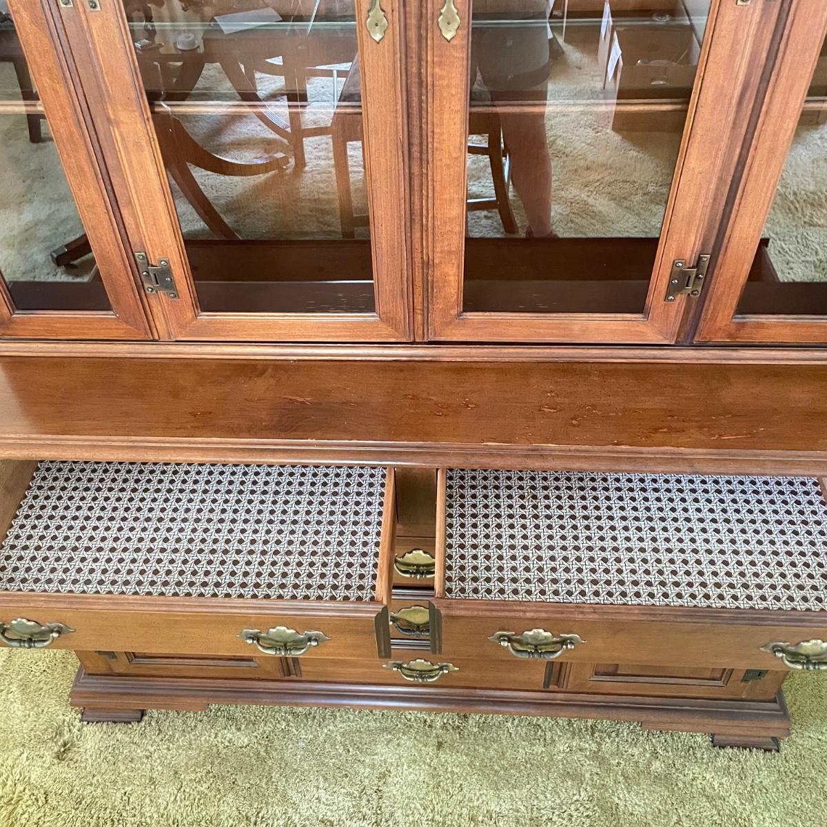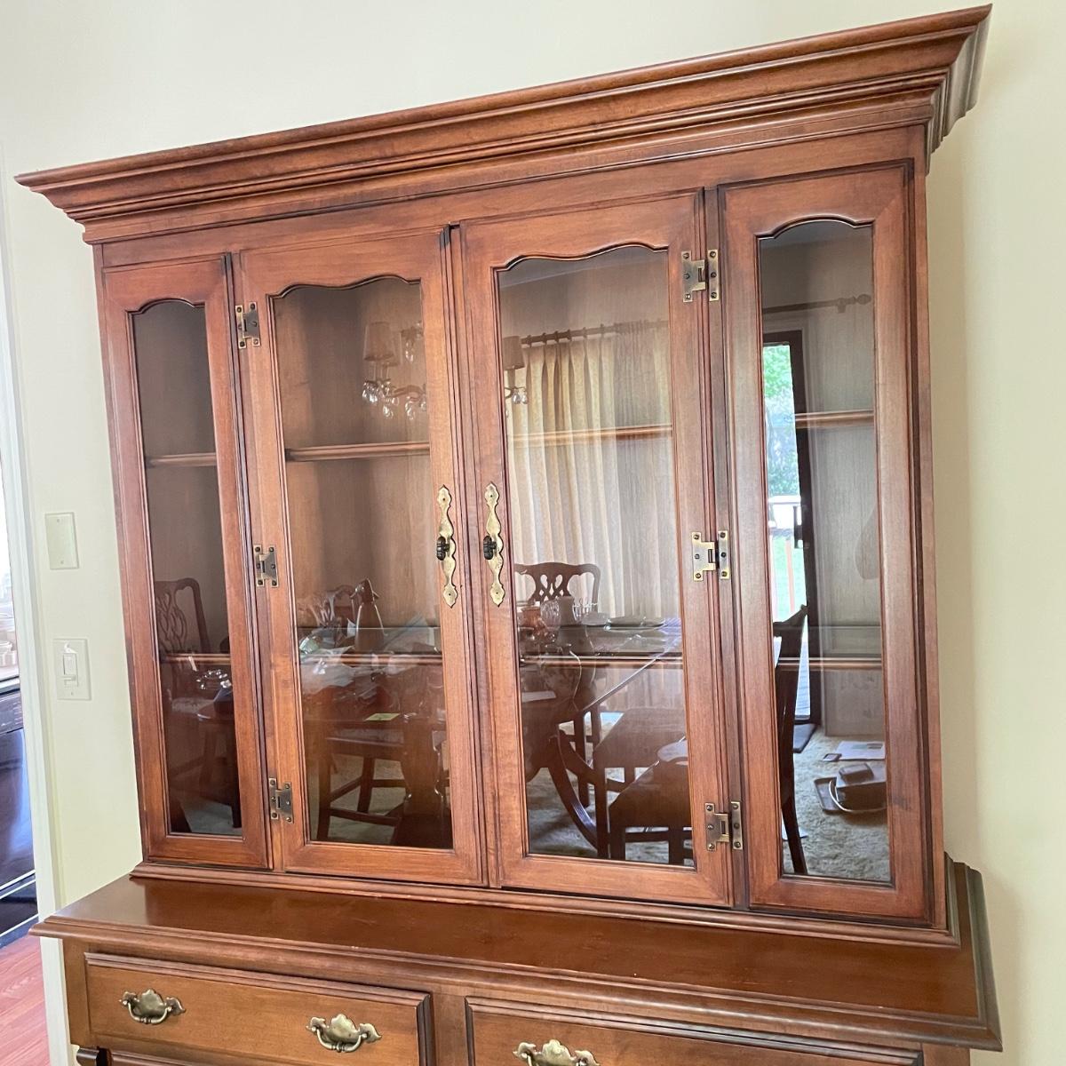 Tell City China Hutch has two glass panels and two paneled doors along with glass panels on the top two shelves. The top of the China hutch is secure in place by weight and does not require tools to remove the top. The bottom cabinet contains five dovetail drawers and two lower cabinets. Other than some blemishes to the lowest top shelf and some dings to the bottom’s top, this piece is in nice shape. See images. Bring help to load, piece will need to be transported down stairs. Local pick up only.