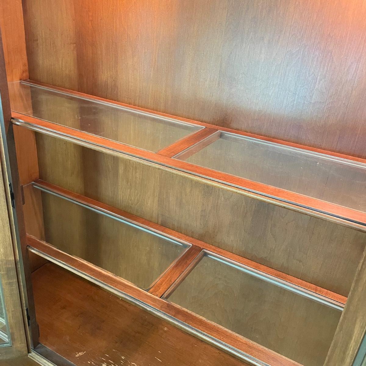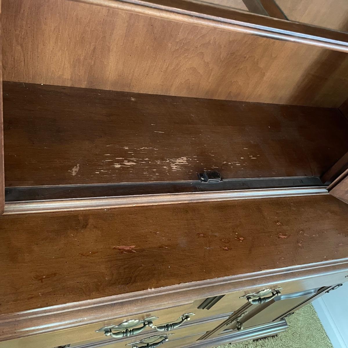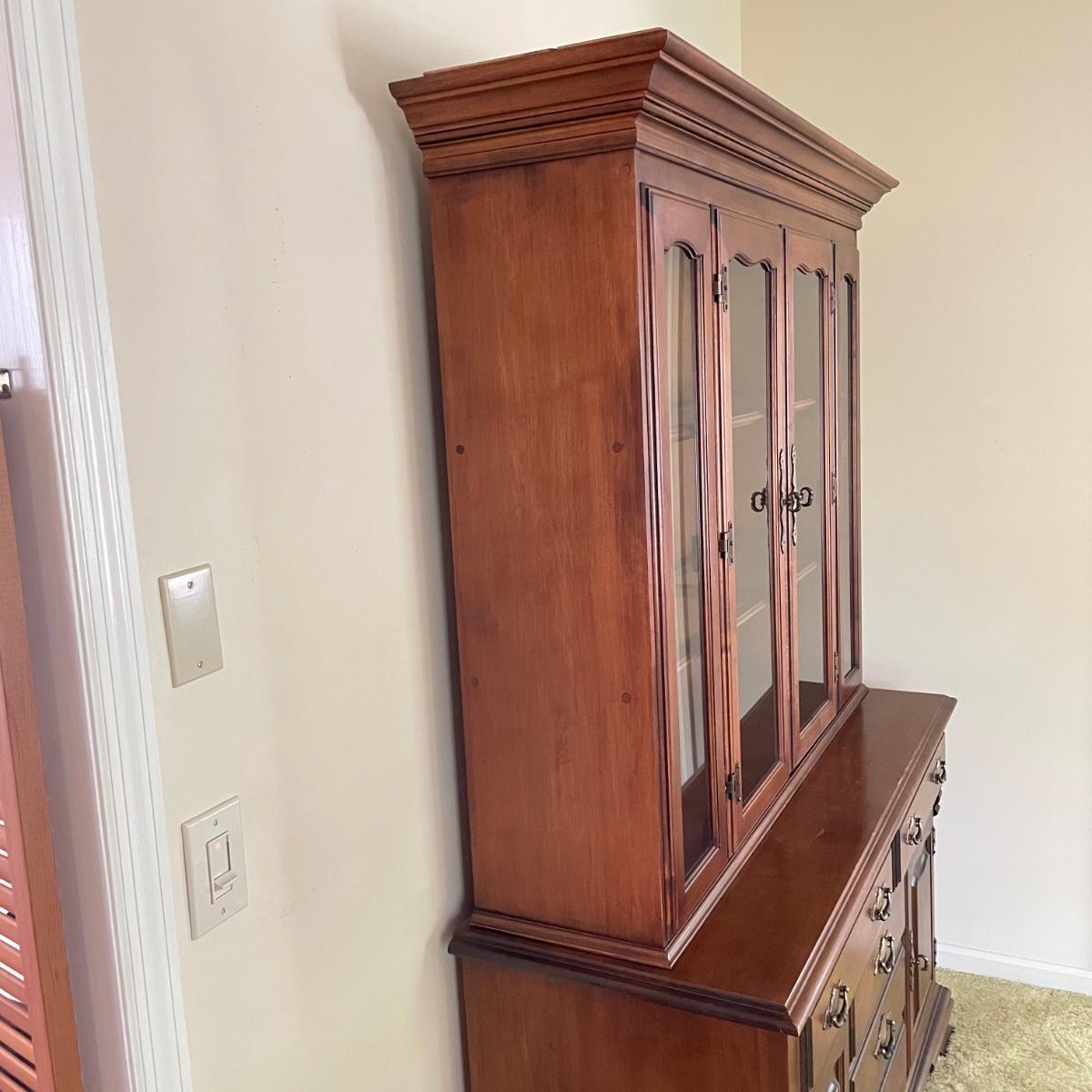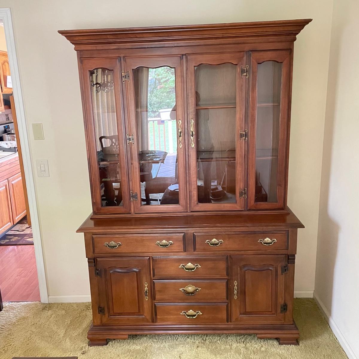 Tell City China Hutch has two glass panels and two paneled doors along with glass panels on the top two shelves. The top of the China hutch is secure in place by weight and does not require tools to remove the top. The bottom cabinet contains five dovetail drawers and two lower cabinets. Other than some blemishes to the lowest top shelf and some dings to the bottom’s top, this piece is in nice shape. See images. Bring help to load, piece will need to be transported down stairs. Local pick up only.