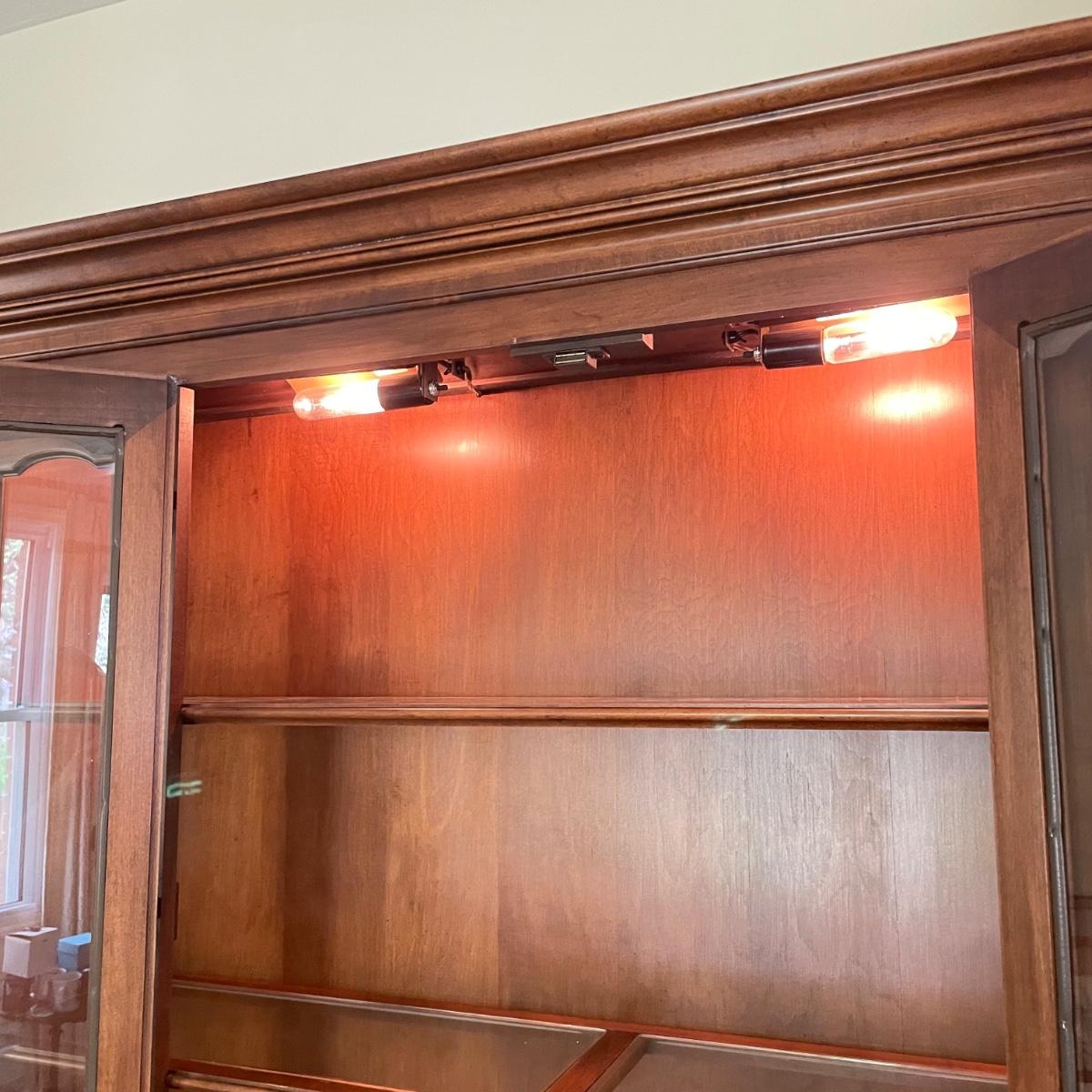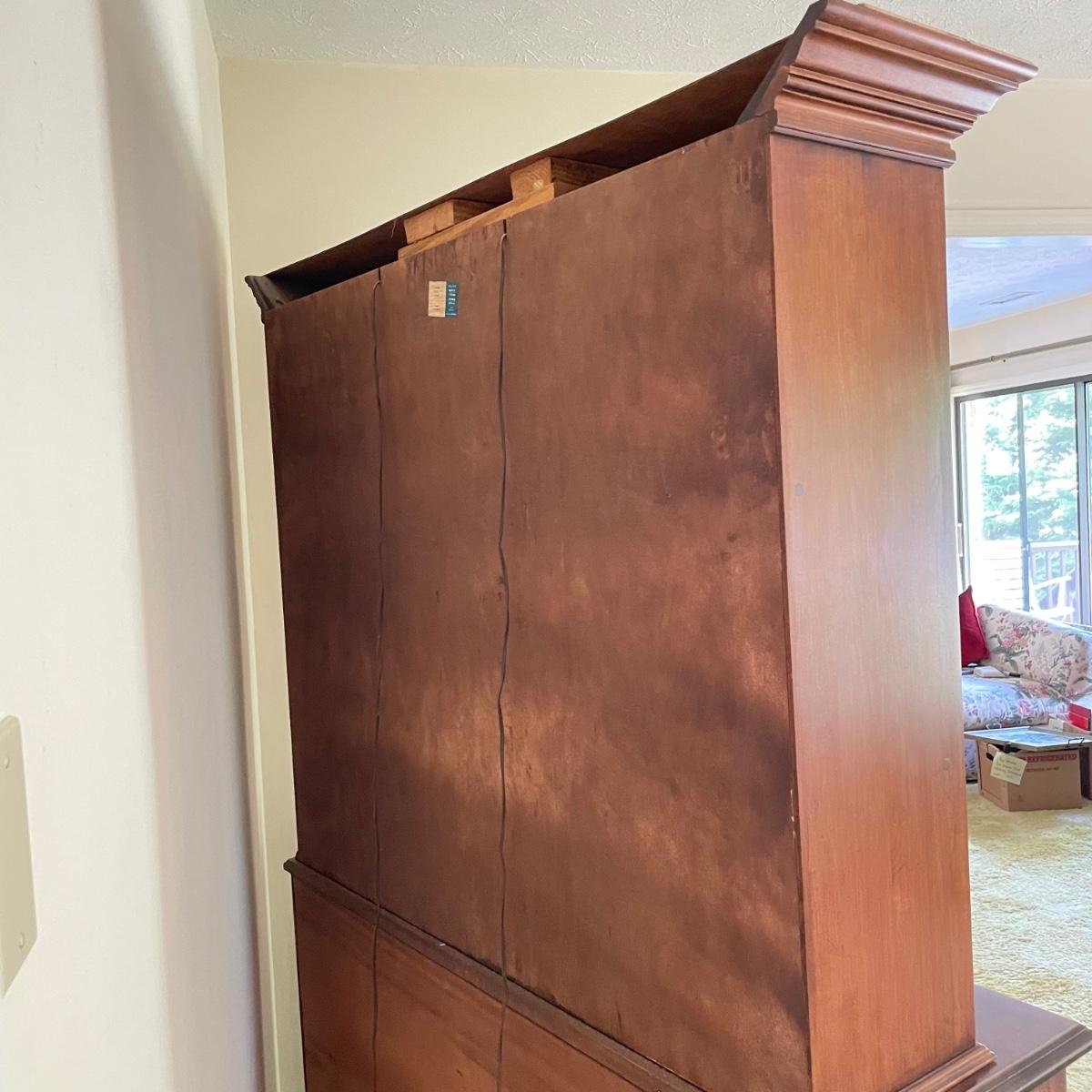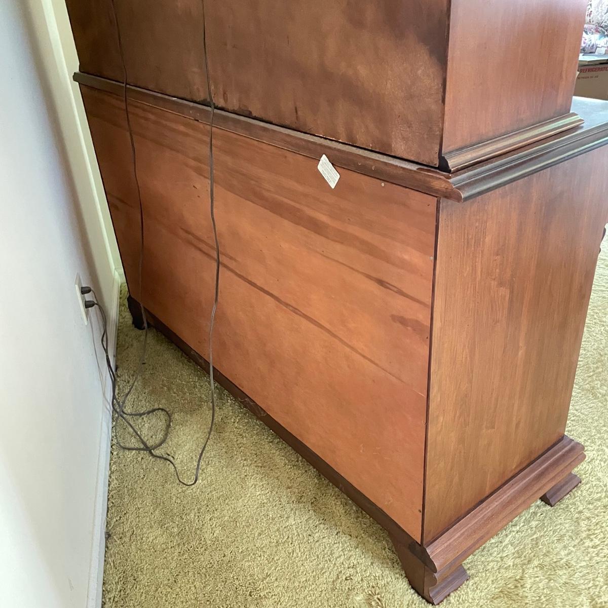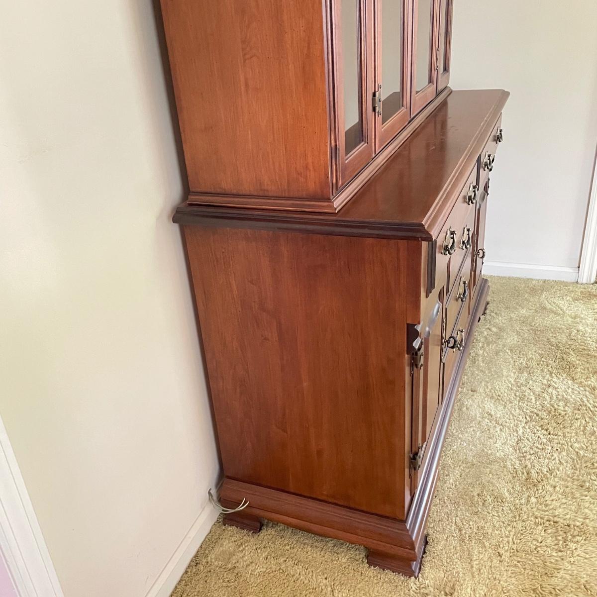 Tell City China Hutch has two glass panels and two paneled doors along with glass panels on the top two shelves. The top of the China hutch is secure in place by weight and does not require tools to remove the top. The bottom cabinet contains five dovetail drawers and two lower cabinets. Other than some blemishes to the lowest top shelf and some dings to the bottom’s top, this piece is in nice shape. See images. Bring help to load, piece will need to be transported down stairs. Local pick up only.