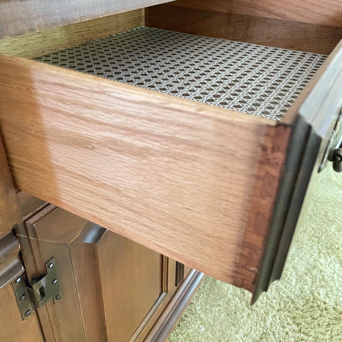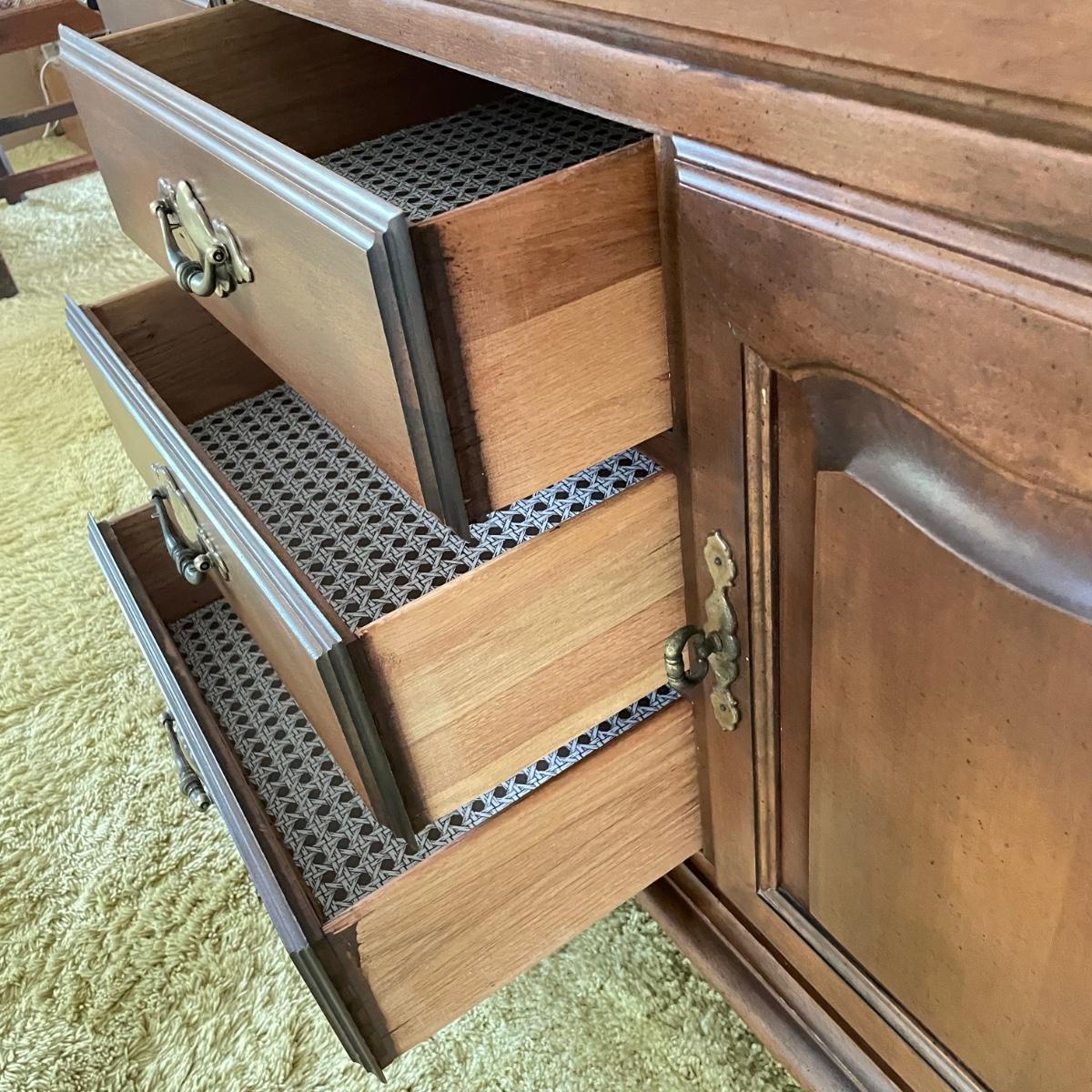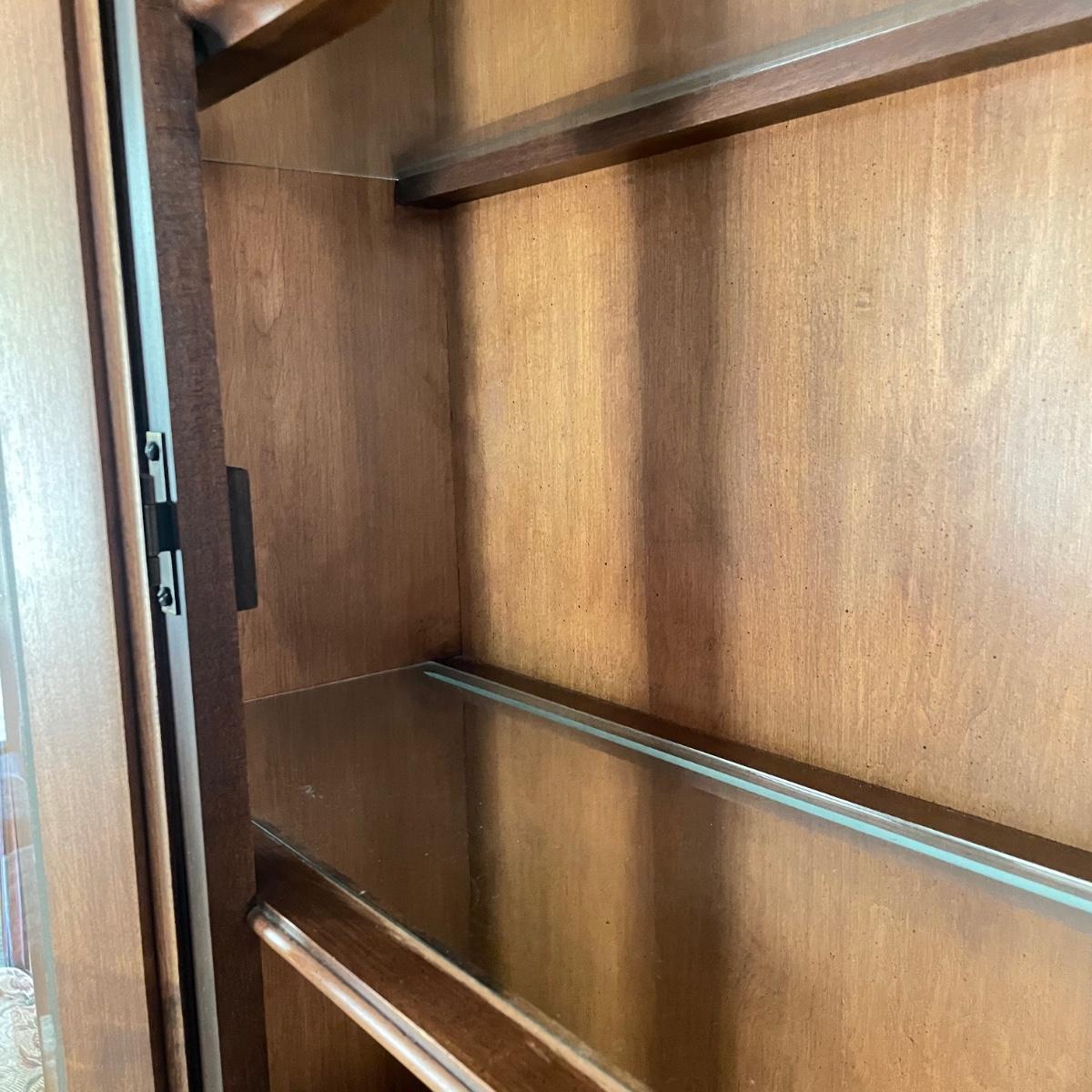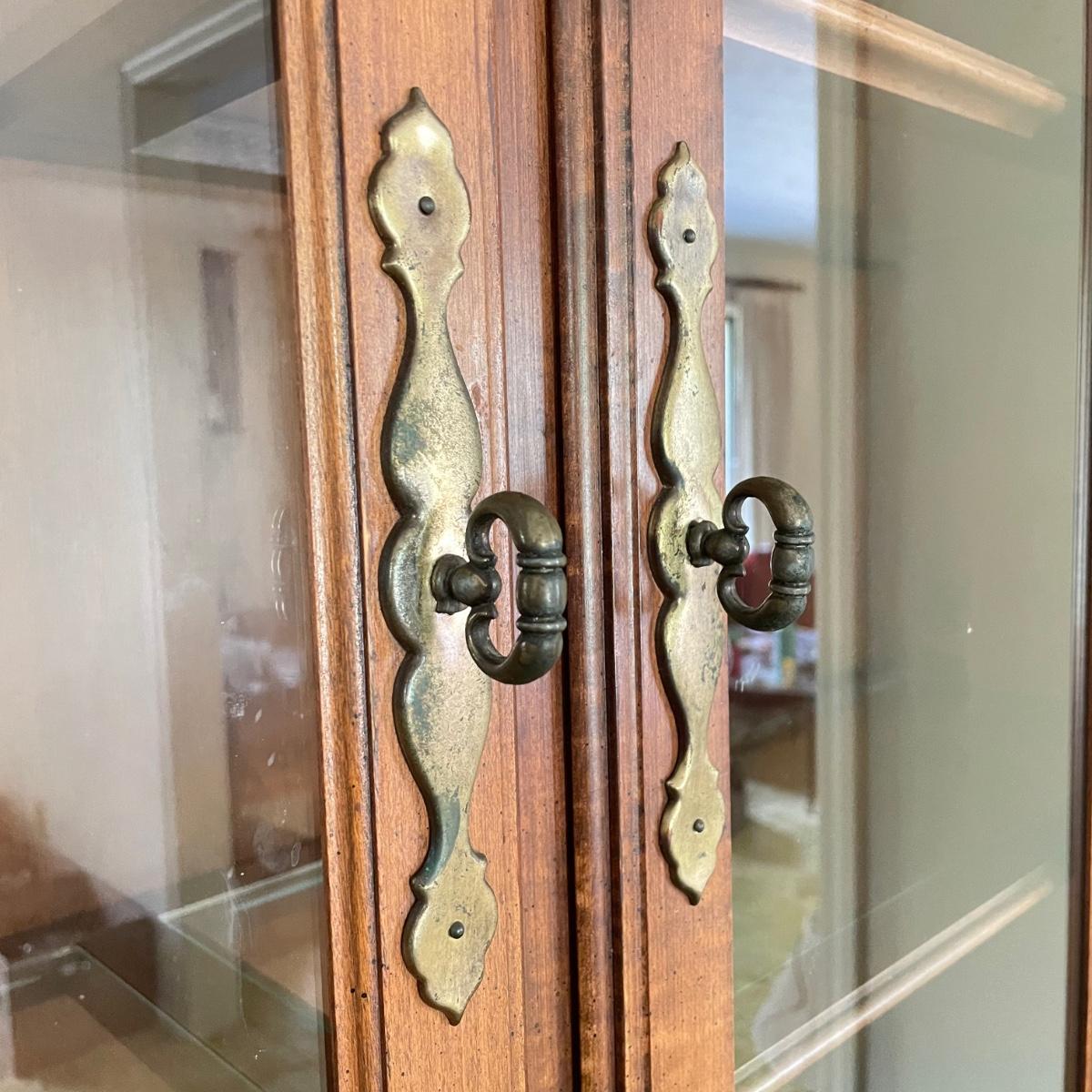 Tell City China Hutch has two glass panels and two paneled doors along with glass panels on the top two shelves. The top of the China hutch is secure in place by weight and does not require tools to remove the top. The bottom cabinet contains five dovetail drawers and two lower cabinets. Other than some blemishes to the lowest top shelf and some dings to the bottom’s top, this piece is in nice shape. See images. Bring help to load, piece will need to be transported down stairs. Local pick up only.