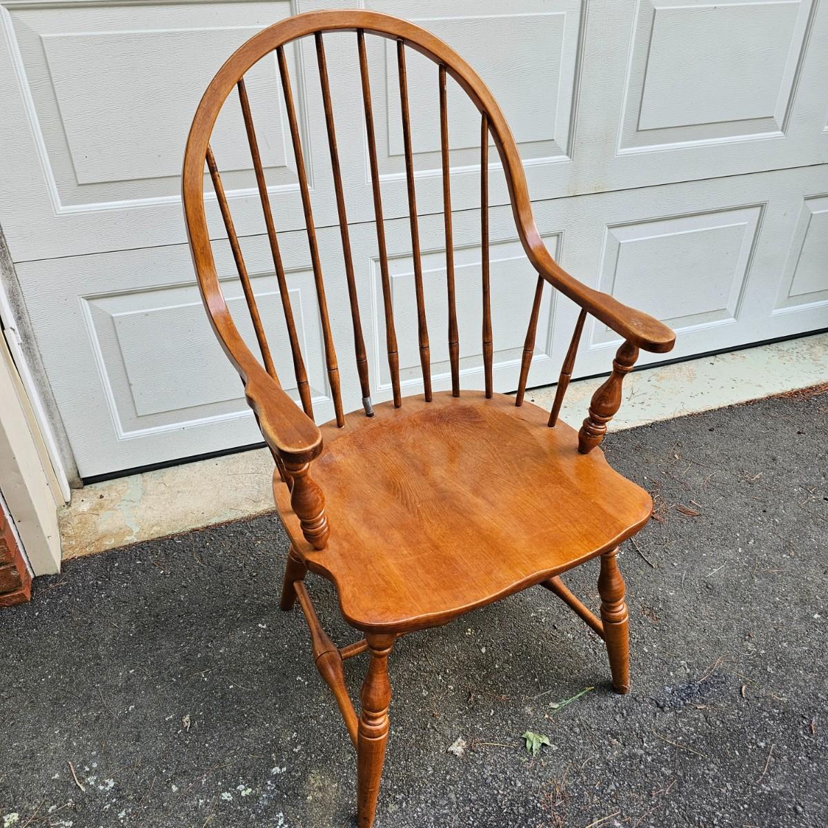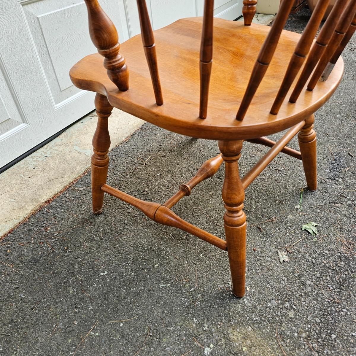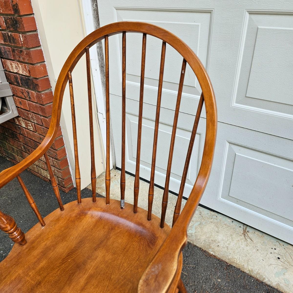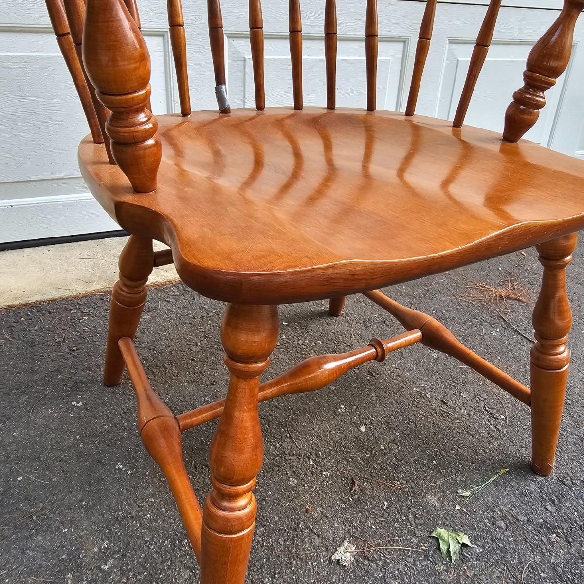 Solid wood Windsor back style chair by Tell City. Carved, decorated rungs and spindles. Chair measures 23" x 21" x 40"H with seat height of 16". Slight wear on arms and one spindle has a 'bandaid' on it. See photos for details. Local pickup only.