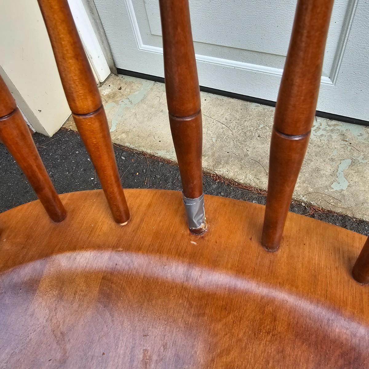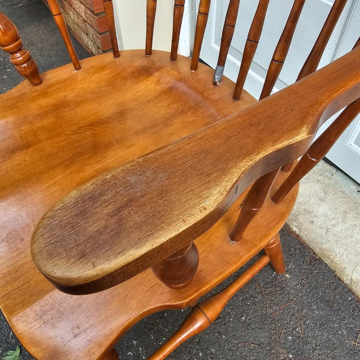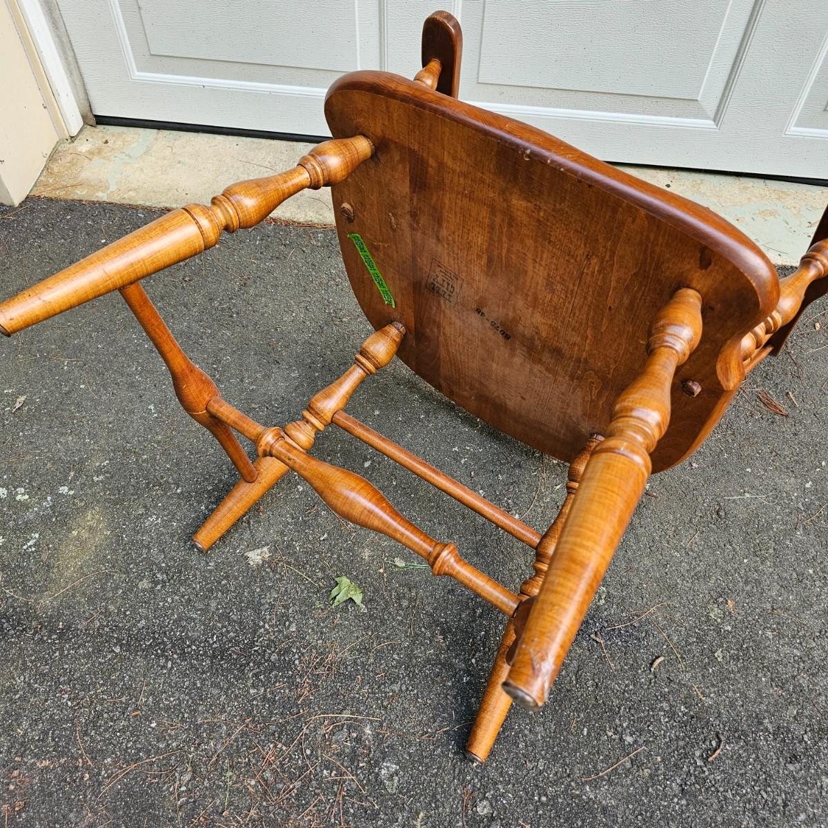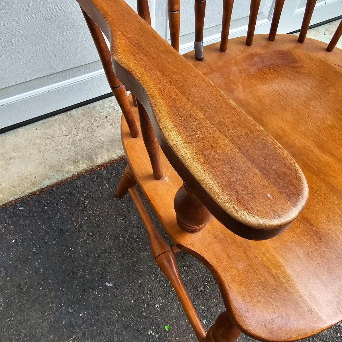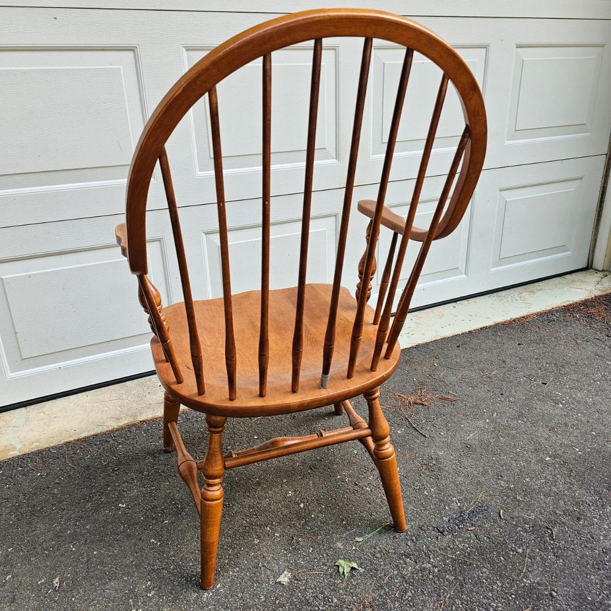 Solid wood Windsor back style chair by Tell City. Carved, decorated rungs and spindles. Chair measures 23" x 21" x 40"H with seat height of 16". Slight wear on arms and one spindle has a 'bandaid' on it. See photos for details. Local pickup only.