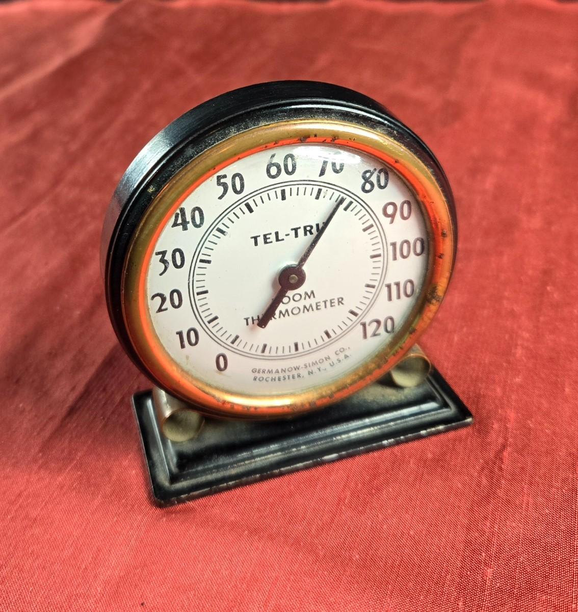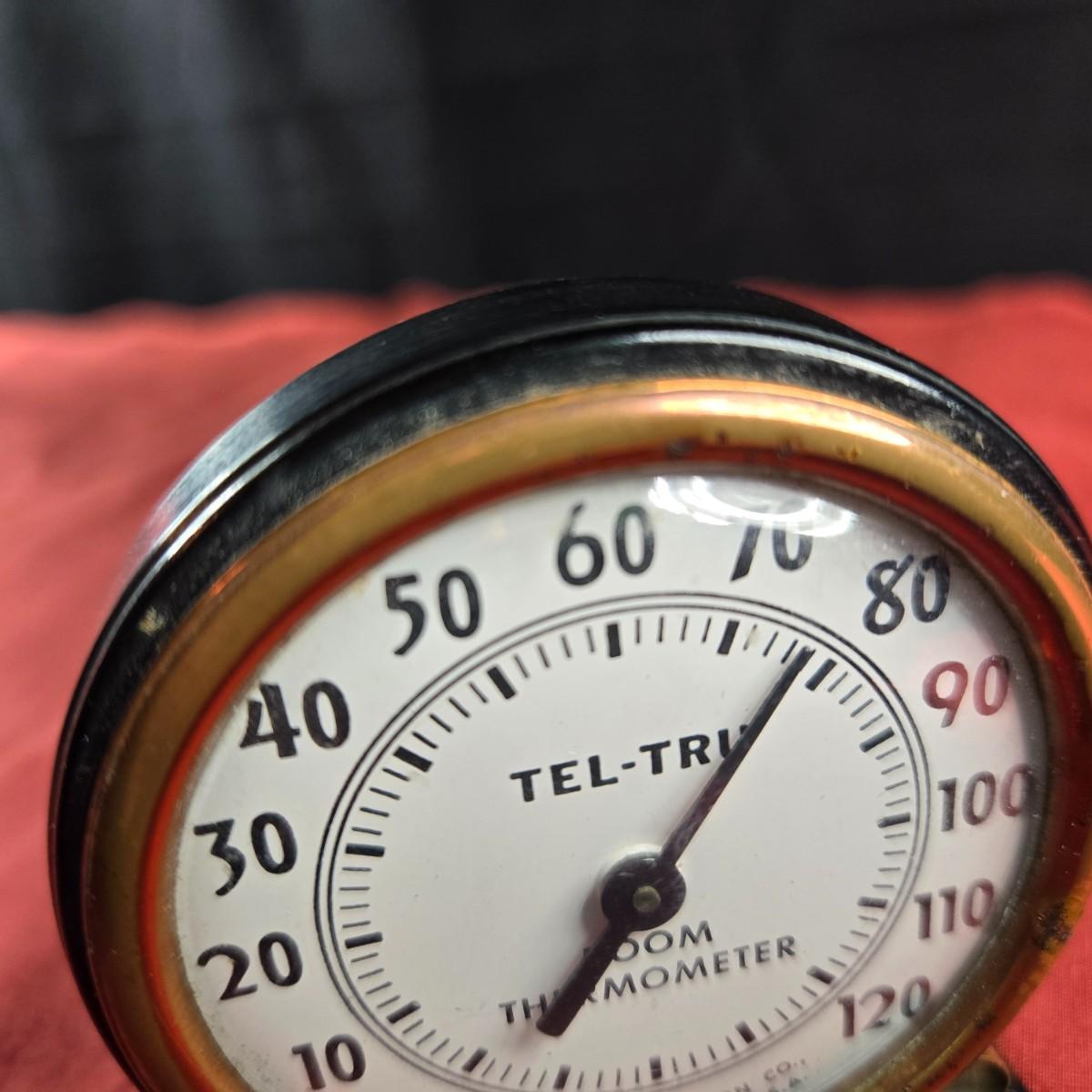 This auction lot is for a Tel-Tru Room Thermometer. This nifty and useful item is a vintage Tel-Tru Room Thermometer. It measures about 2-1/2-wide x 2-3/4-inches tall. Works great! Condition is consistent with age and use.