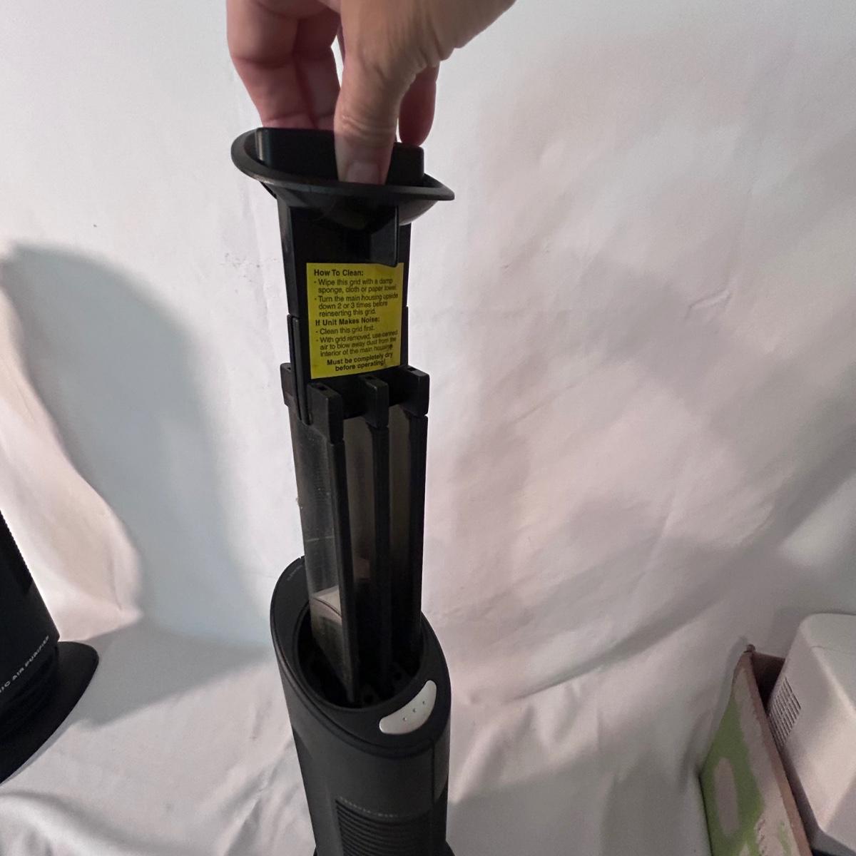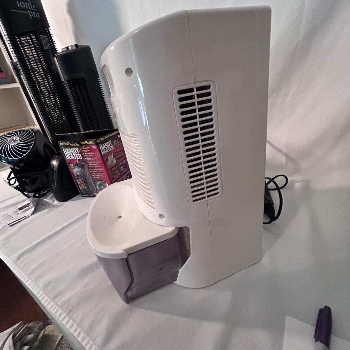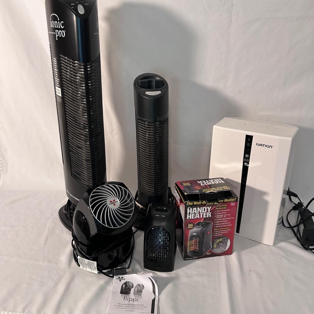 Five electronic air purifiers, fans, heater and dehumidifier all powered on when tested. The two air purifiers need a good cleaning and the tallest stands 27.5” tall. The heater is a small outlet based piece and the fan is desk size with multi angle. The dehumidifier is a smaller version of the normal size measuring 9”x7”x14”. Local pick up only.