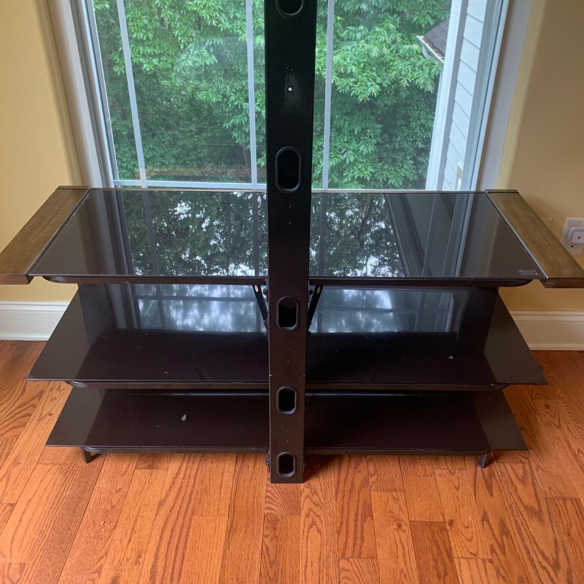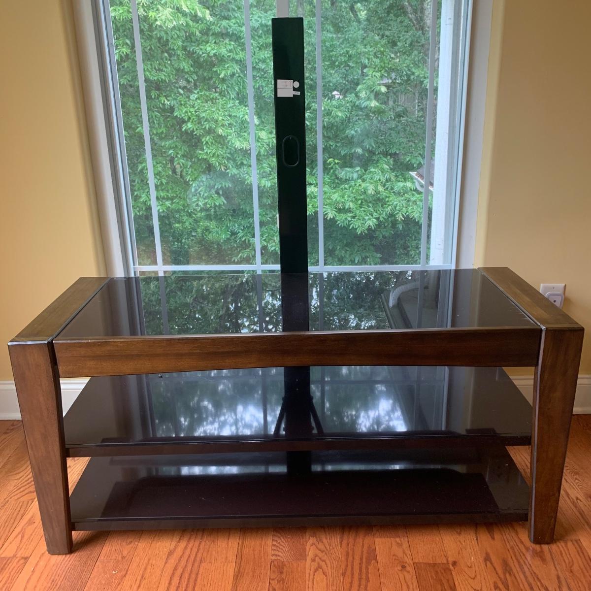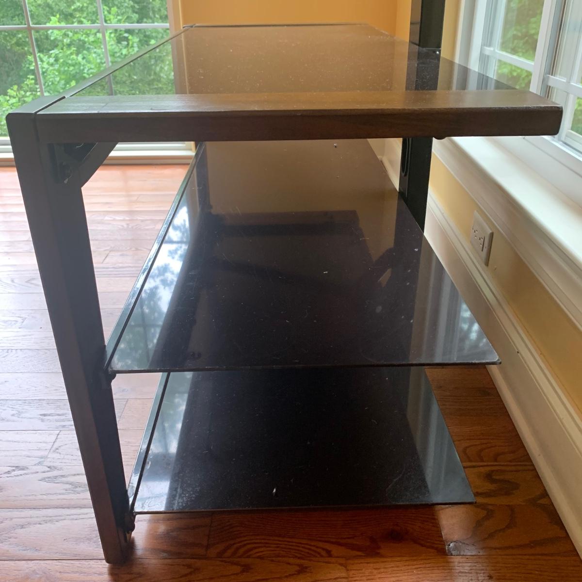 Tempered glass and wood TV stand with three shelves. Unit appears to be adjustable and measures, 48” x 18.5” x 48”H. Please note minor blemishes, see photos for more details. Local pickup only. Winning bidder must bring assistance to help move and load this item due to its weight and/or size.