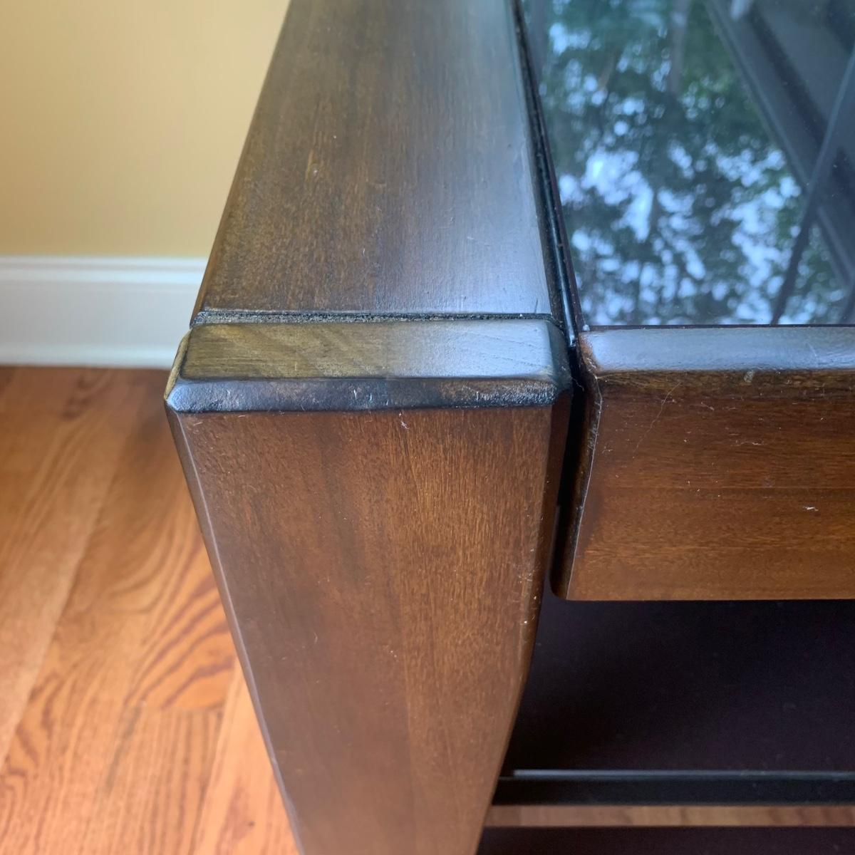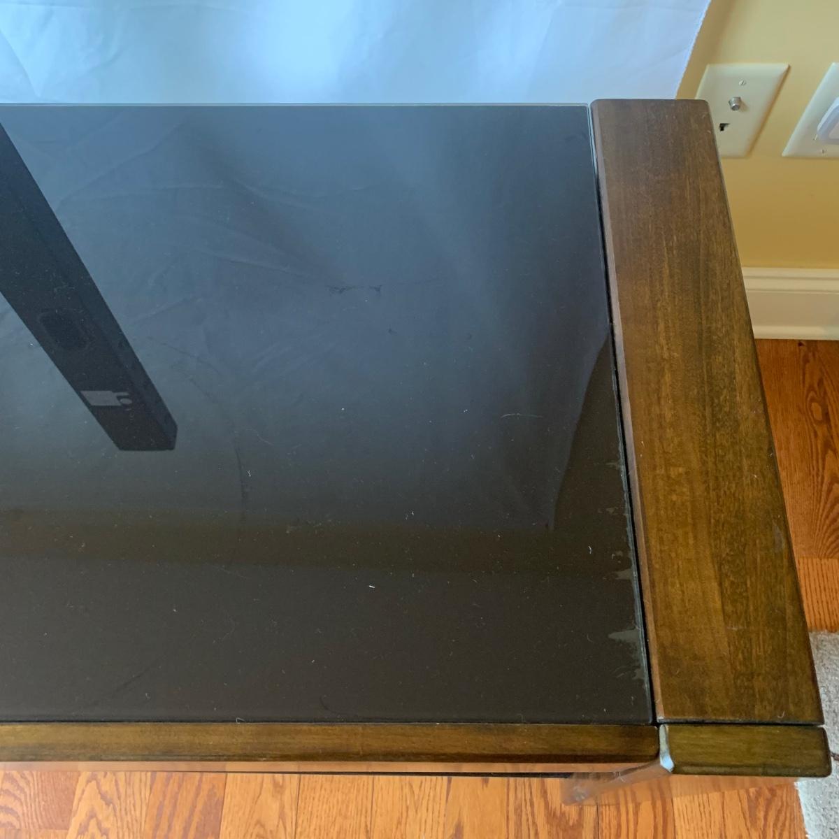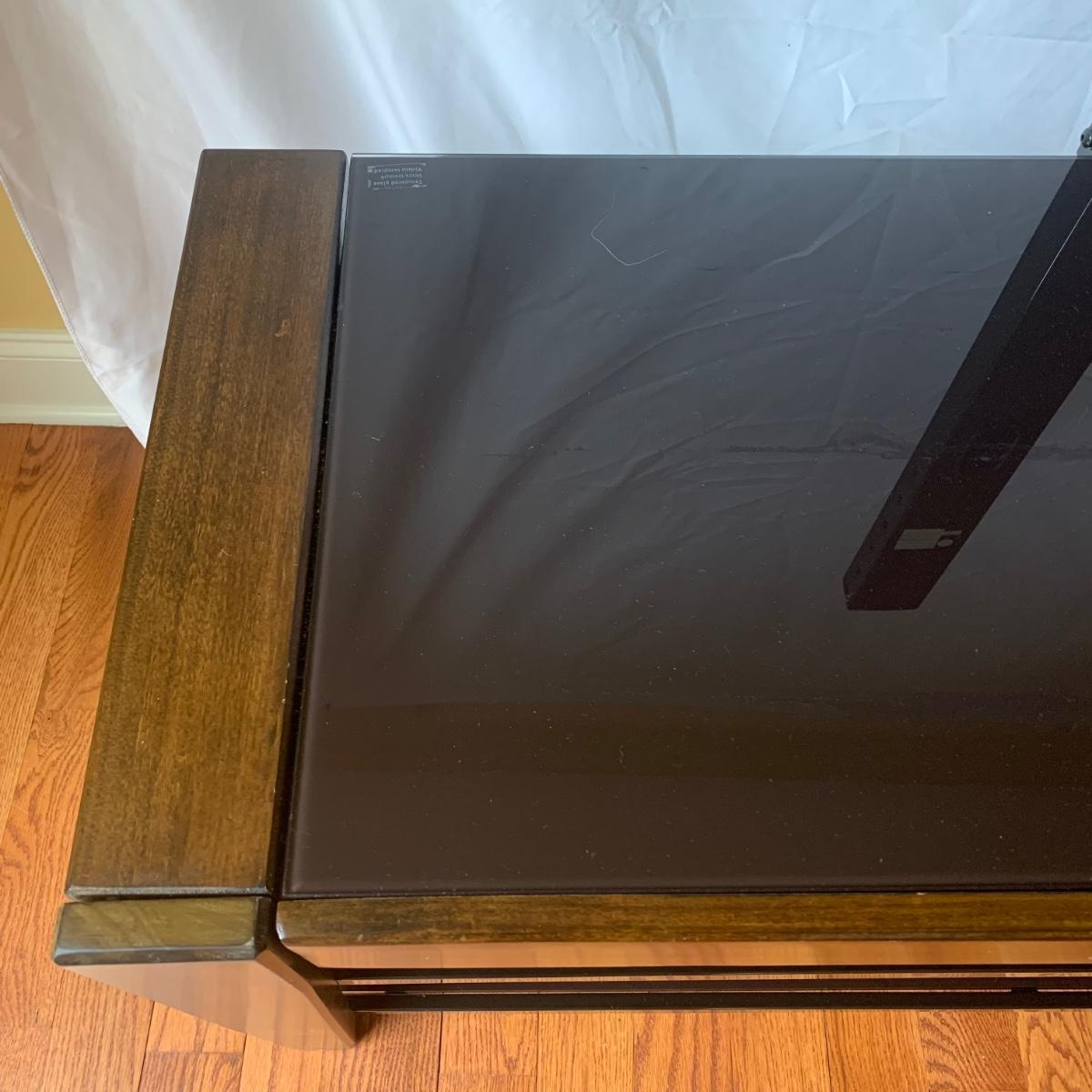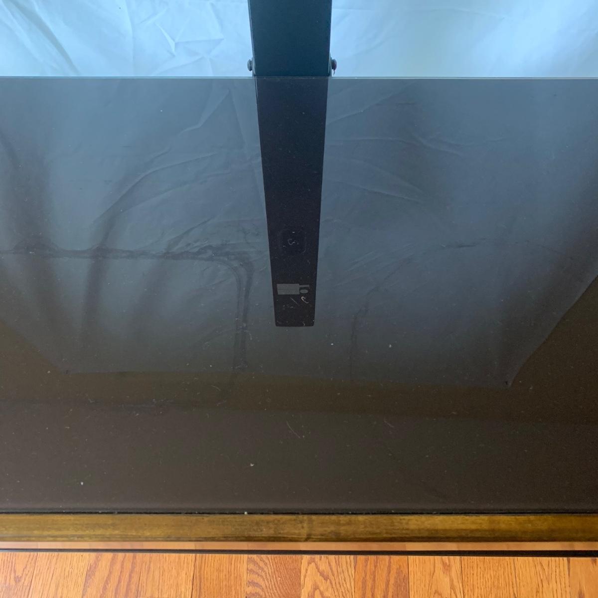Tempered glass and wood TV stand with three shelves. Unit appears to be adjustable and measures, 48” x 18.5” x 48”H. Please note minor blemishes, see photos for more details. Local pickup only. Winning bidder must bring assistance to help move and load this item due to its weight and/or size.