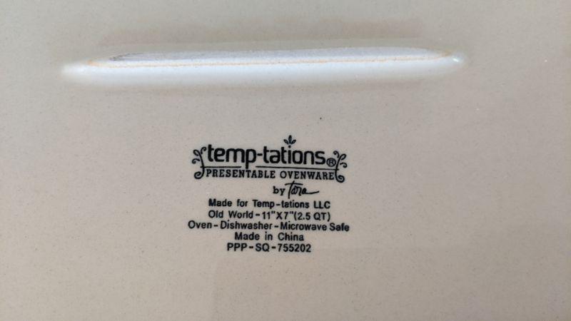 Lot #199 Temptations bakeware Old World Green rectangle 2.5 qt casserole w/plastic lid and wire caddy