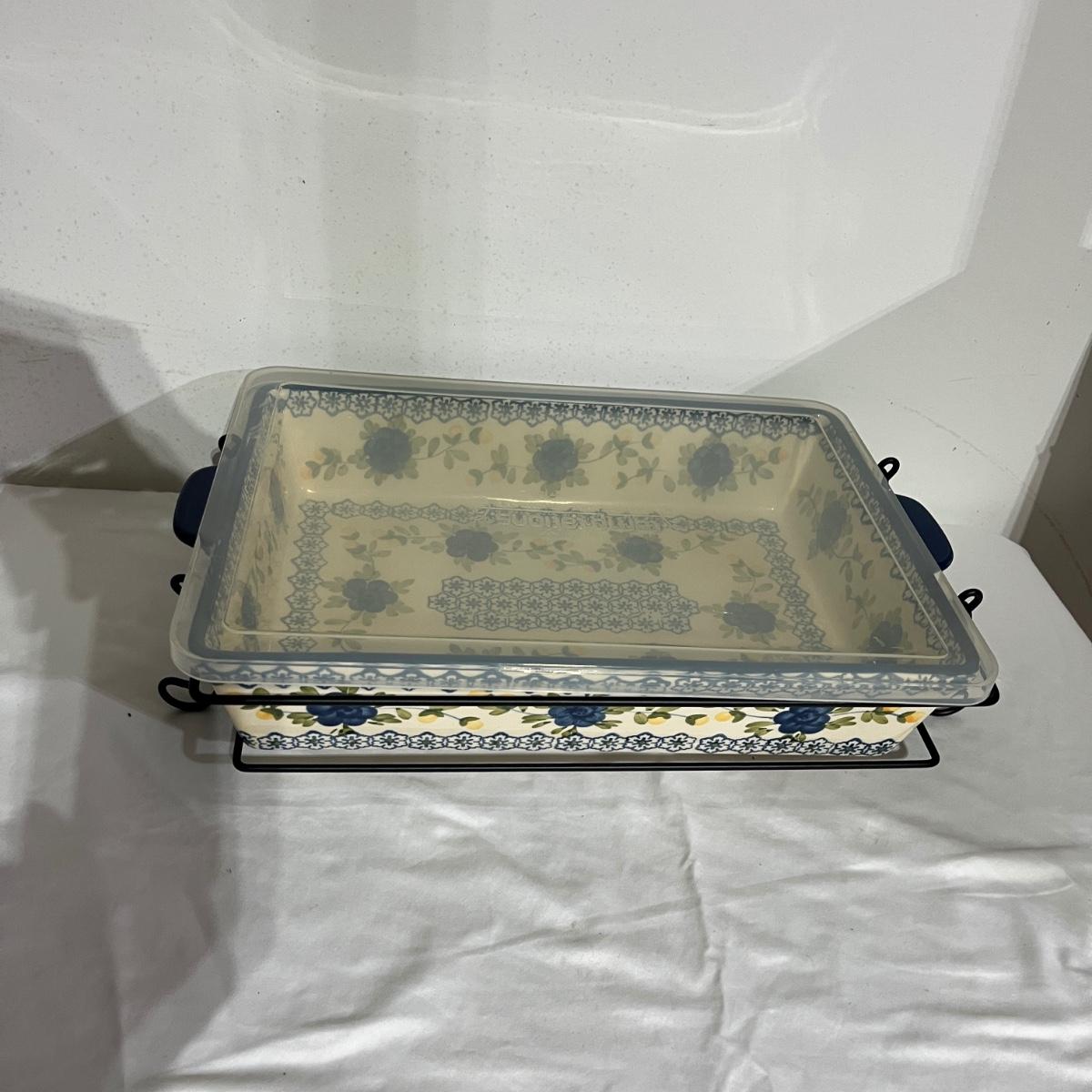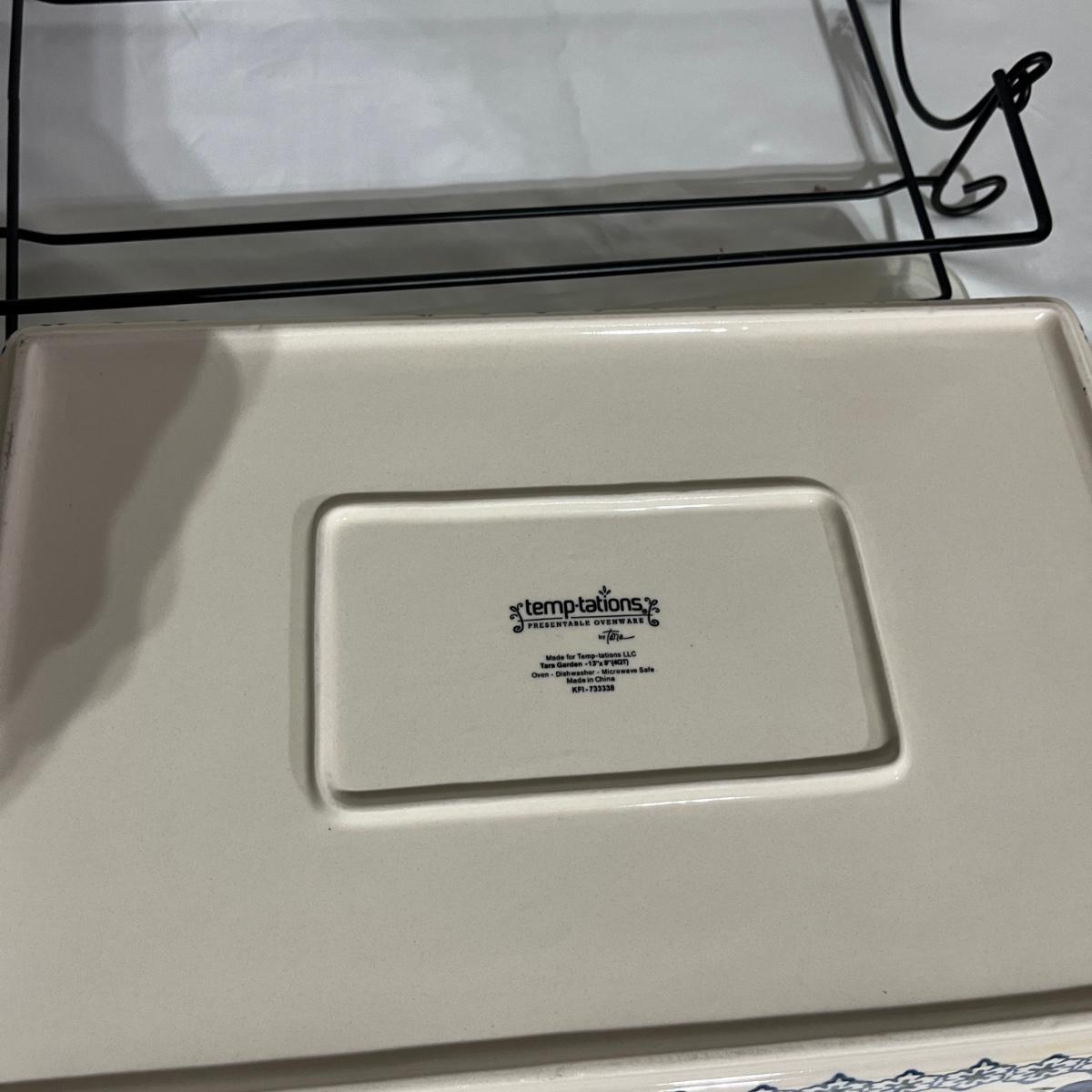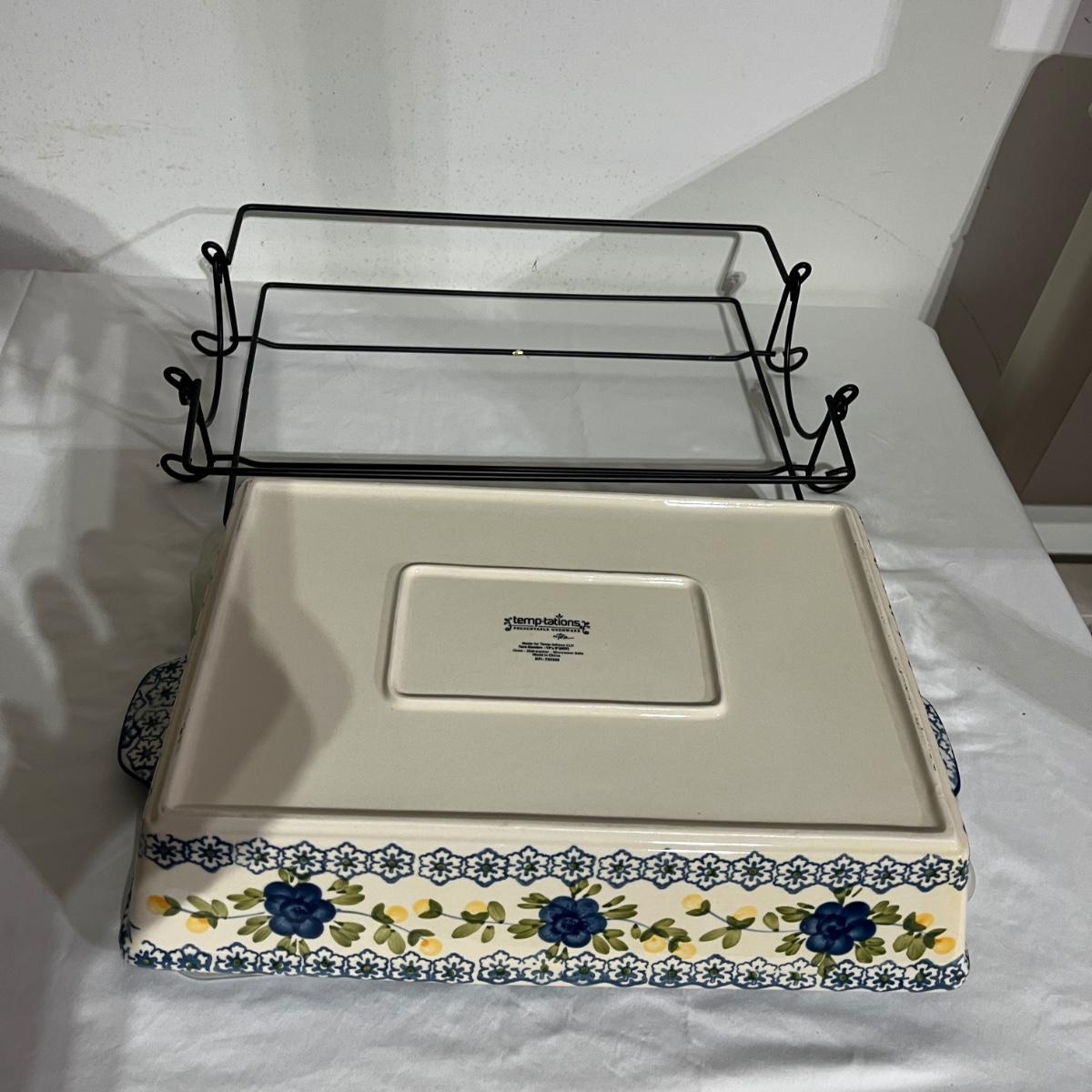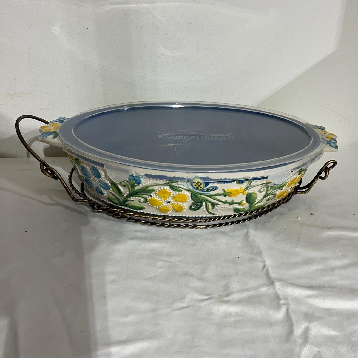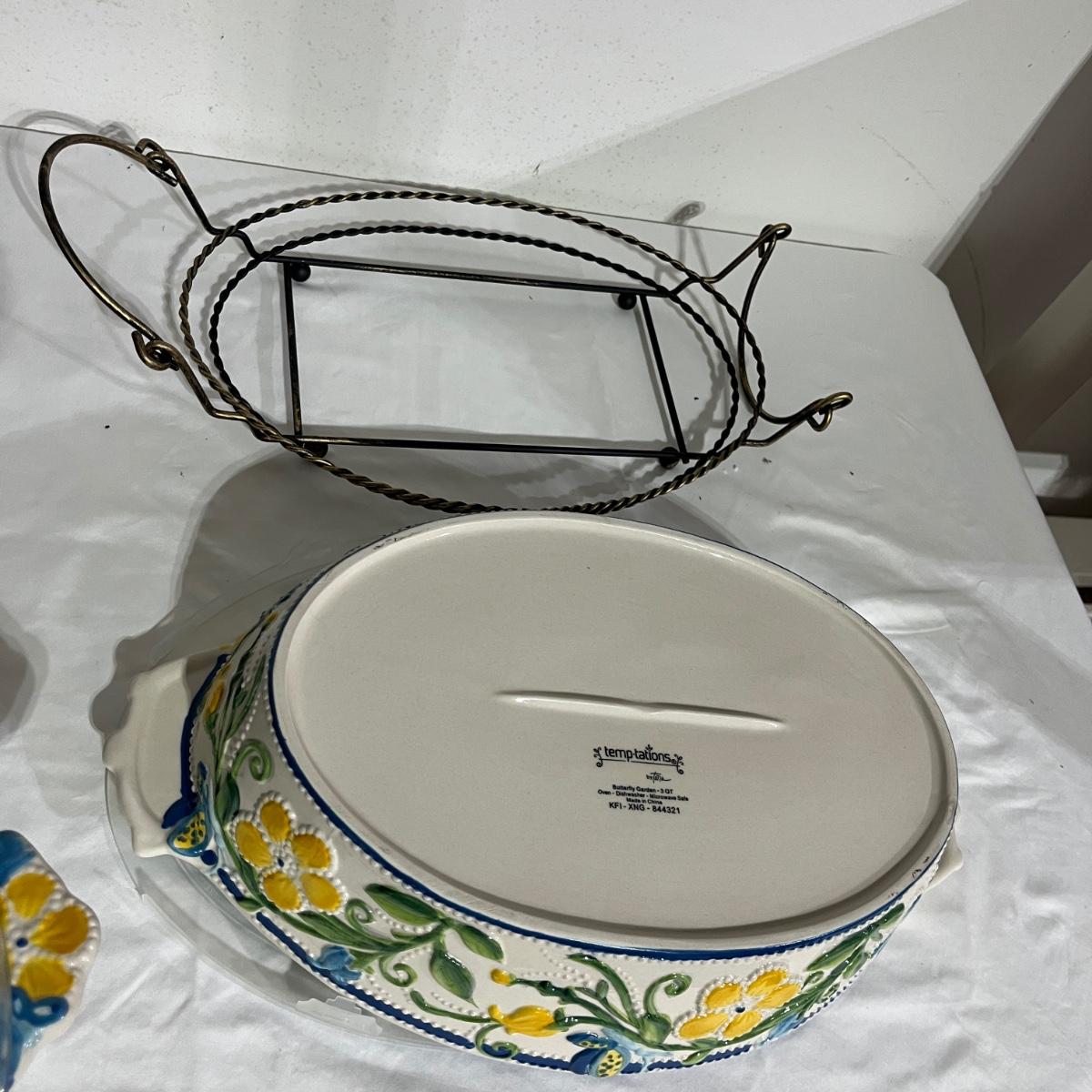 Lot includes one rectangular and one oval ceramic casserole dish with metal stands and plastic lids, two ceramic serving platters, two ceramic bowls with plastic lids and ceramic bread dish with carrier with all these items being Temp-Tations. Also includes two ceramic egg dishes and a ceramic teapot. Rectangular casserole dish with stand measures 16” x 10” x 3.5”H.