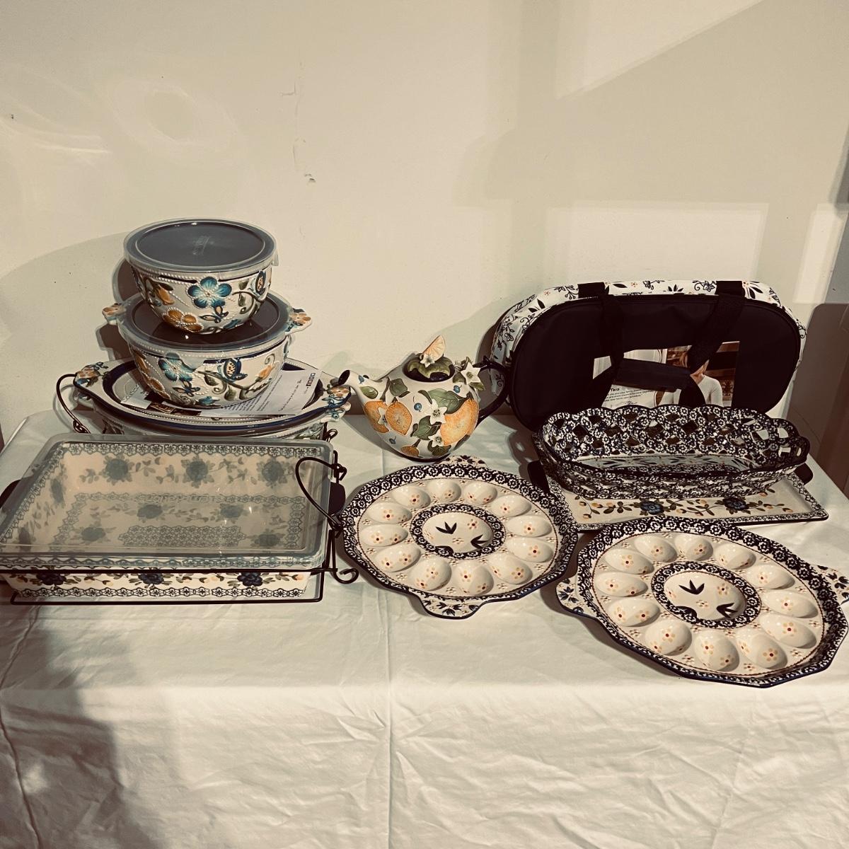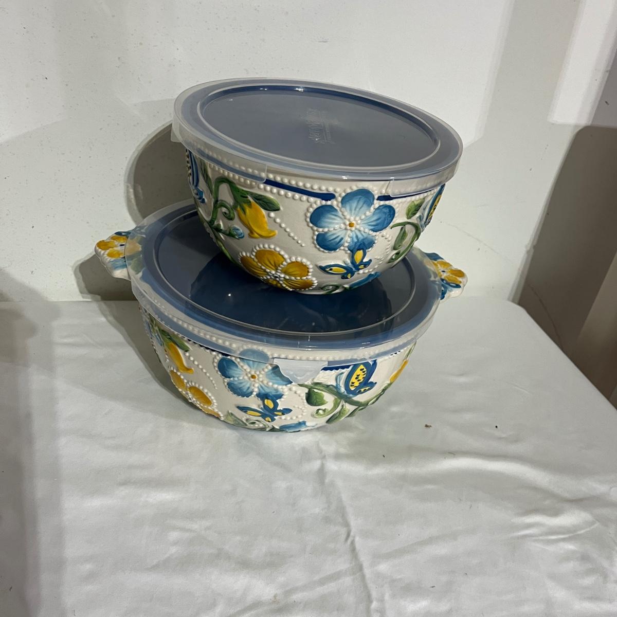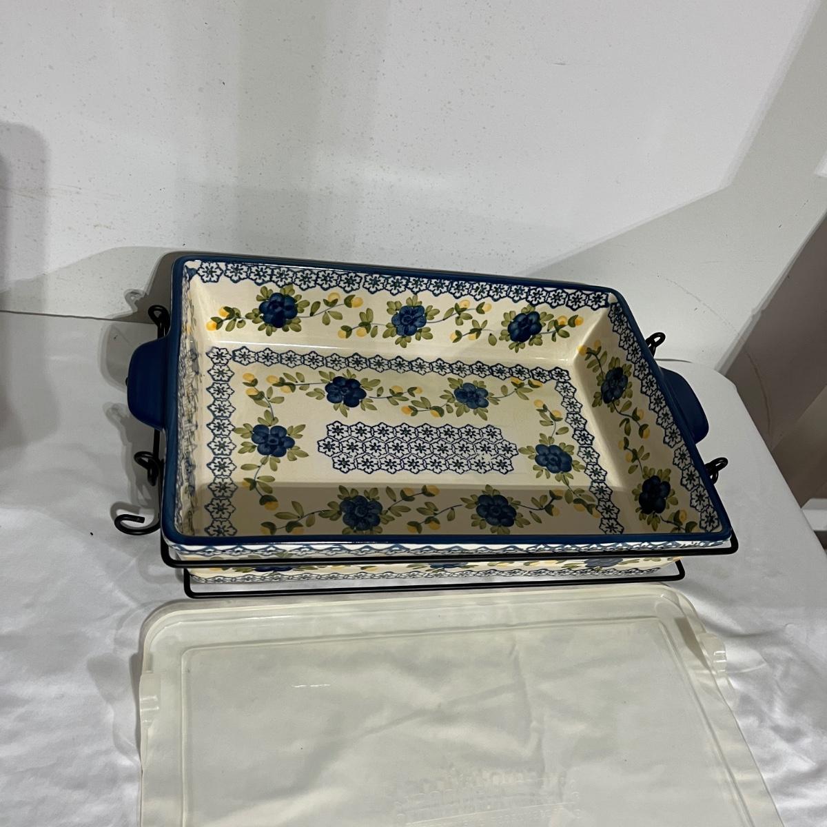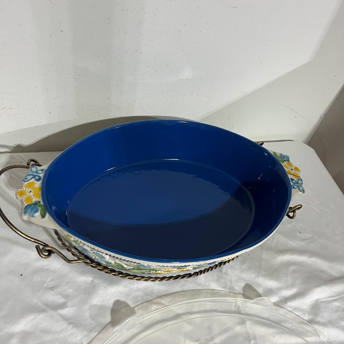 Lot includes one rectangular and one oval ceramic casserole dish with metal stands and plastic lids, two ceramic serving platters, two ceramic bowls with plastic lids and ceramic bread dish with carrier with all these items being Temp-Tations. Also includes two ceramic egg dishes and a ceramic teapot. Rectangular casserole dish with stand measures 16” x 10” x 3.5”H.