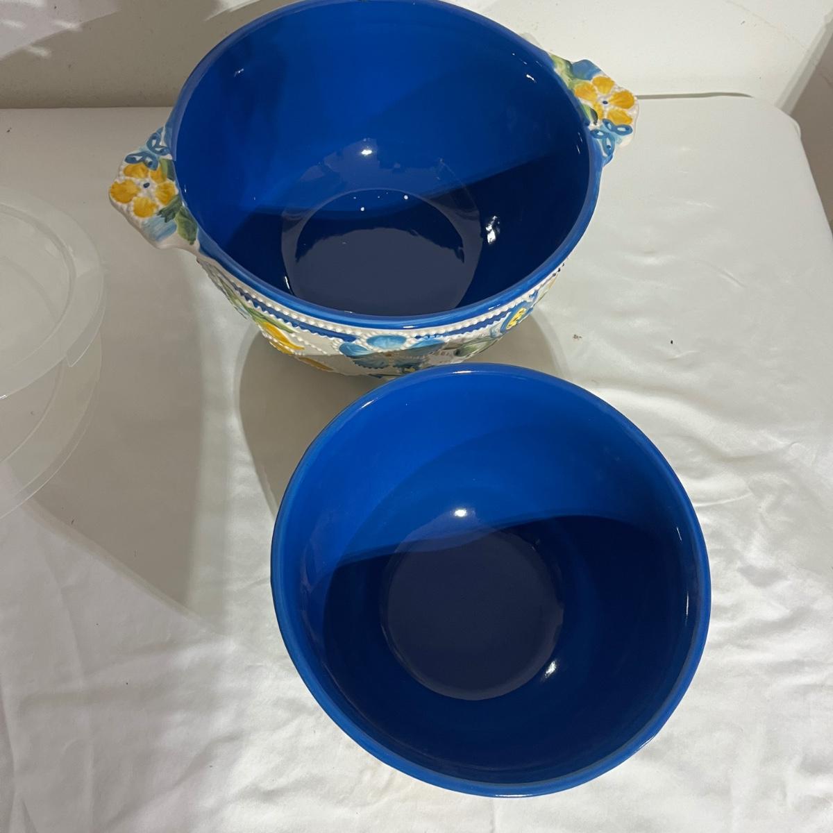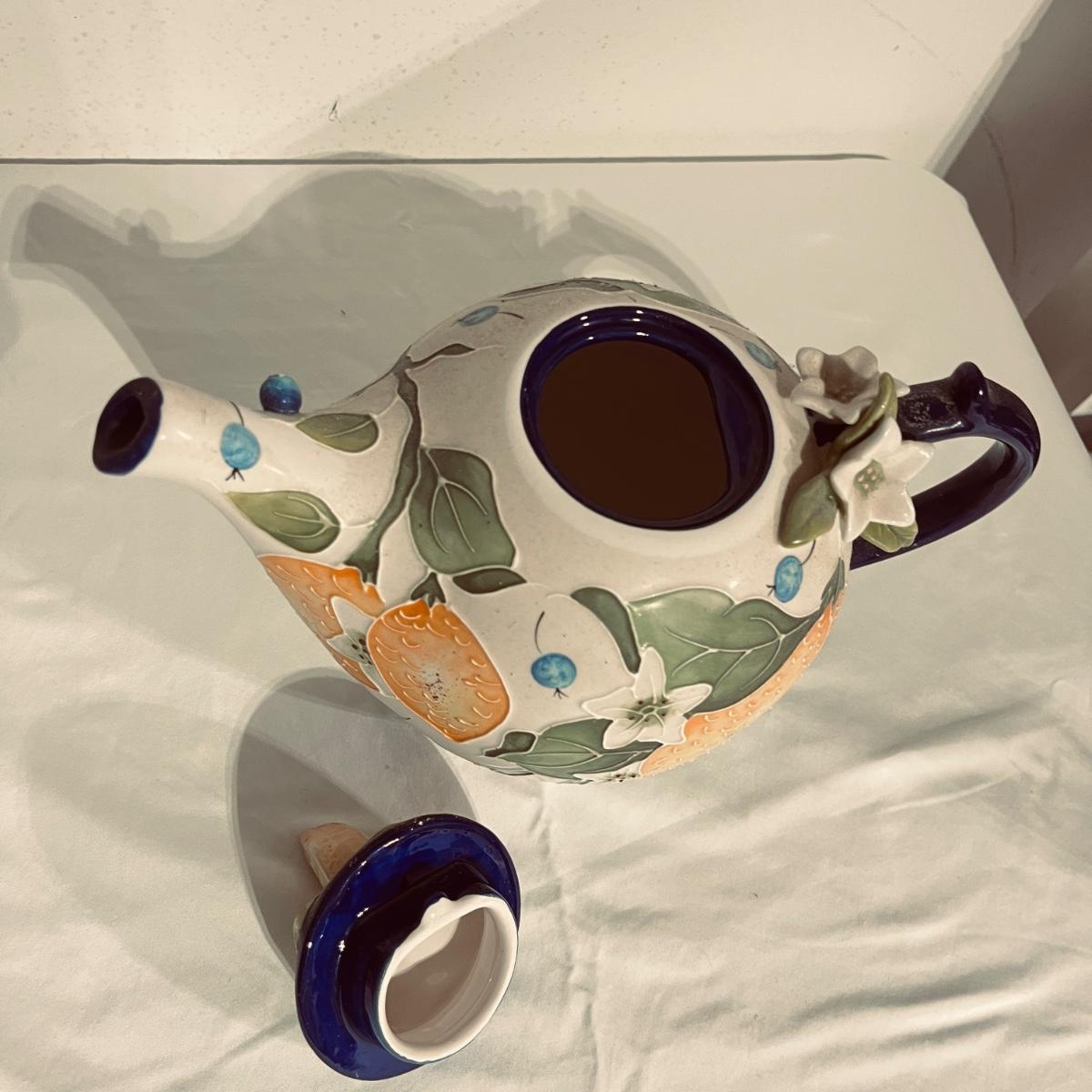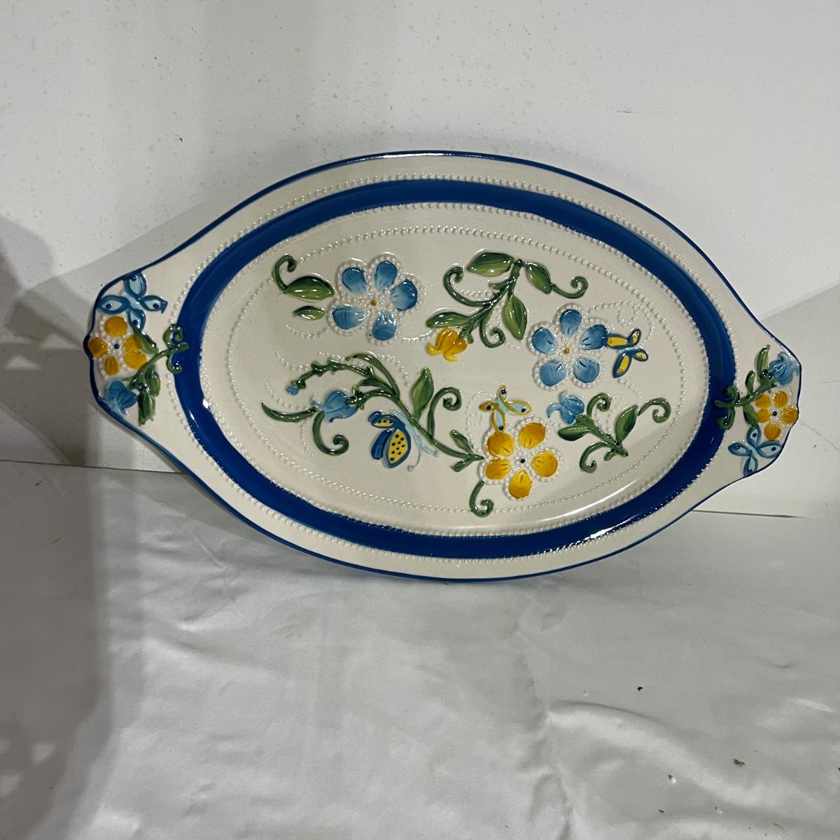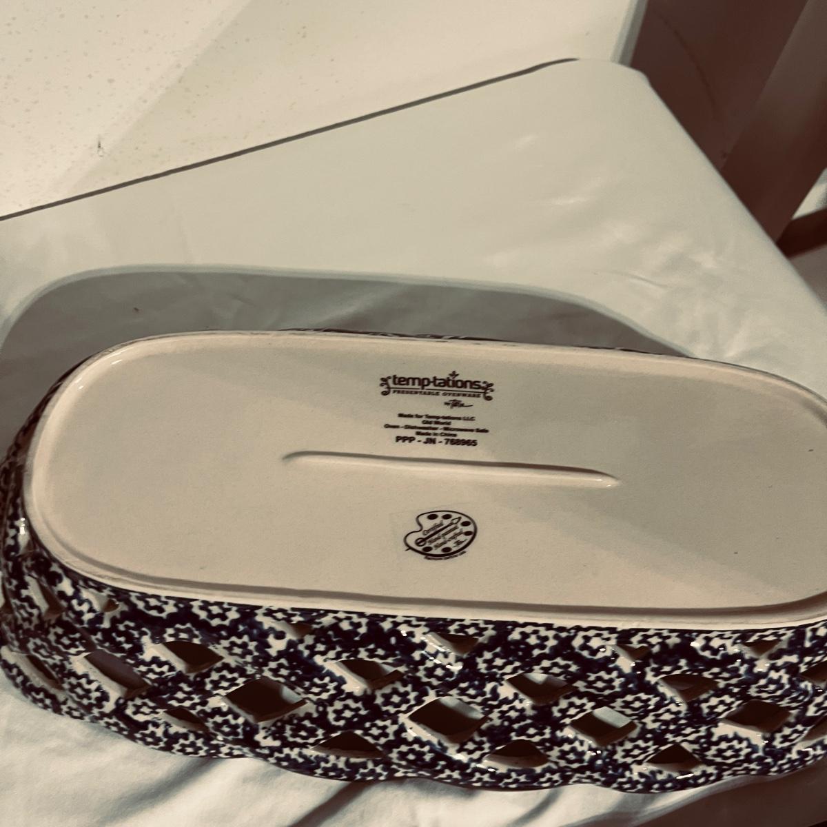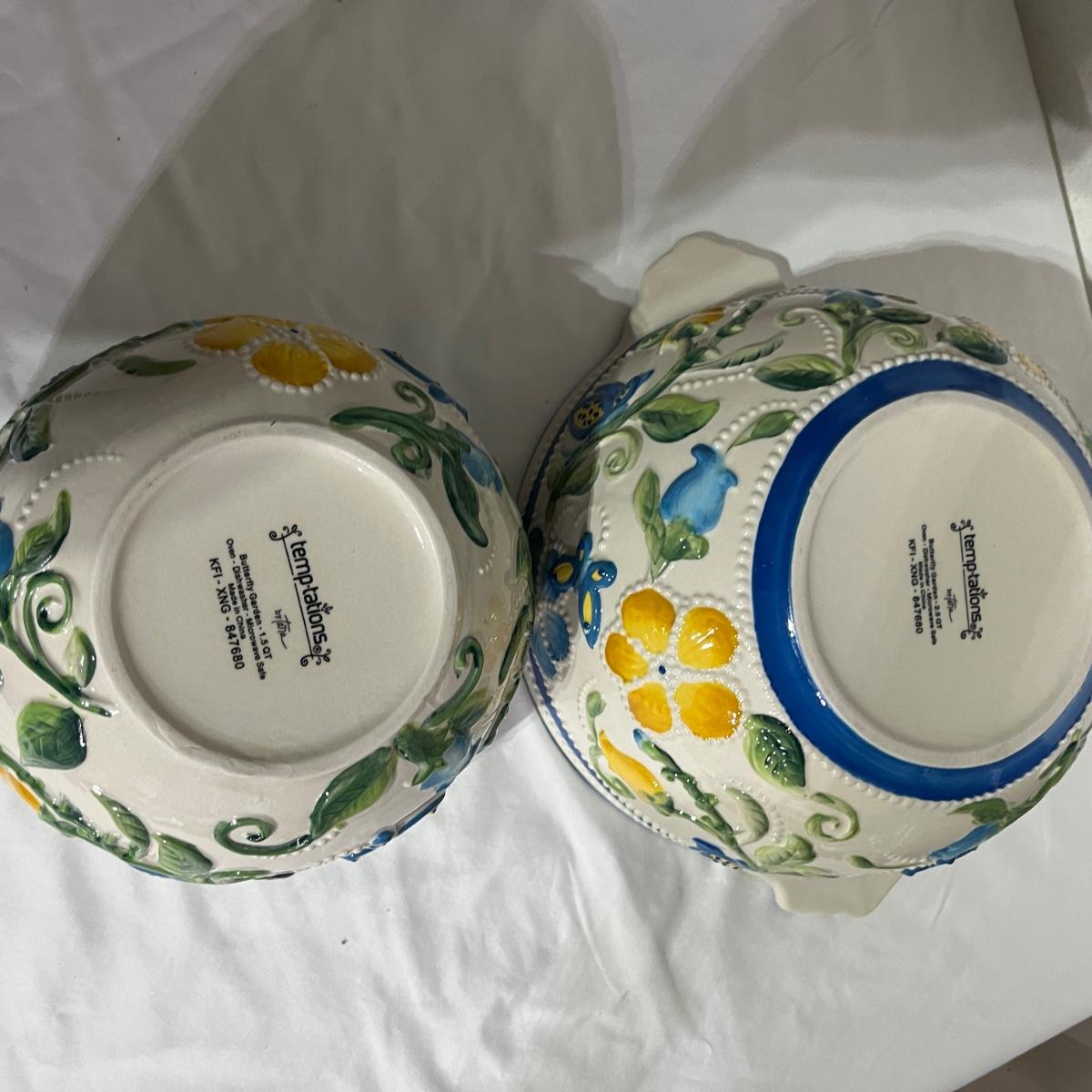 Lot includes one rectangular and one oval ceramic casserole dish with metal stands and plastic lids, two ceramic serving platters, two ceramic bowls with plastic lids and ceramic bread dish with carrier with all these items being Temp-Tations. Also includes two ceramic egg dishes and a ceramic teapot. Rectangular casserole dish with stand measures 16” x 10” x 3.5”H.