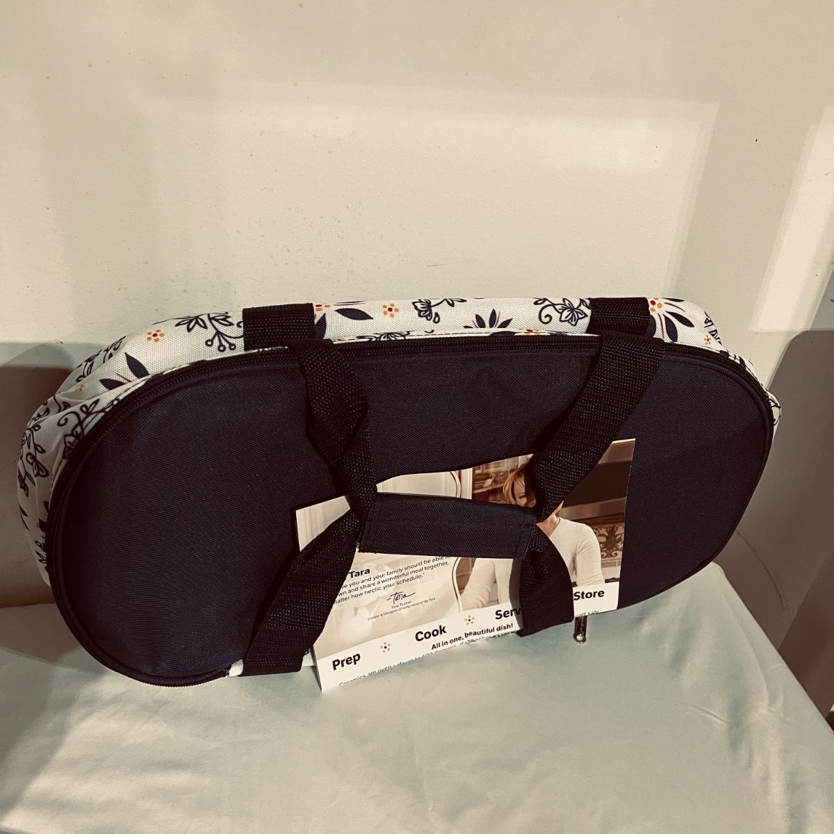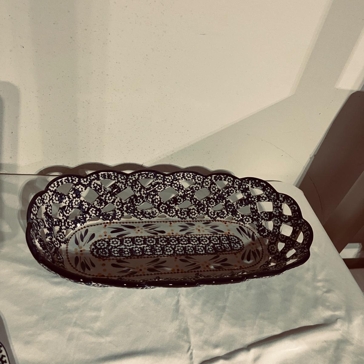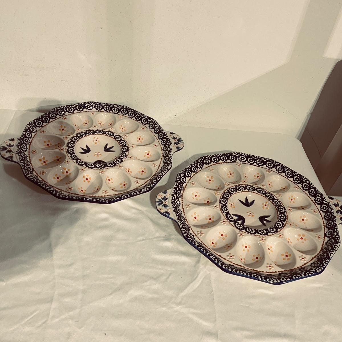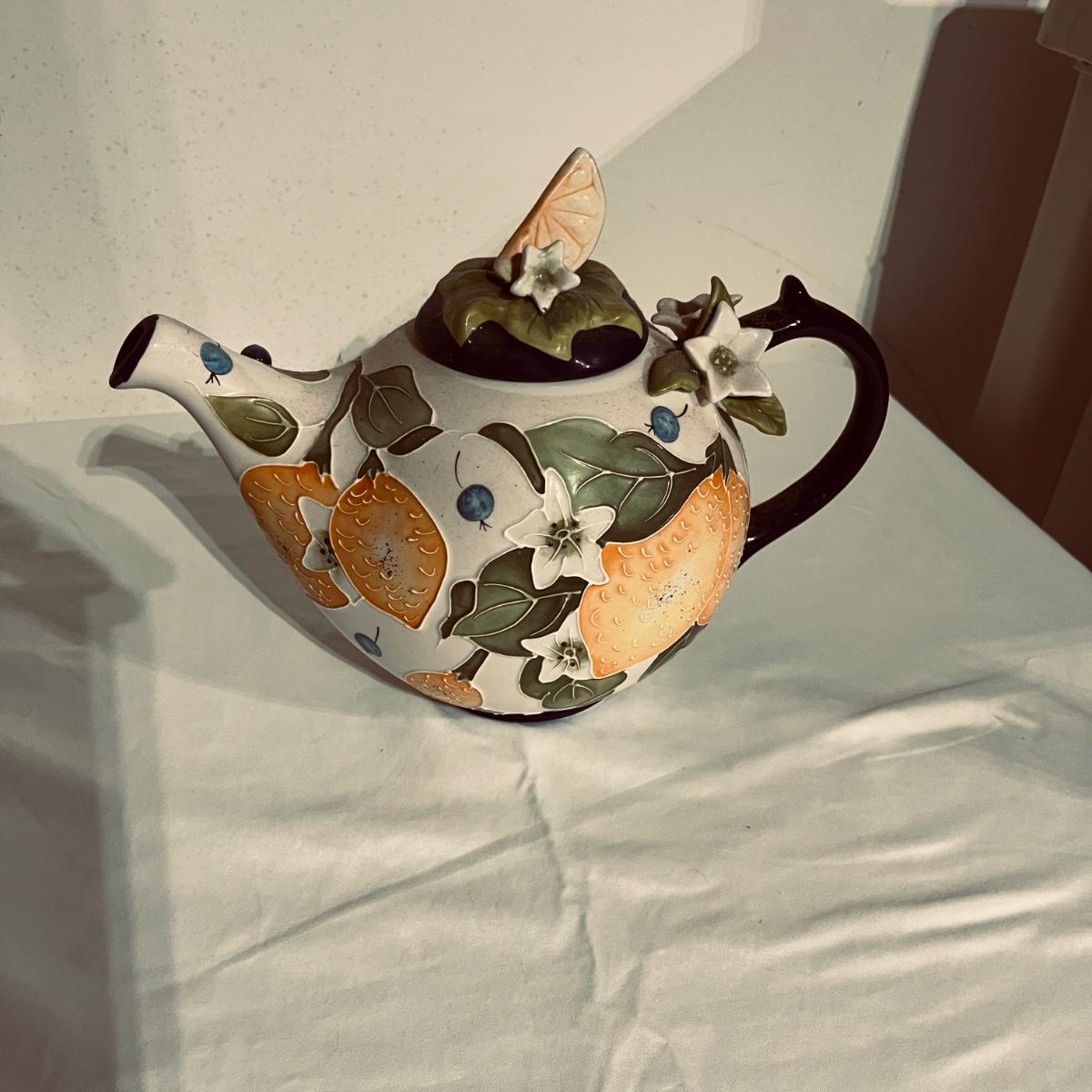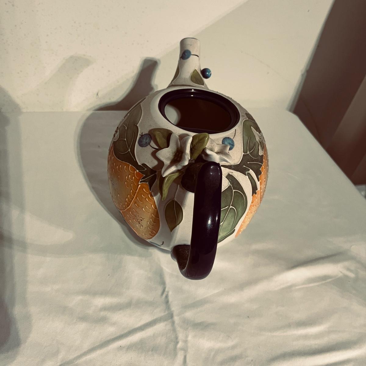 Lot includes one rectangular and one oval ceramic casserole dish with metal stands and plastic lids, two ceramic serving platters, two ceramic bowls with plastic lids and ceramic bread dish with carrier with all these items being Temp-Tations. Also includes two ceramic egg dishes and a ceramic teapot. Rectangular casserole dish with stand measures 16” x 10” x 3.5”H.