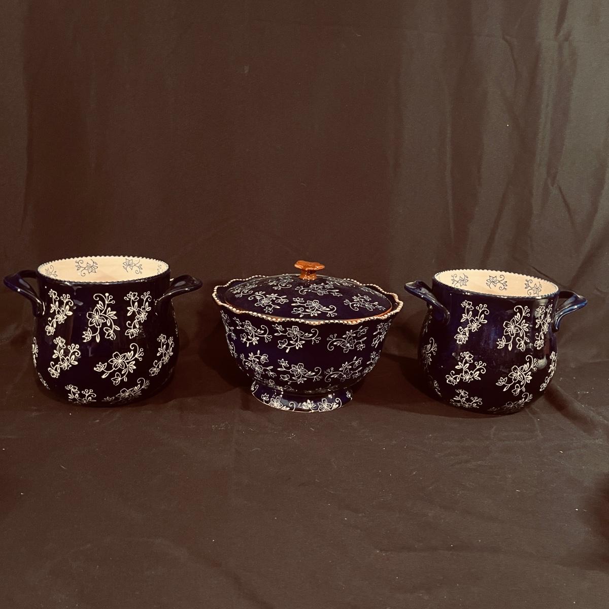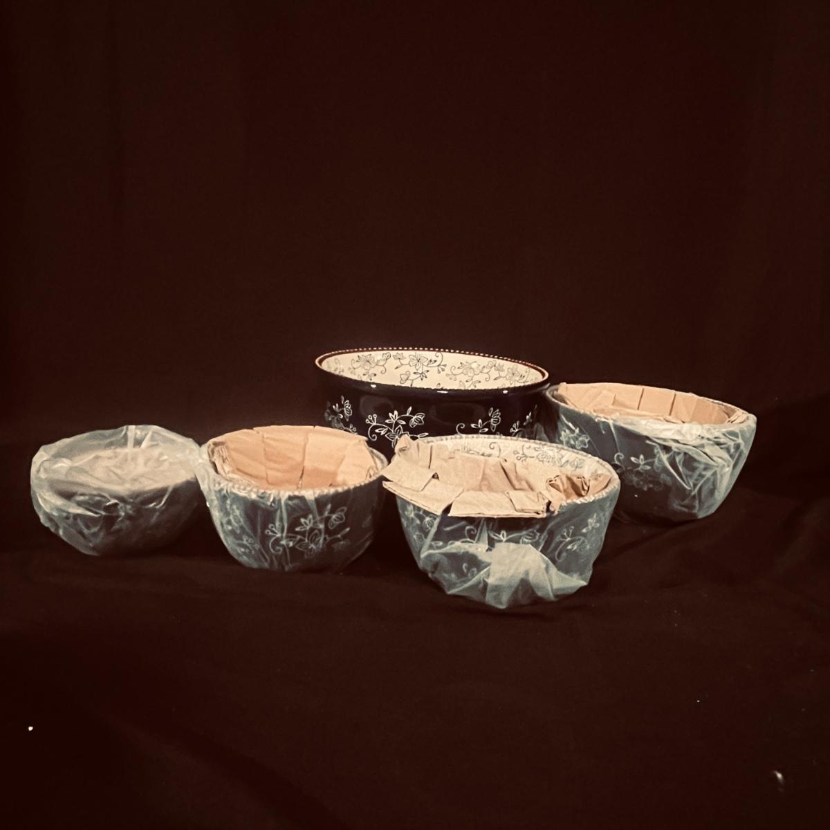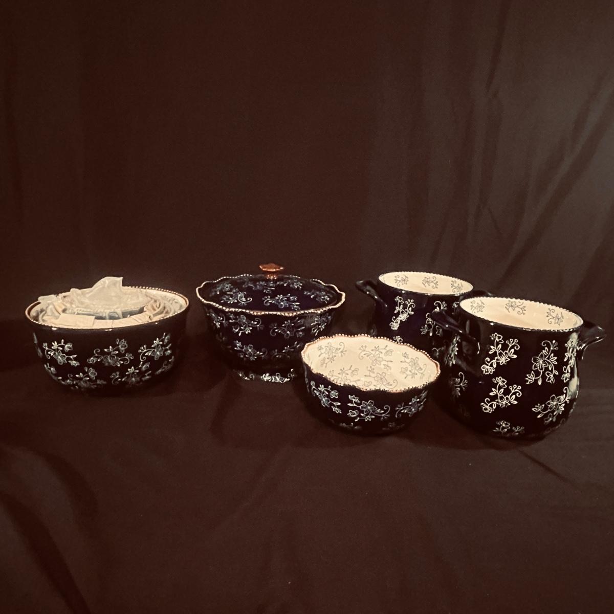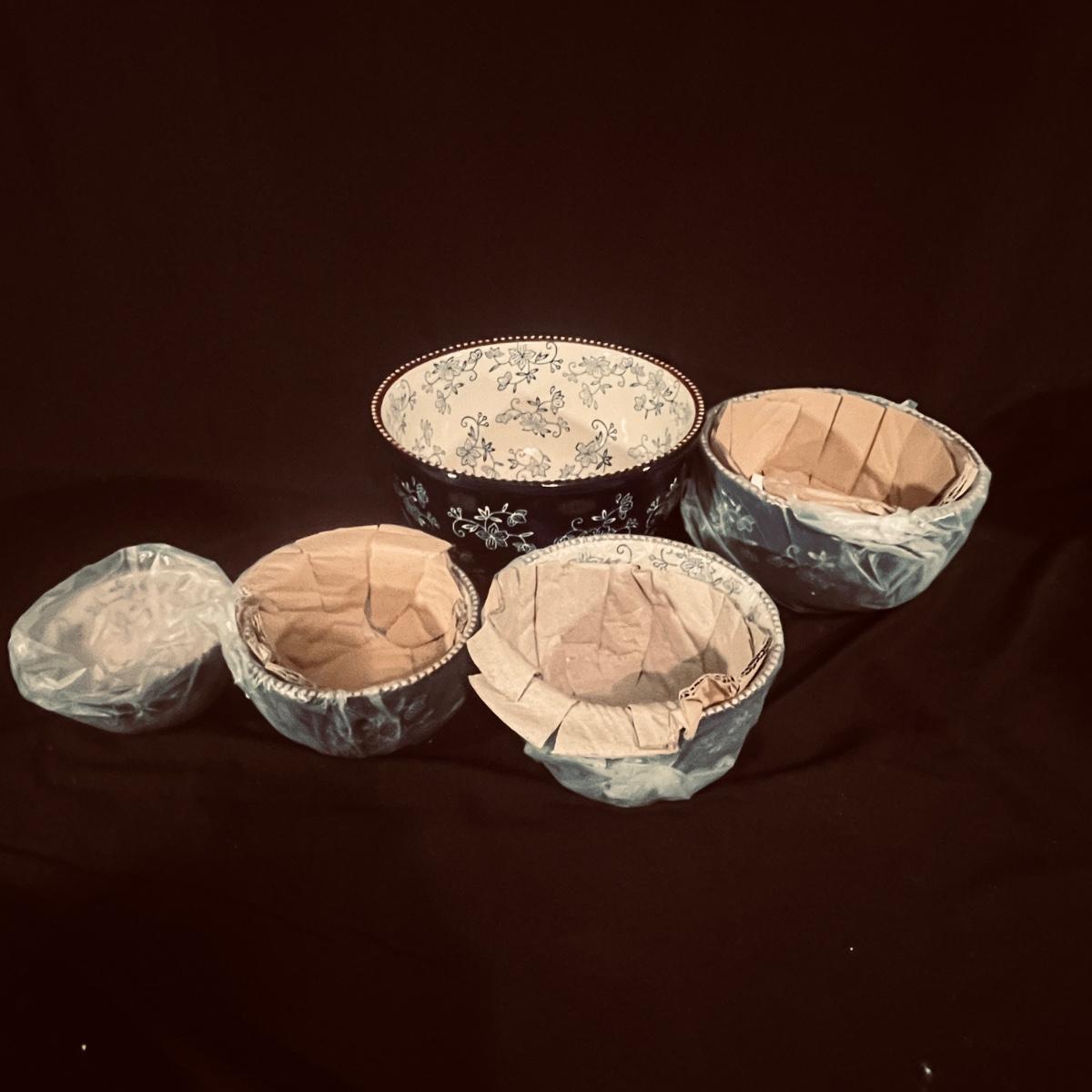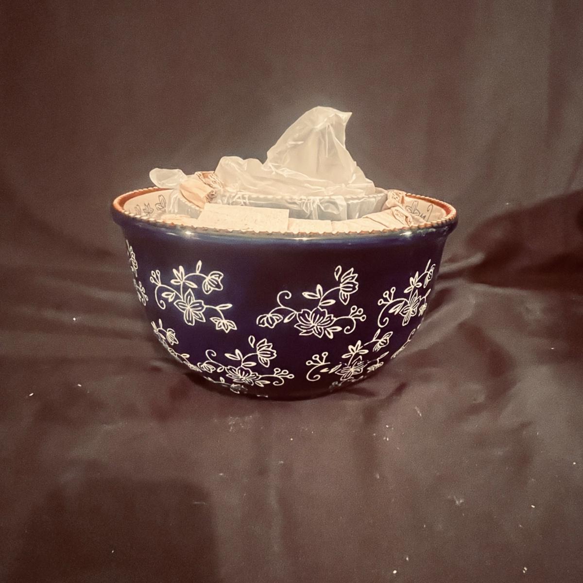 Lot includes five nesting bowls with plastic lids, one lidded and footed bowl, smaller bowl and two utensil crocks, all by Temp-Tations. Largest bowl measures 11”D x 8”H. The nesting bowls are still wrapped in plastic. Shipping available.