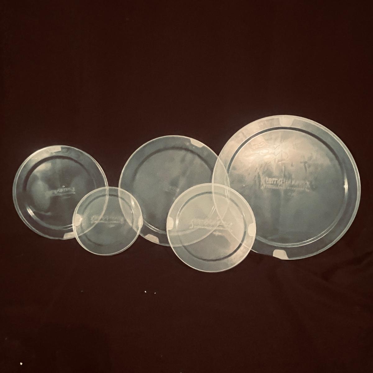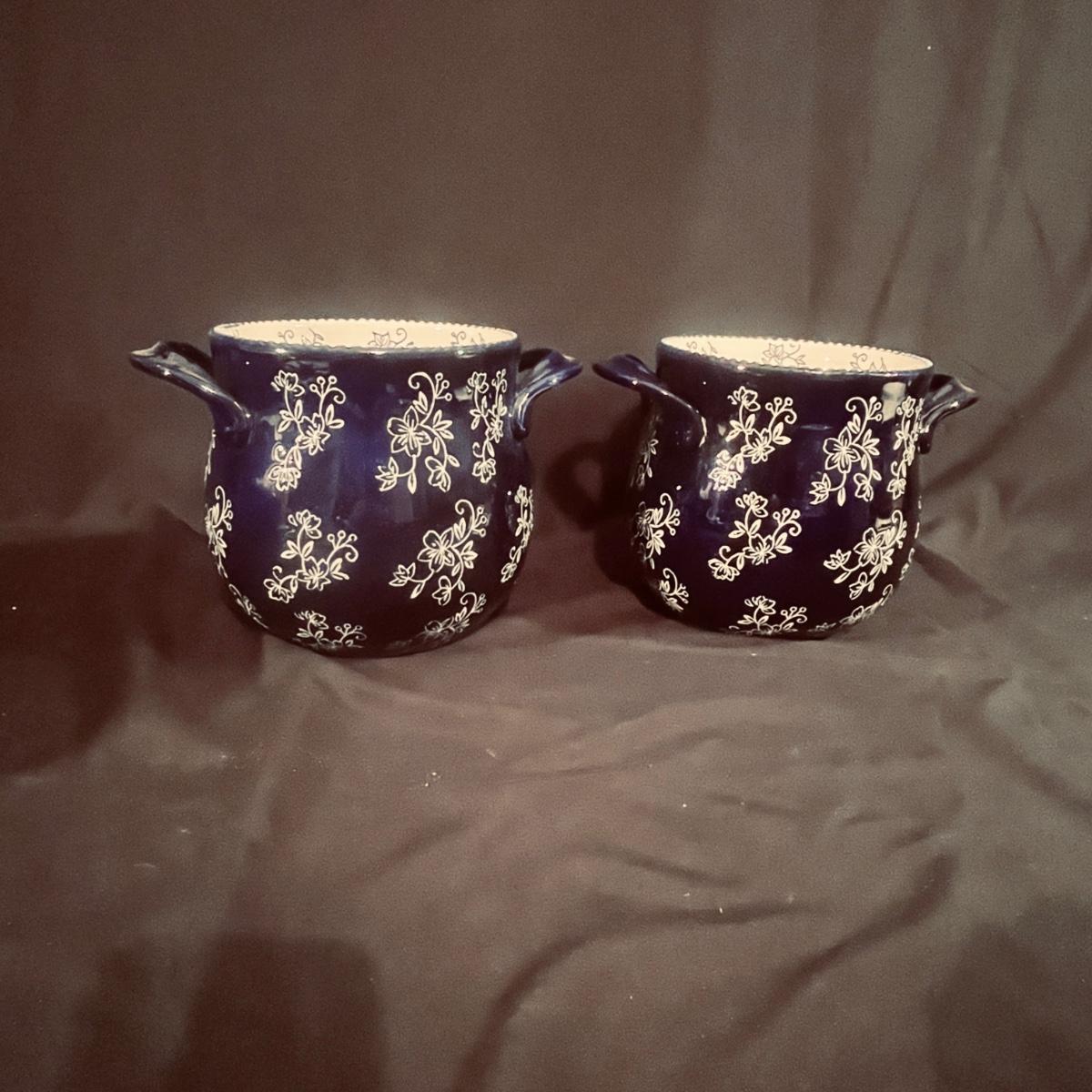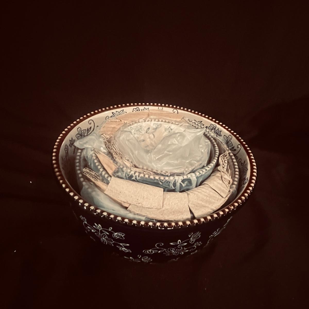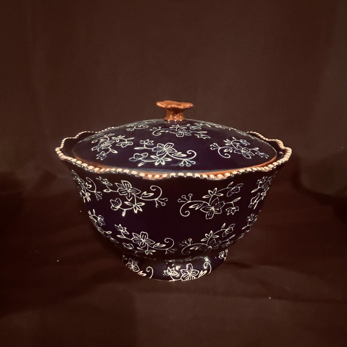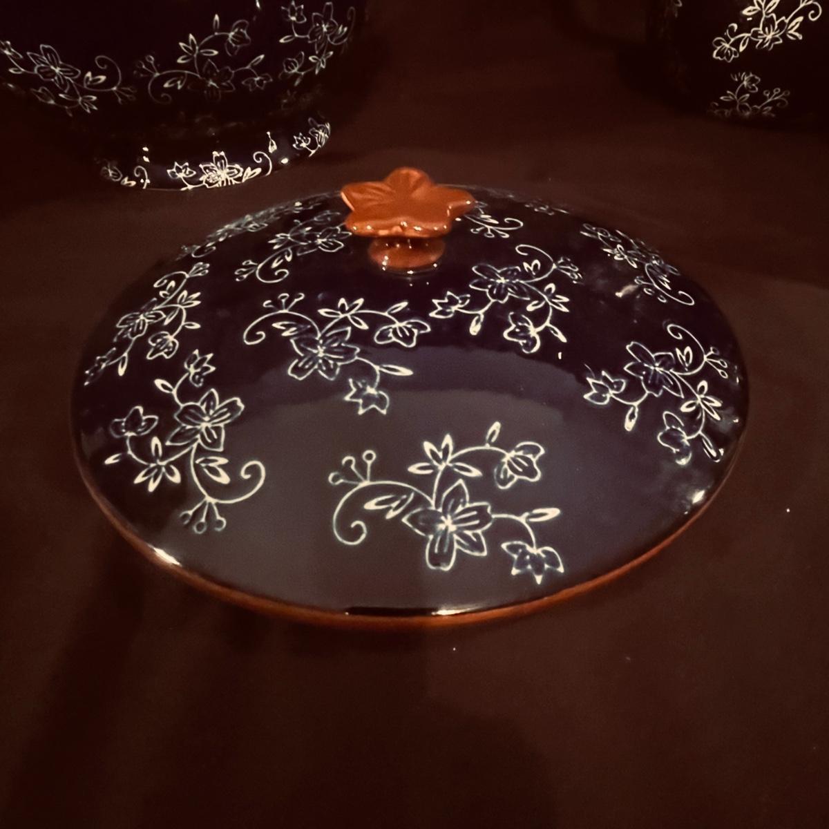 Lot includes five nesting bowls with plastic lids, one lidded and footed bowl, smaller bowl and two utensil crocks, all by Temp-Tations. Largest bowl measures 11”D x 8”H. The nesting bowls are still wrapped in plastic. Shipping available.