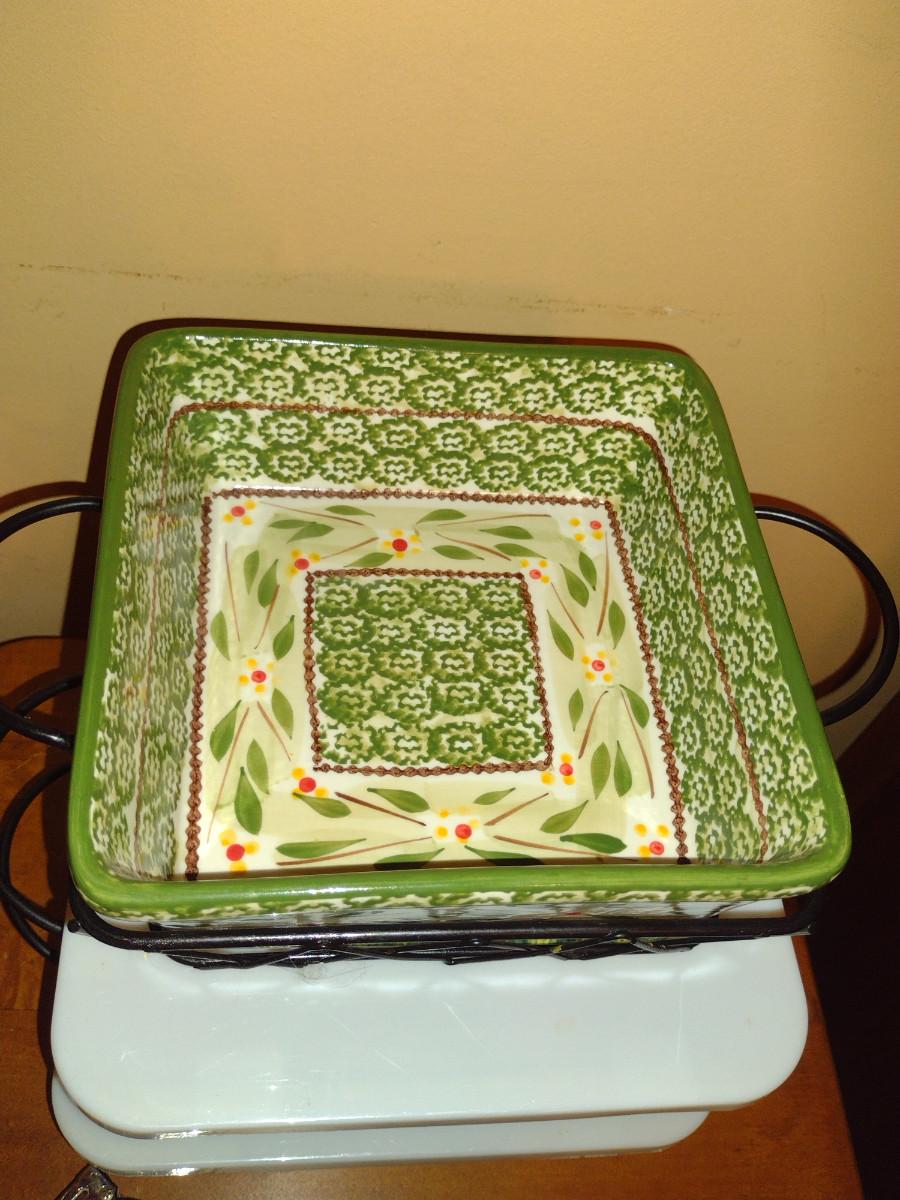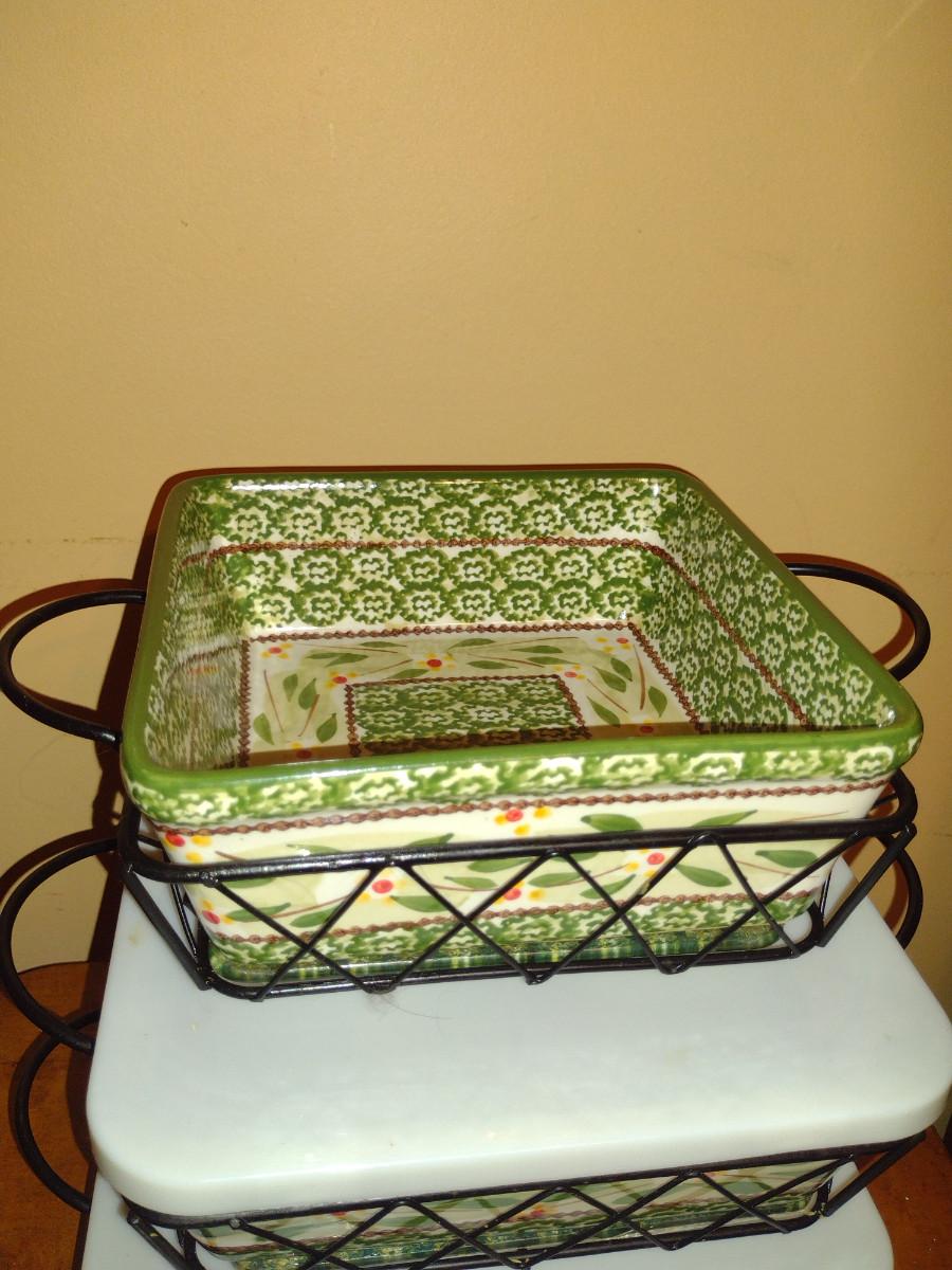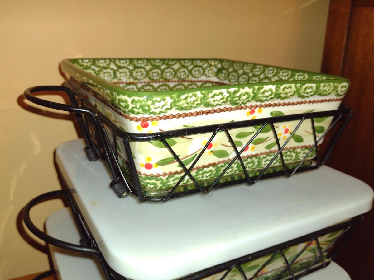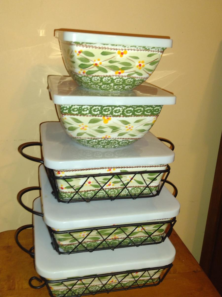 Temp-tations Covered Bowls and Casserole Dishes. Two bowls. Three casseroles with metal carriers and glass trivets.