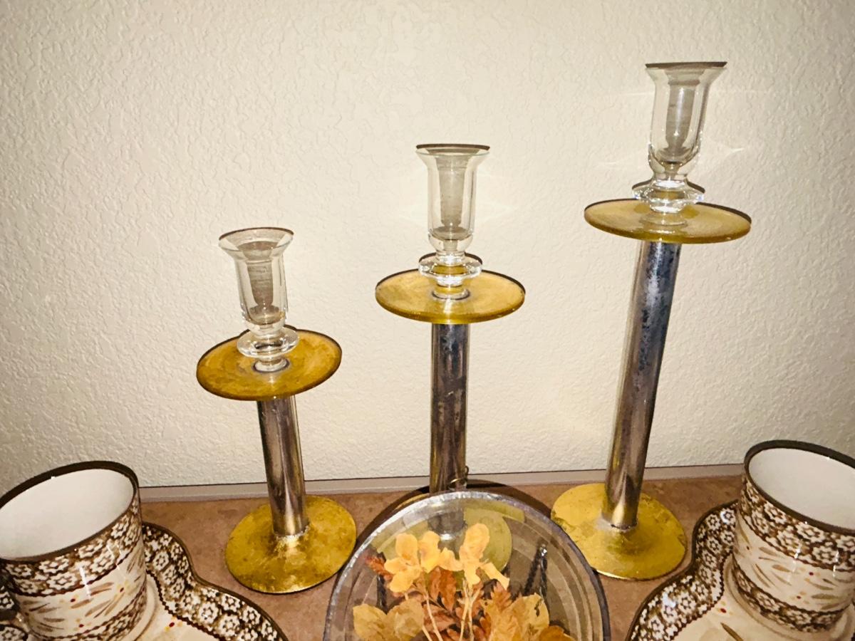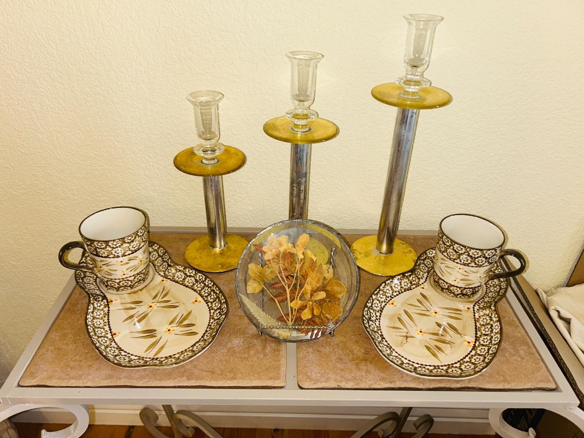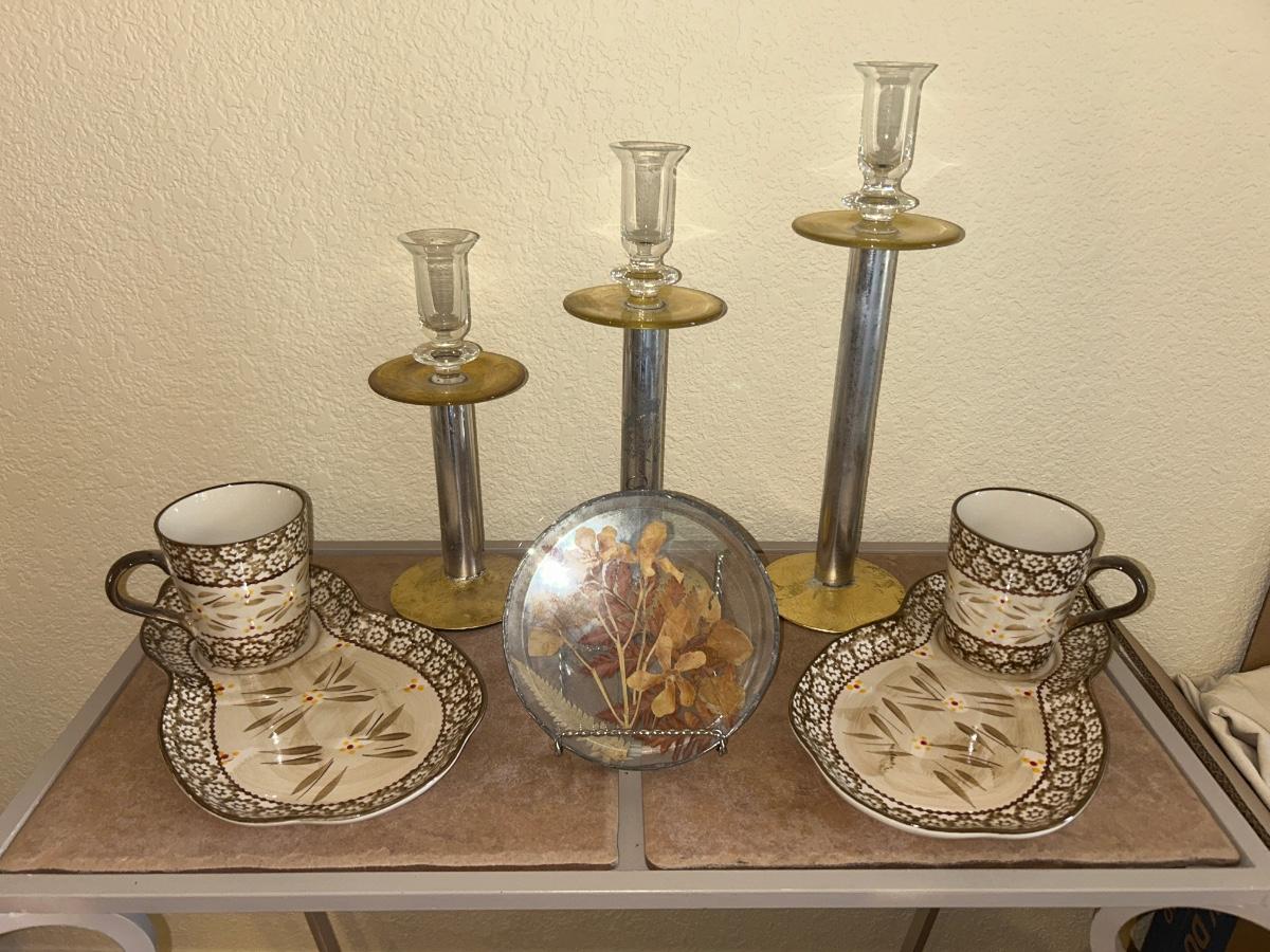TEMP-TATIONS HOSTESS PLATES AND MUGS, GLASS CANDLE STICK HOLDERS AND LEADED GLASS FLORAL PIECE
