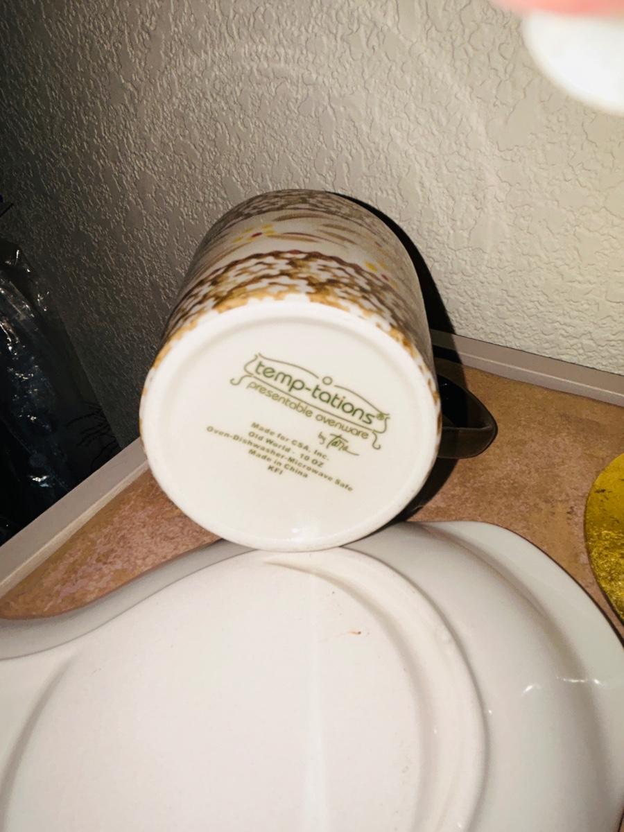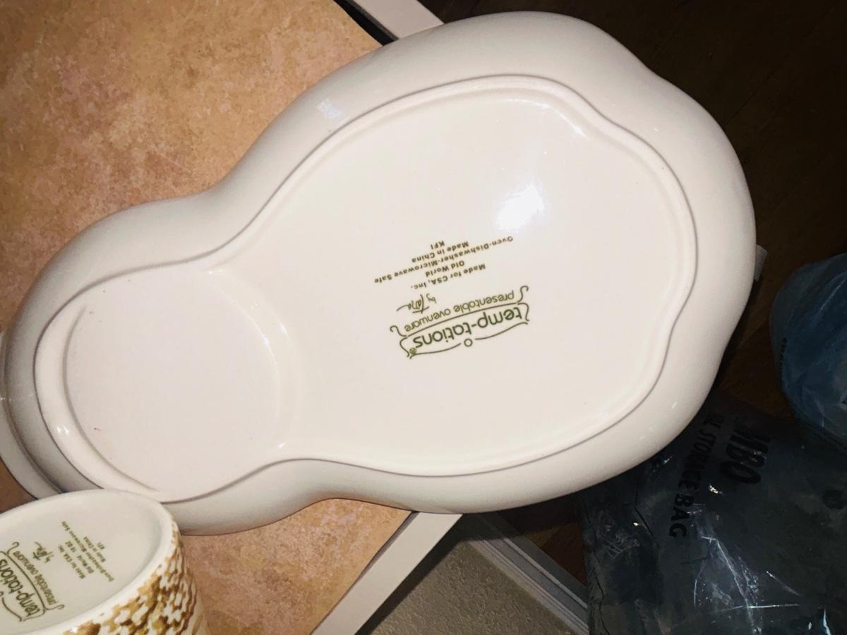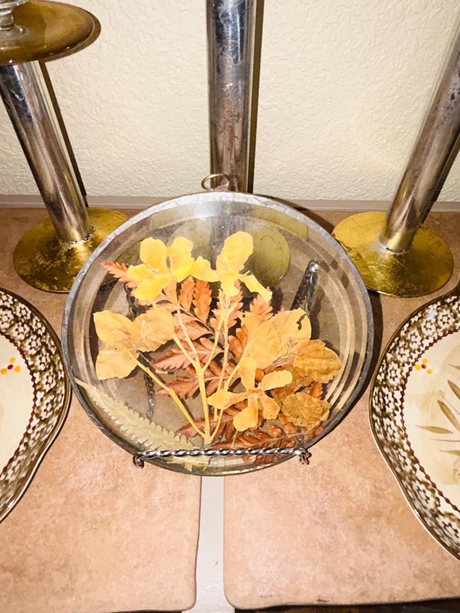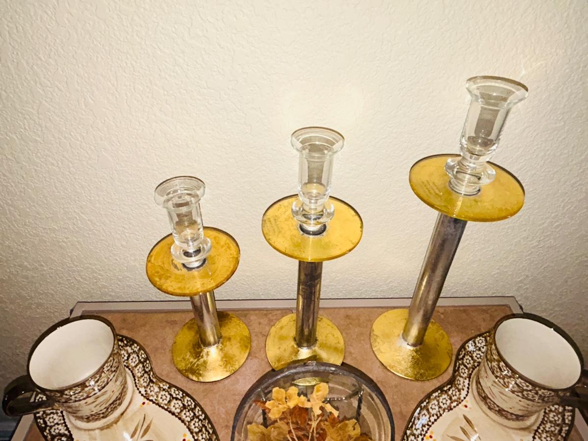 TEMP-TATIONS HOSTESS PLATES AND MUGS, GLASS CANDLE STICK HOLDERS AND LEADED GLASS FLORAL PIECE