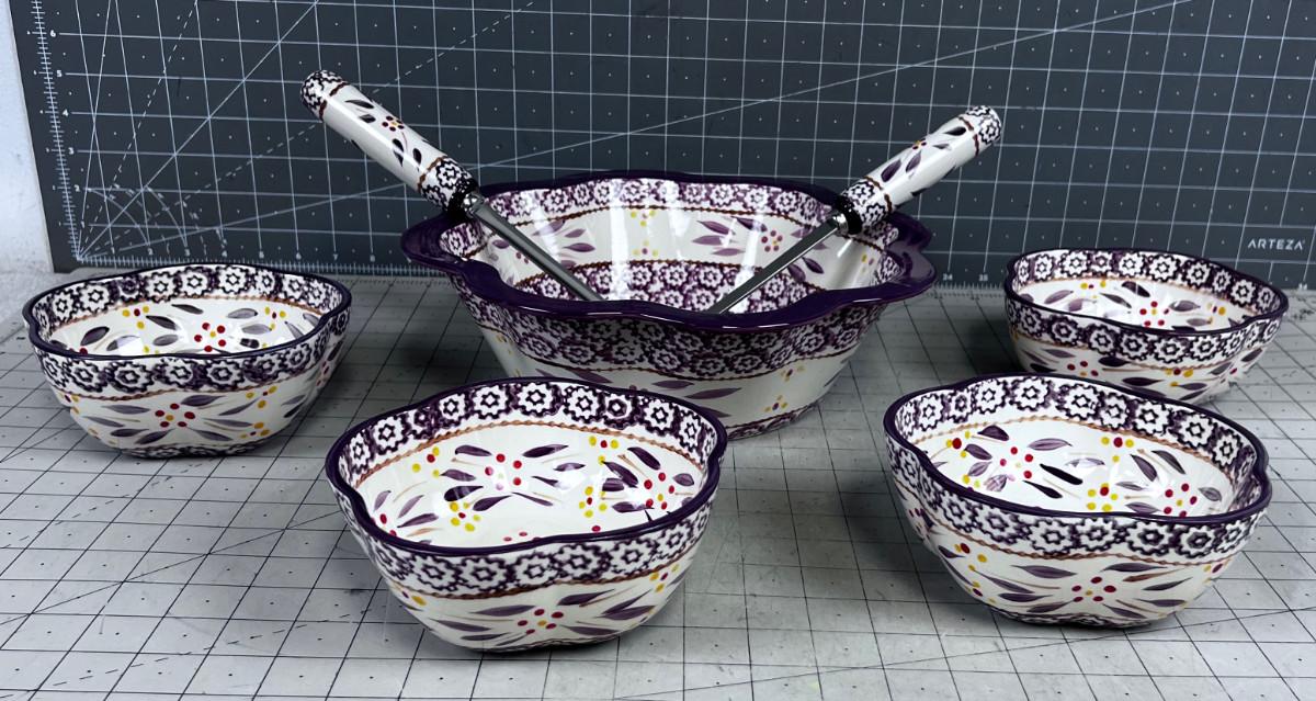 TEMPTATIONS Serving Bowl with 4 Salad Bowls & Utensils.