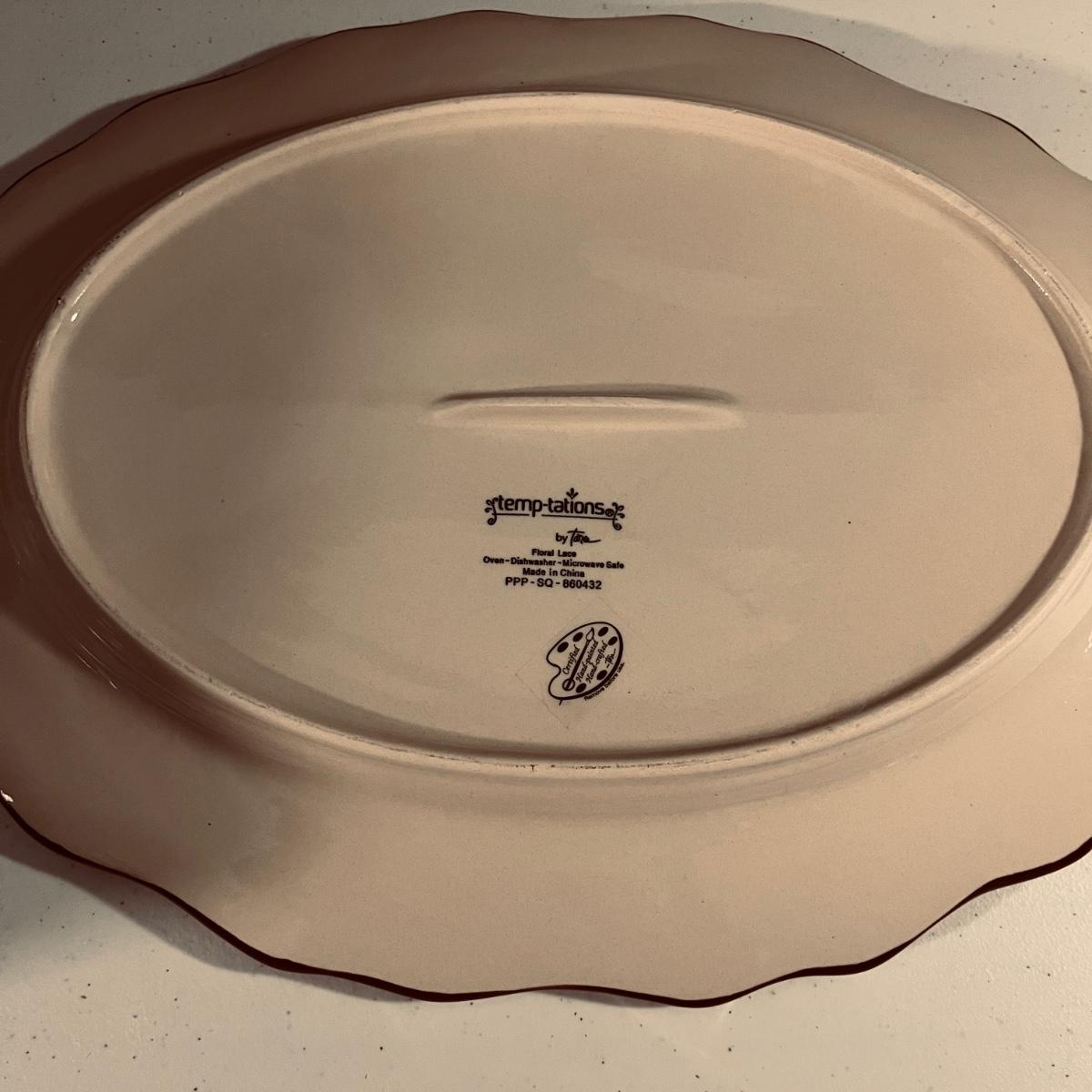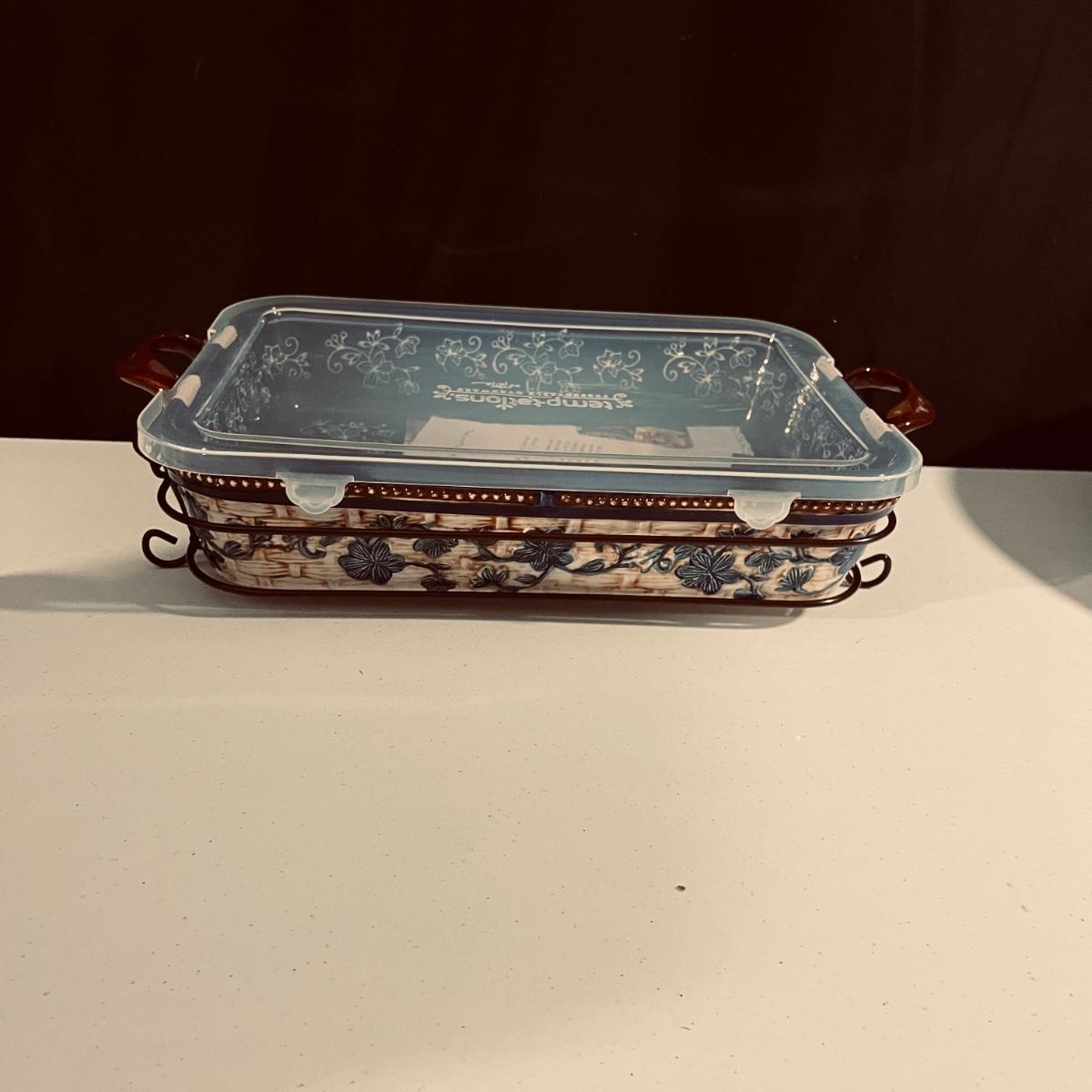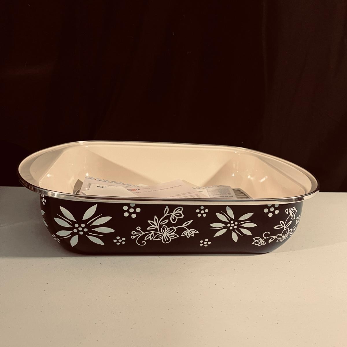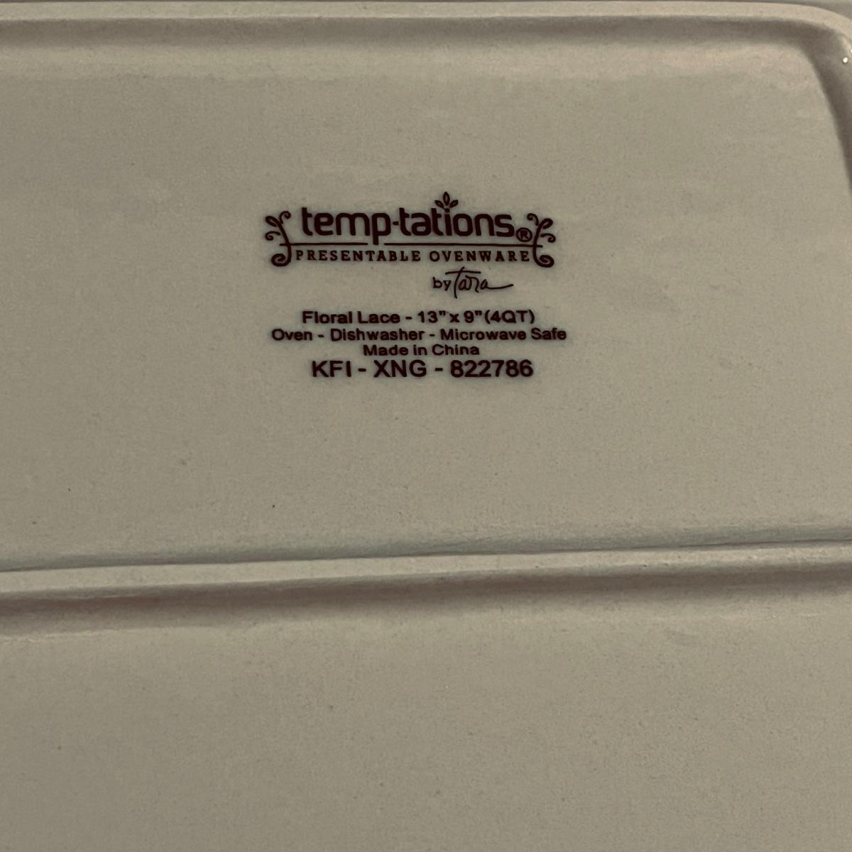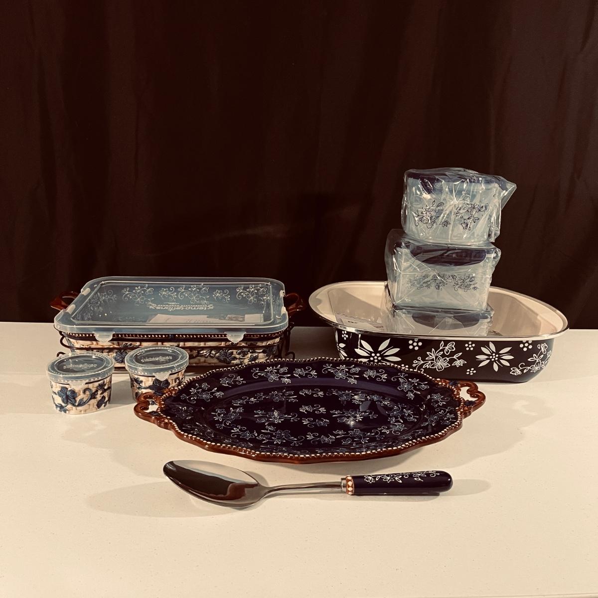 Lot includes an enamel on steel roasting pan, ceramic casserole dish with metal stand, ceramic serving tray, two ceramic ramekins, serving spoon and a six piece storage set with lids. Items are in the Floral Lace pattern and appear to be unused. Roasting pan measures 13.5” x 17.5” x 3.5”H. There will a more Temp-Tations in this sale.