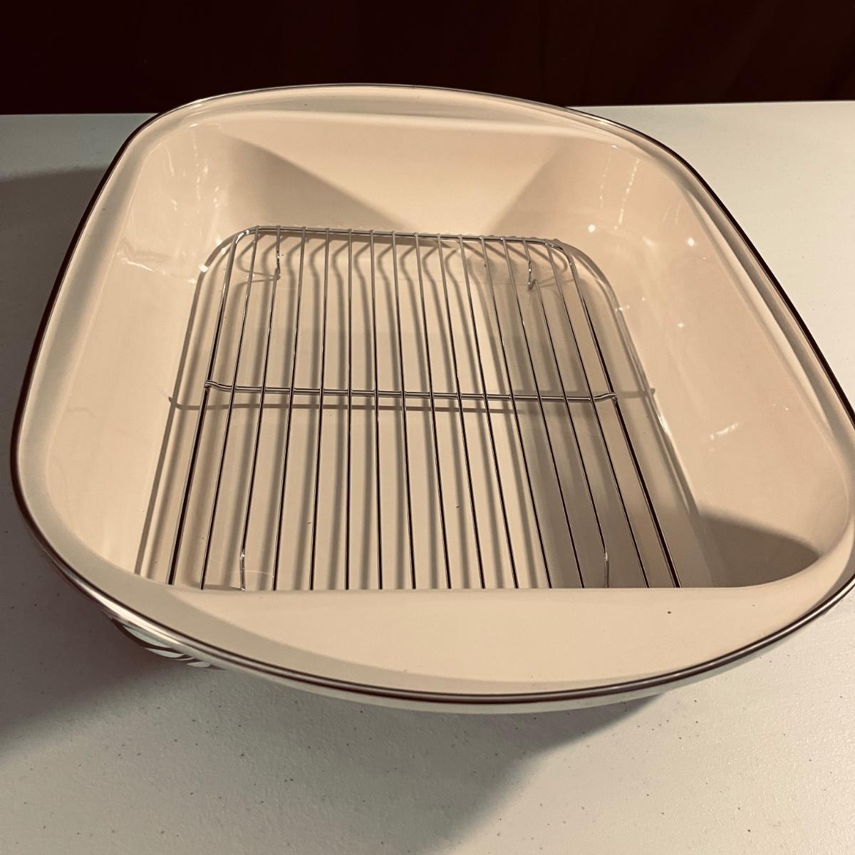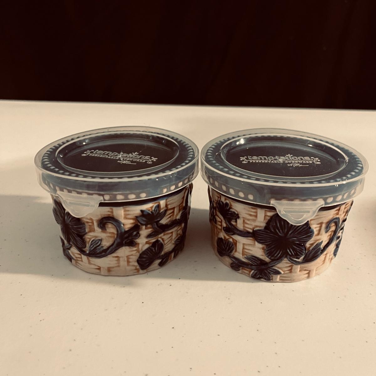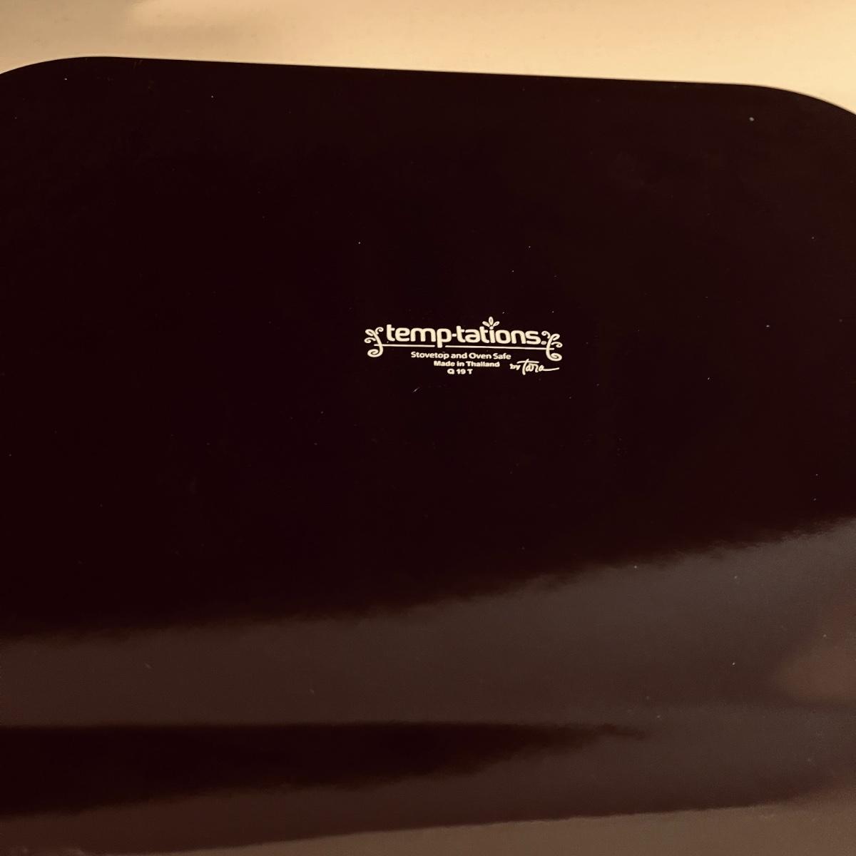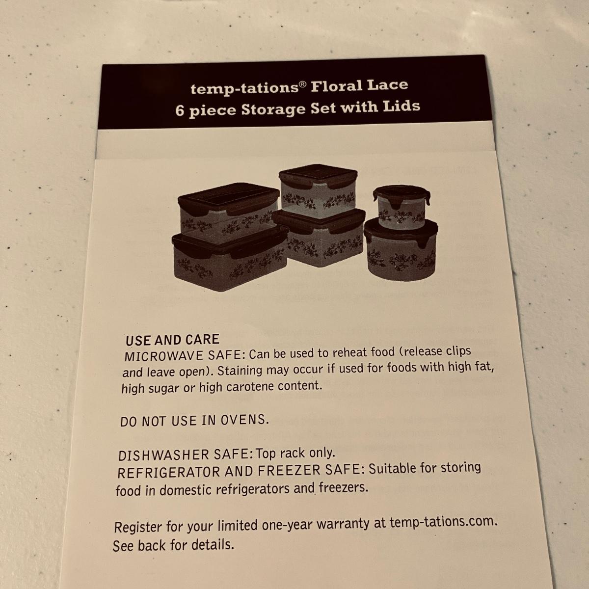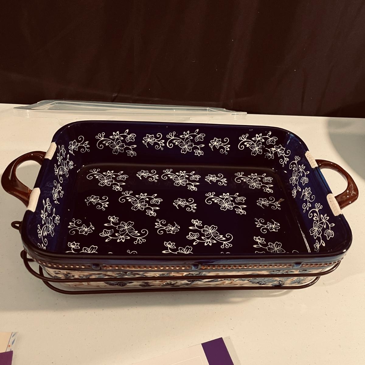 Lot includes an enamel on steel roasting pan, ceramic casserole dish with metal stand, ceramic serving tray, two ceramic ramekins, serving spoon and a six piece storage set with lids. Items are in the Floral Lace pattern and appear to be unused. Roasting pan measures 13.5” x 17.5” x 3.5”H. There will a more Temp-Tations in this sale.
