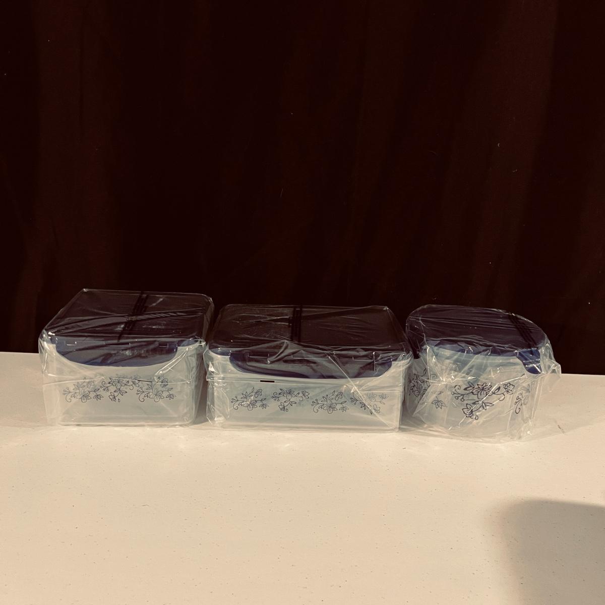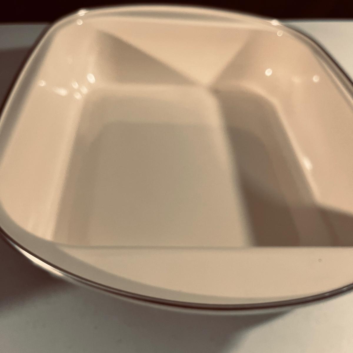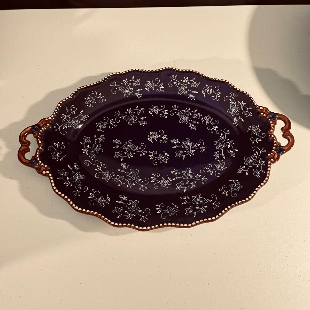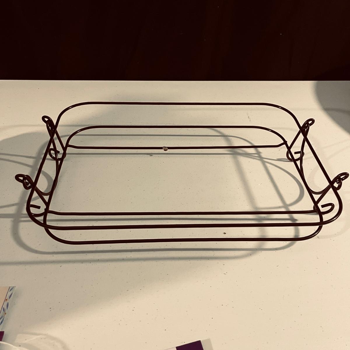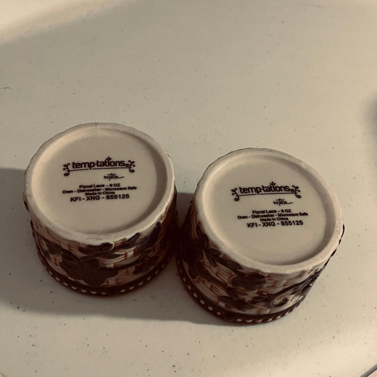 Lot includes an enamel on steel roasting pan, ceramic casserole dish with metal stand, ceramic serving tray, two ceramic ramekins, serving spoon and a six piece storage set with lids. Items are in the Floral Lace pattern and appear to be unused. Roasting pan measures 13.5” x 17.5” x 3.5”H. There will a more Temp-Tations in this sale.