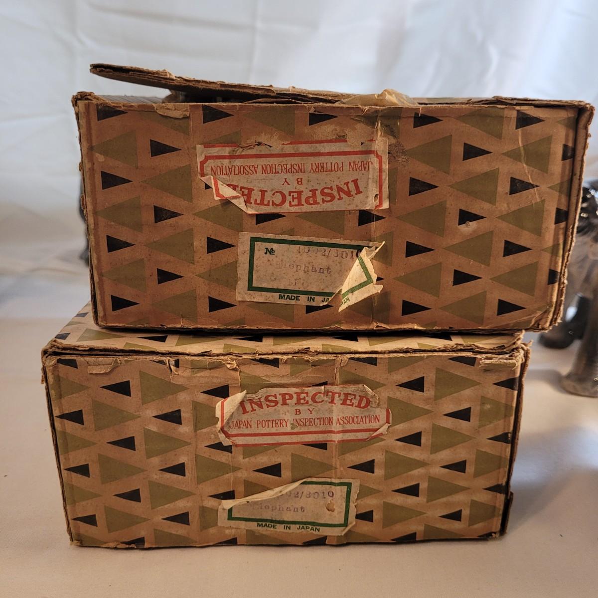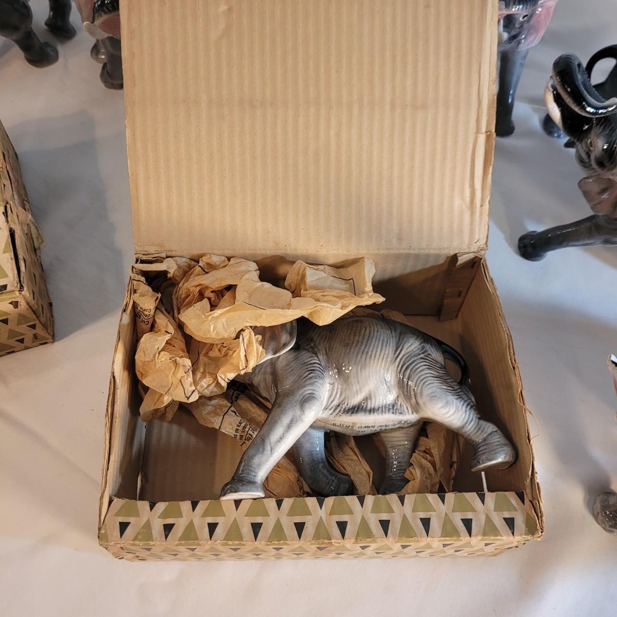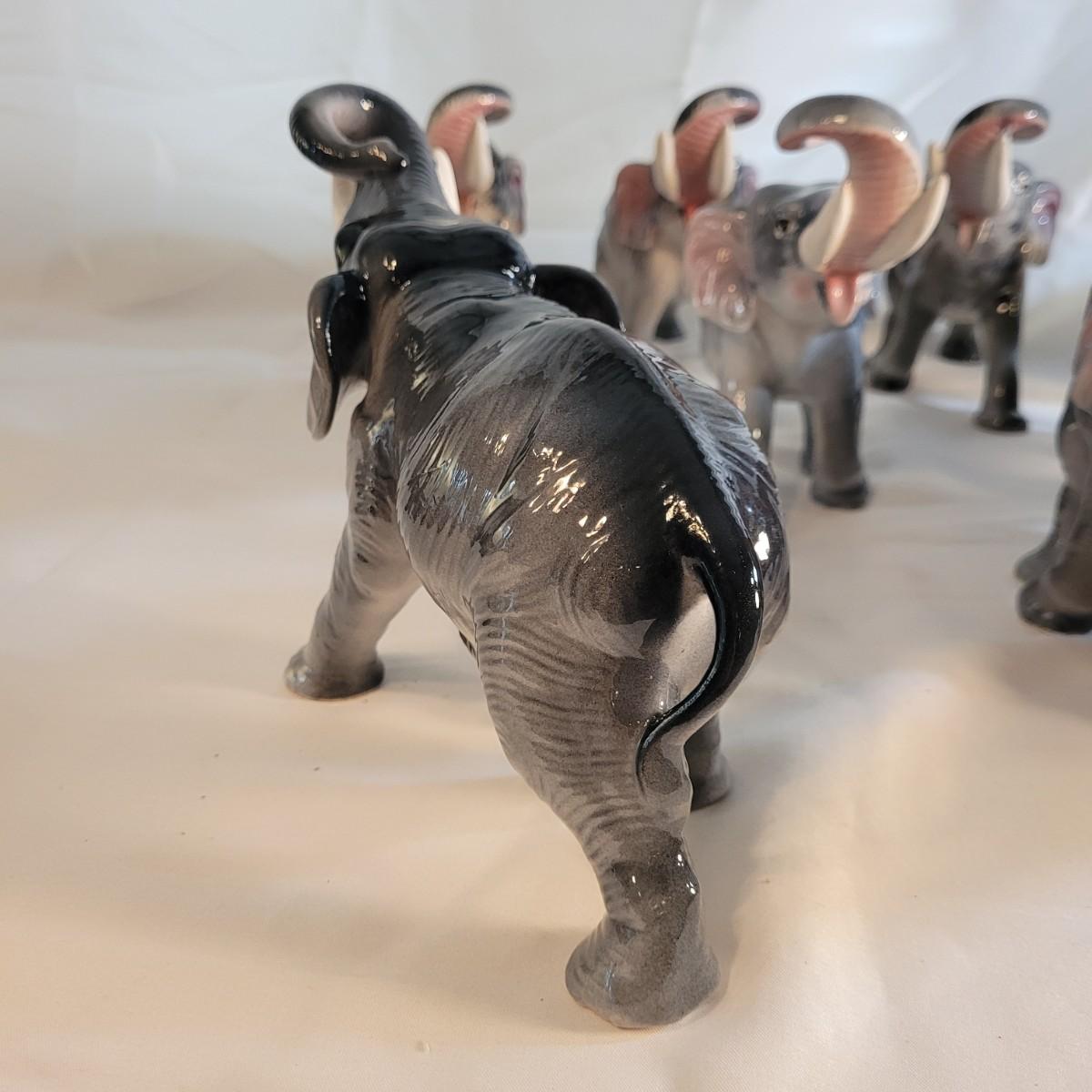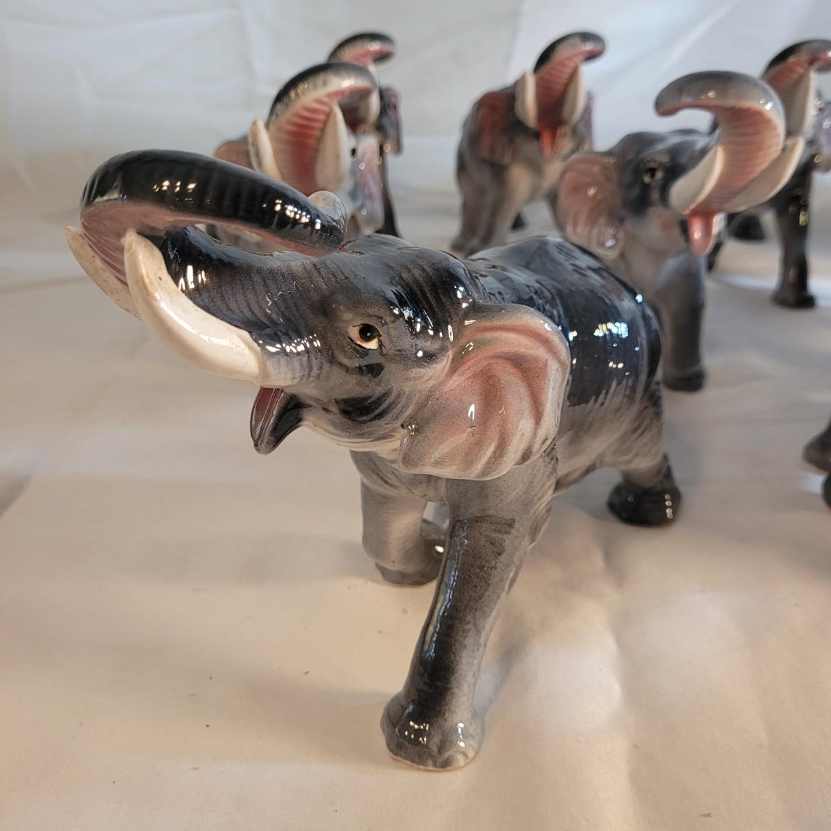 Ten ceramic elephants on parade, seven of which have the original boxes with Japanese Pottery Inspection Association labels. Some are a little dirty, but appear to clean easily. Three elephants have chips or damage. Elephants measure approximately 11" from height of trunk to back leg. Shipping available.