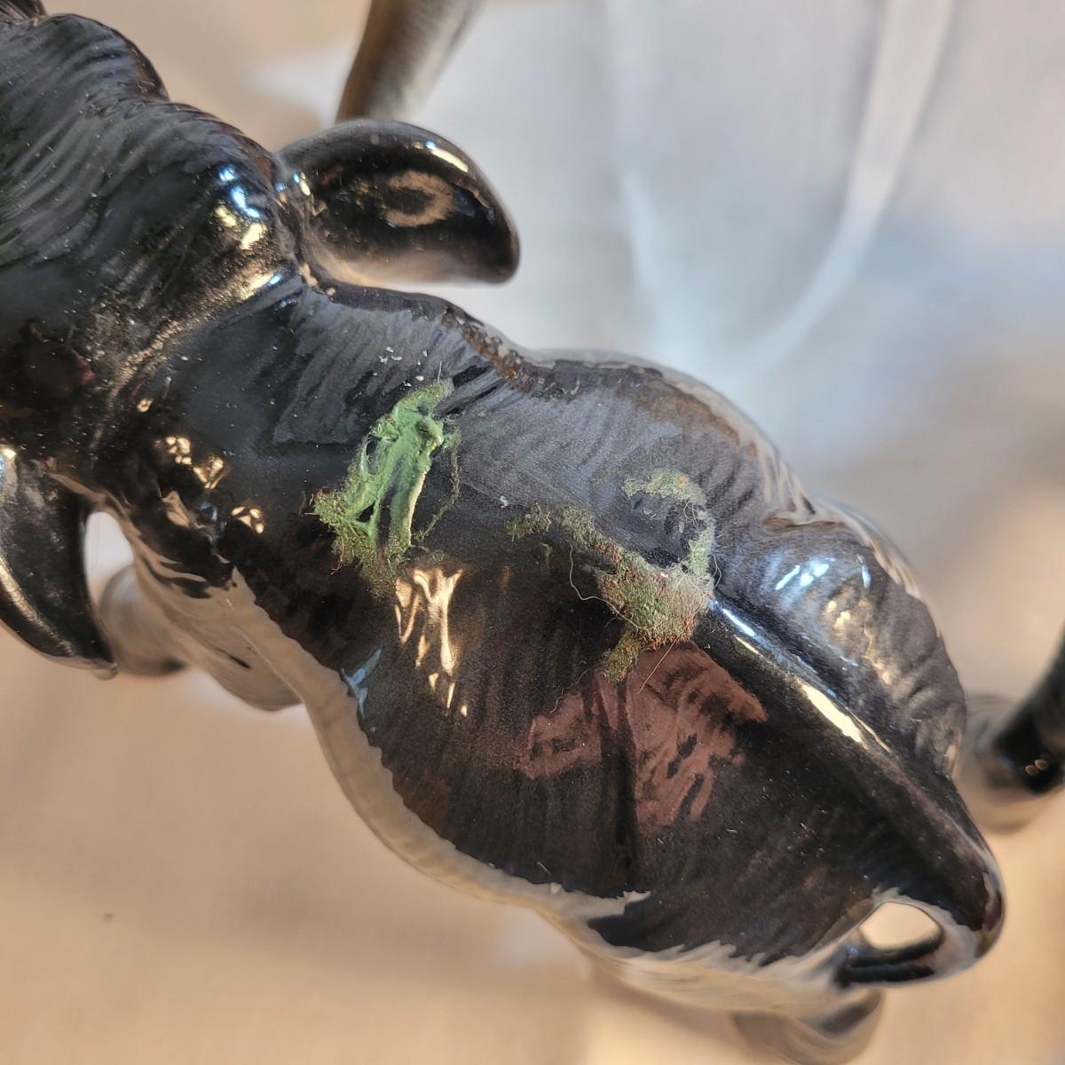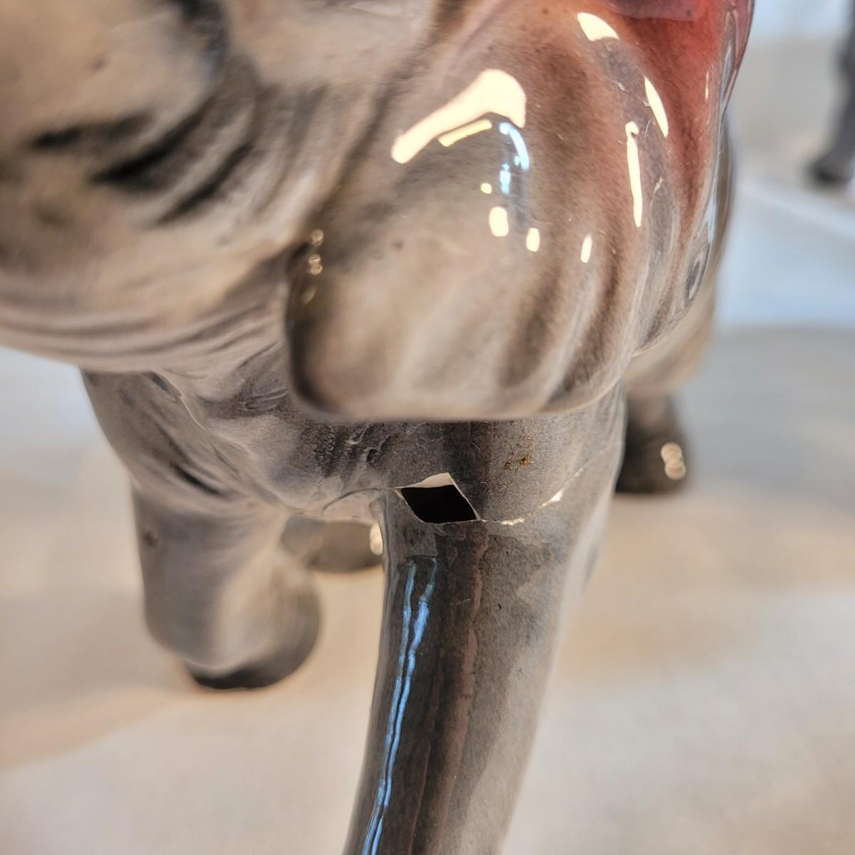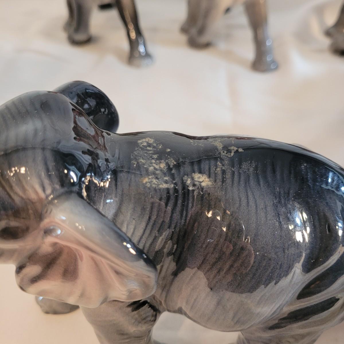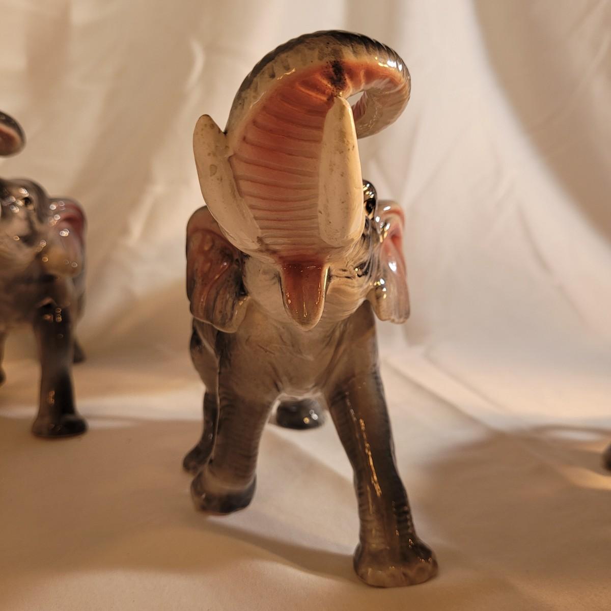 Ten ceramic elephants on parade, seven of which have the original boxes with Japanese Pottery Inspection Association labels. Some are a little dirty, but appear to clean easily. Three elephants have chips or damage. Elephants measure approximately 11" from height of trunk to back leg. Shipping available.