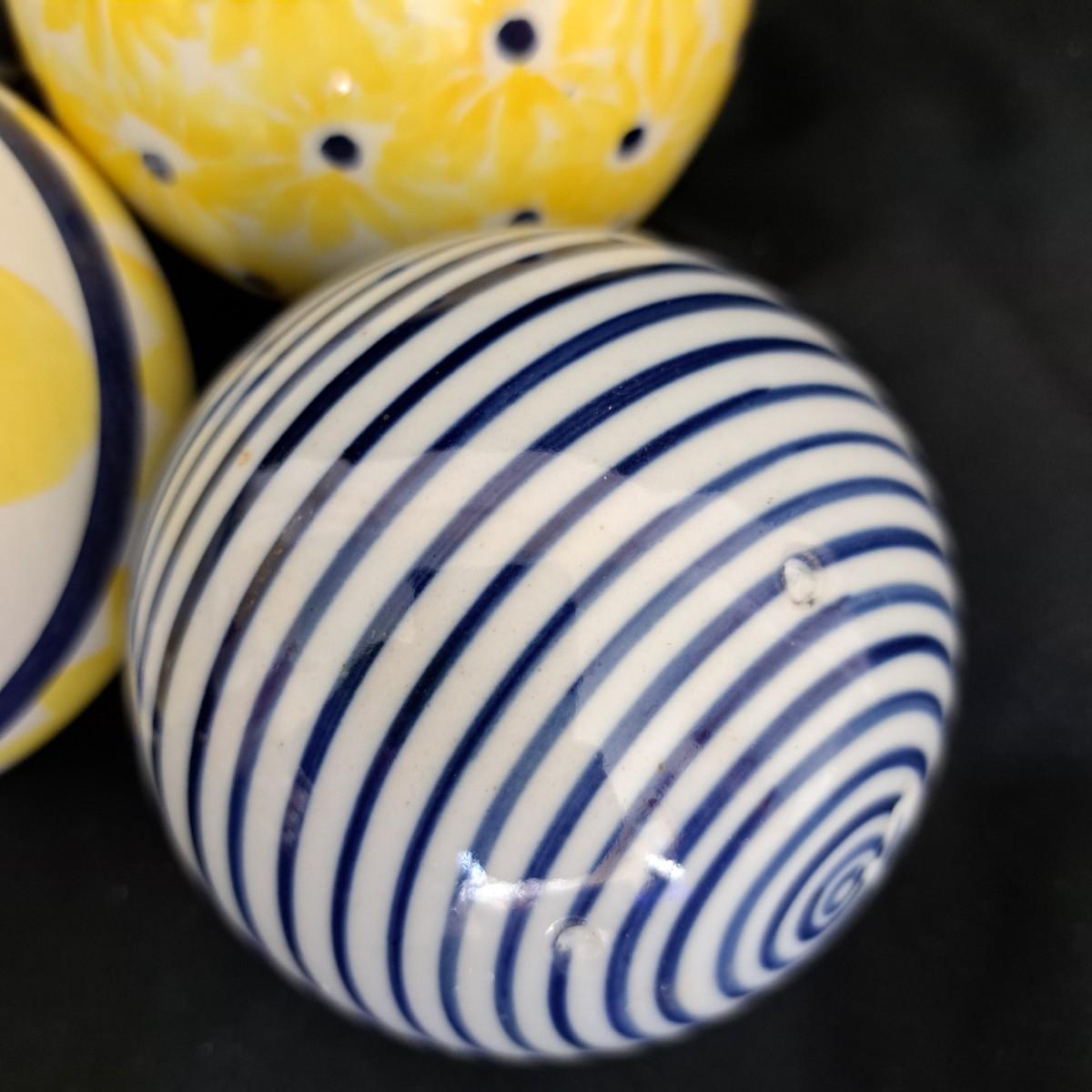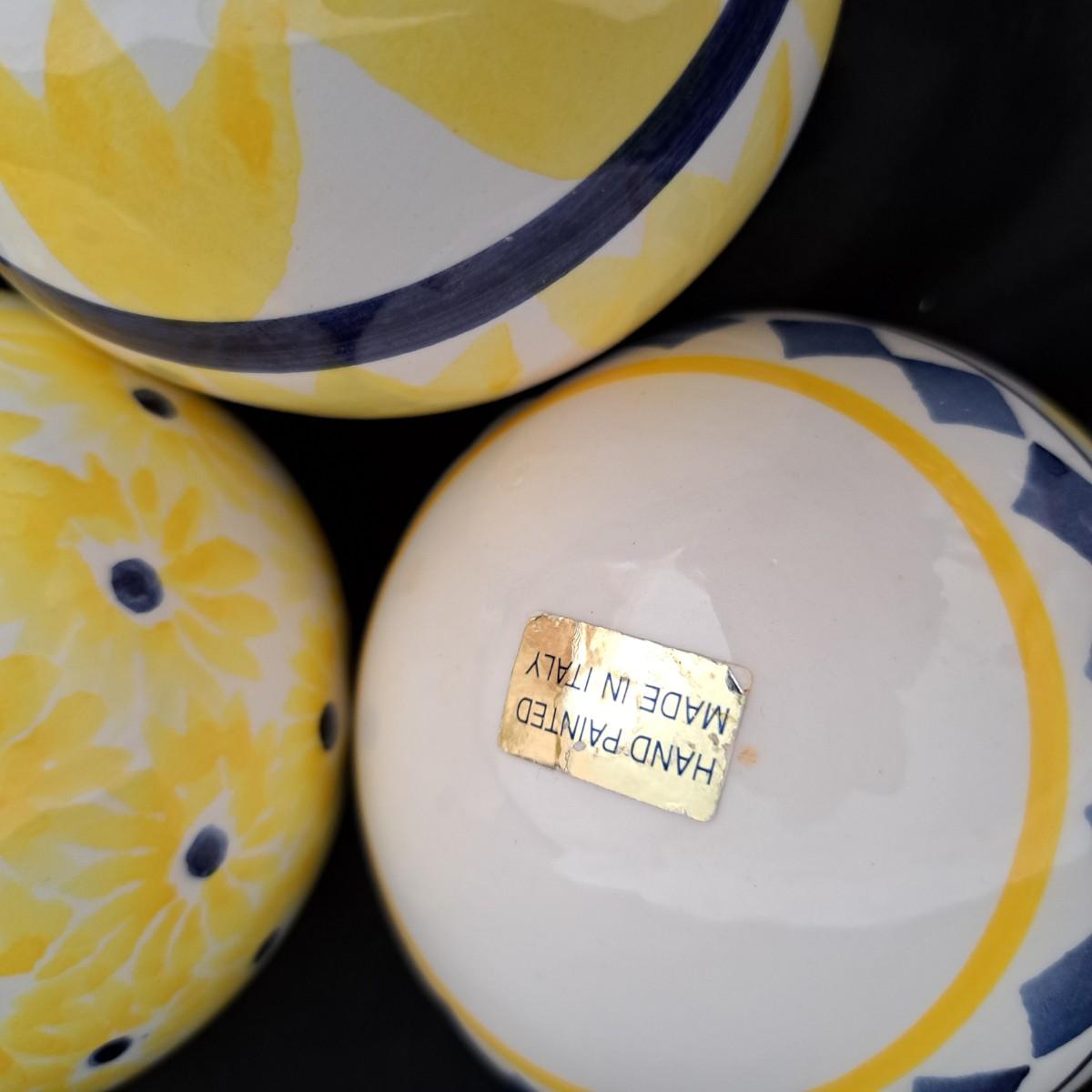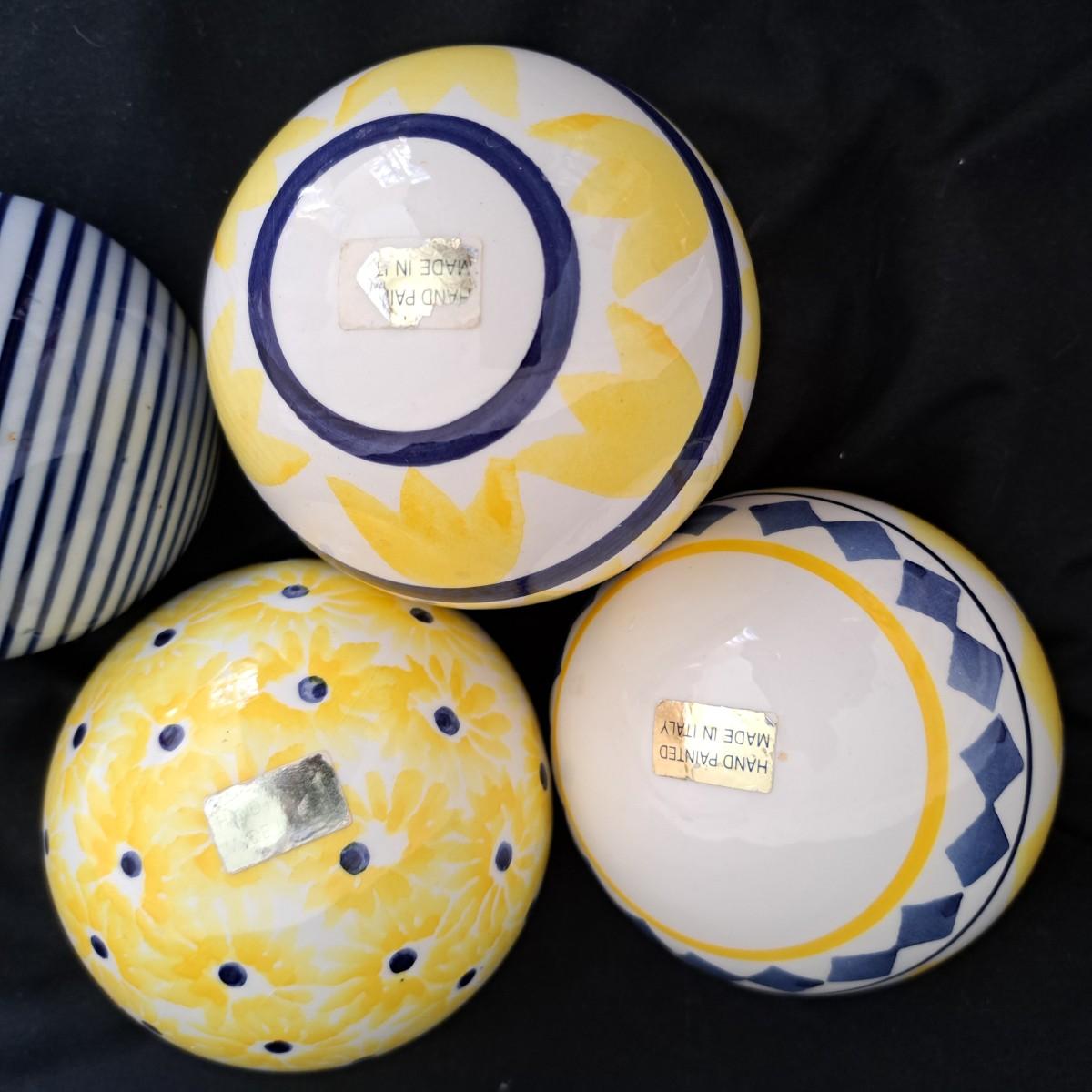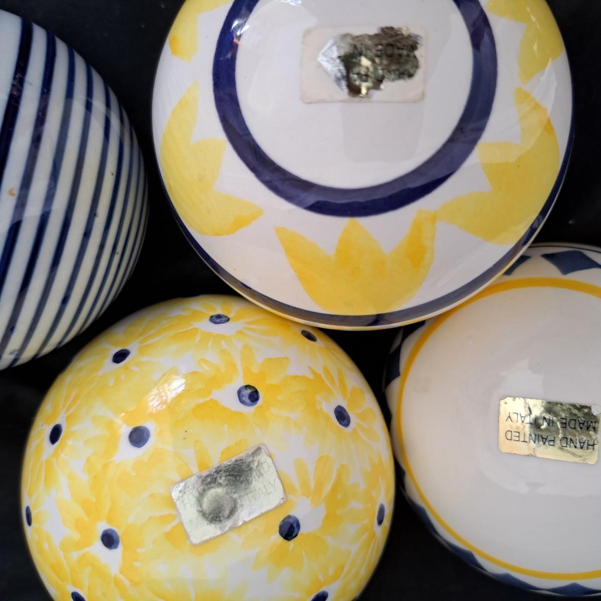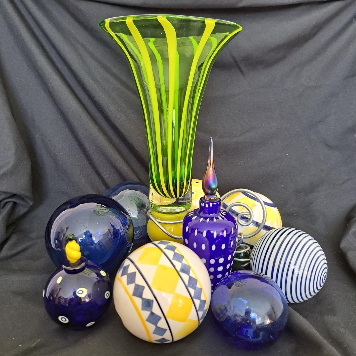 A fabulous collection of ten blue and yellow art glass ranging from a small hand-blown cobalt blue bubble 2"H to a swirled hand-blown teal and yellow Murano vase 12"H with a coiled metal collar at bottom of base. Although the vase is unmarked it appears to be Murano glass. Also, three additional hand-blown cobalt blue glass balls (*all have pontils at bottom), three yellow and blue Handpainted/Made in Italy hollow ceramic balls, a striped blue and white ceramic ball, blown glass cobalt perfume bottle with irridescent stopper (marked Georgia's Designs China; cannot remove stopper) and finally, a smaller hand-blown cobalt millefiori-type perfume bottle with swirled yellow stopper (*tiny bit if flaking around rim where stopper hits top of bottle) - for a grand total of ten fabulous and fanciful pieces! Shipping available. Shipping can be costly. We suggest contacting our preferred local shipping provider, Postage Express, with dimensions and getting an estimate before bidding: (828) 255-9250 or shipping@postageexpressnc.com.