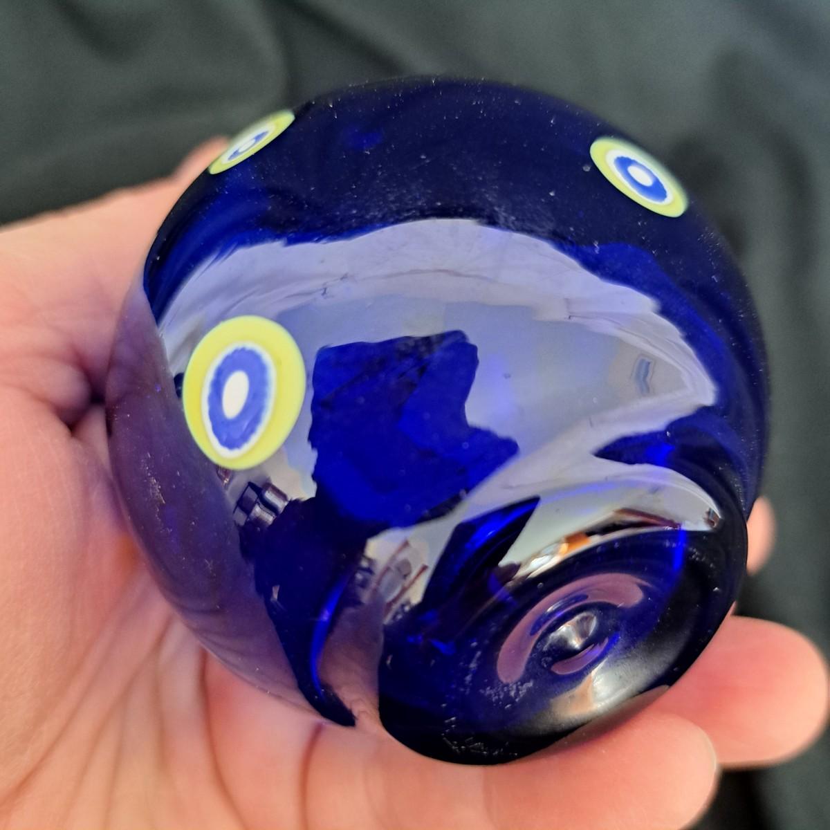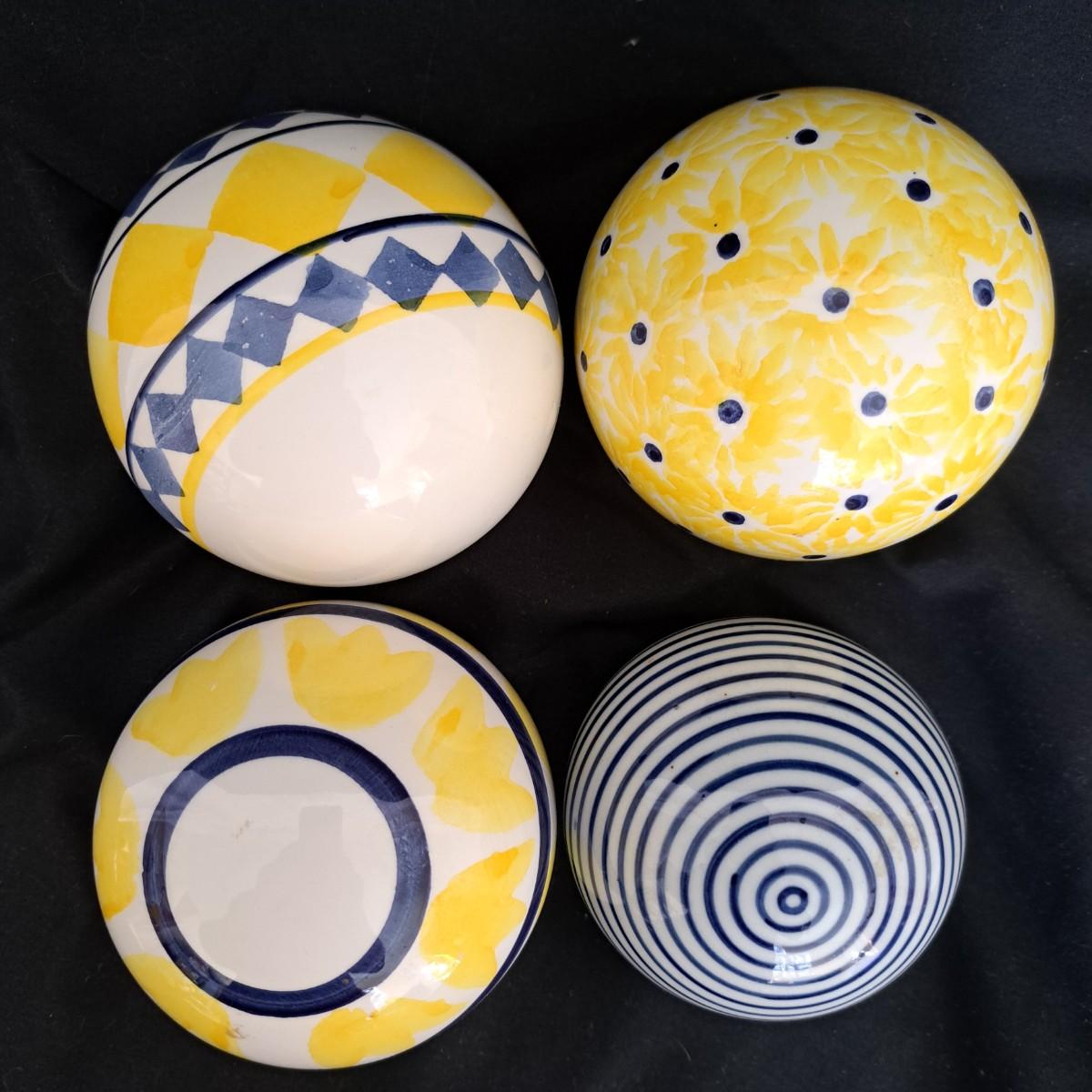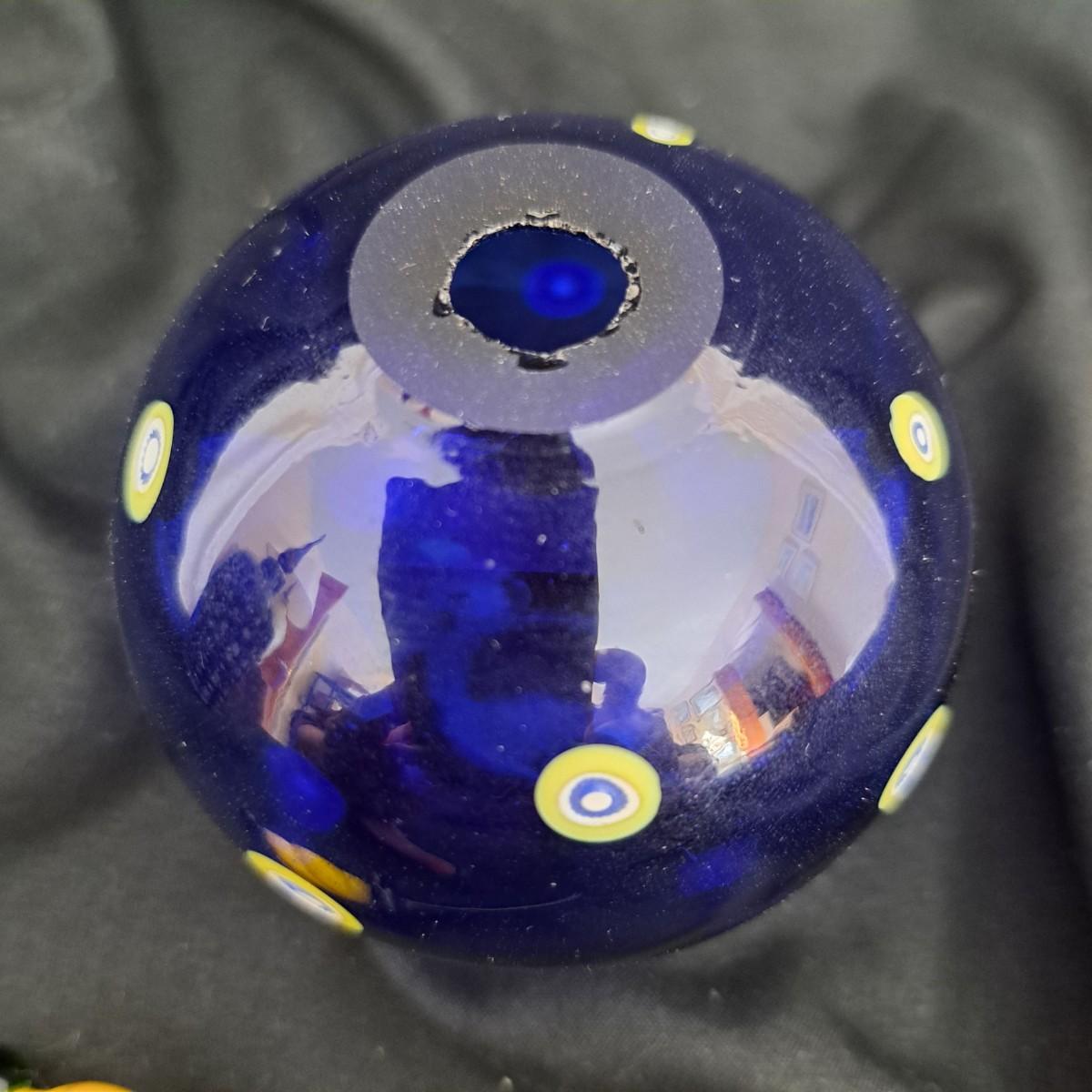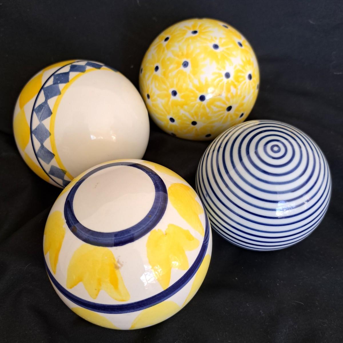 A fabulous collection of ten blue and yellow art glass ranging from a small hand-blown cobalt blue bubble 2"H to a swirled hand-blown teal and yellow Murano vase 12"H with a coiled metal collar at bottom of base. Although the vase is unmarked it appears to be Murano glass. Also, three additional hand-blown cobalt blue glass balls (*all have pontils at bottom), three yellow and blue Handpainted/Made in Italy hollow ceramic balls, a striped blue and white ceramic ball, blown glass cobalt perfume bottle with irridescent stopper (marked Georgia's Designs China; cannot remove stopper) and finally, a smaller hand-blown cobalt millefiori-type perfume bottle with swirled yellow stopper (*tiny bit if flaking around rim where stopper hits top of bottle) - for a grand total of ten fabulous and fanciful pieces! Shipping available. Shipping can be costly. We suggest contacting our preferred local shipping provider, Postage Express, with dimensions and getting an estimate before bidding: (828) 255-9250 or shipping@postageexpressnc.com.