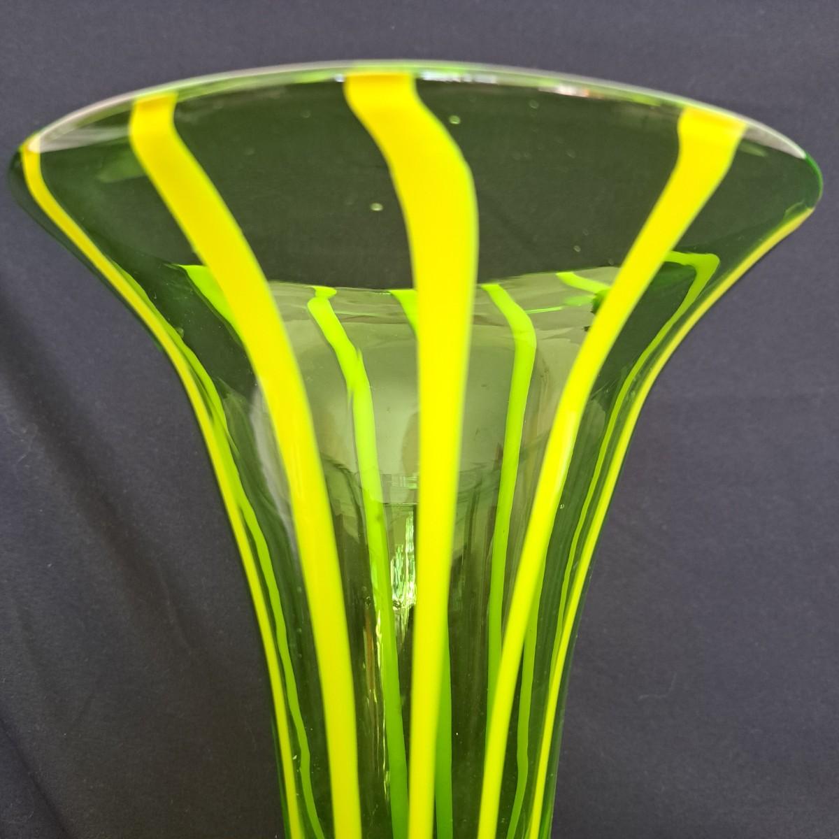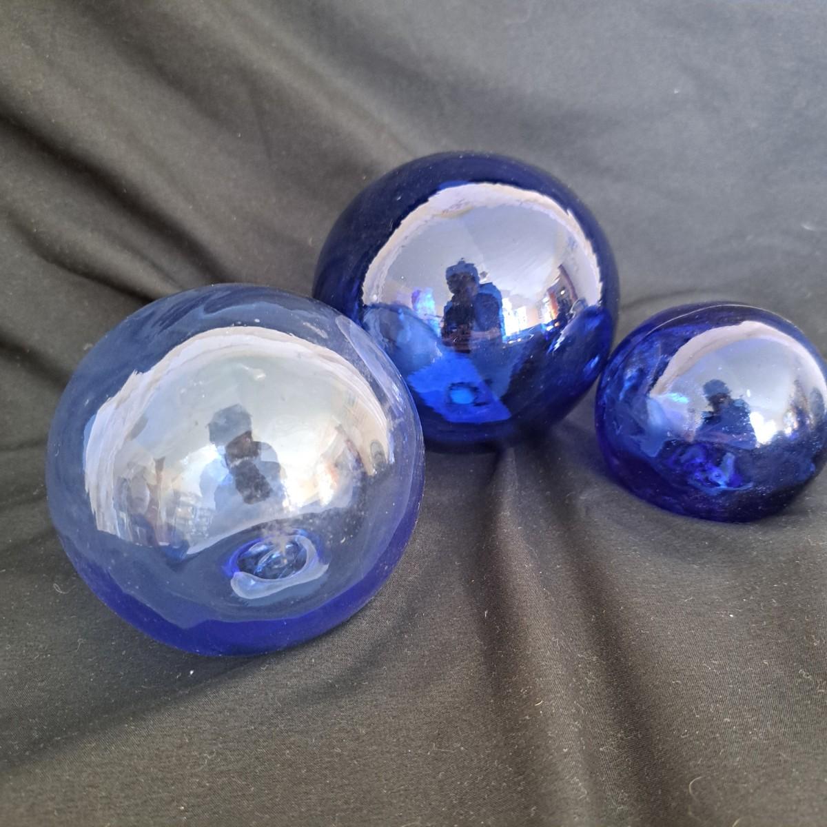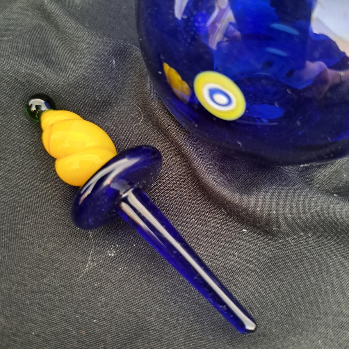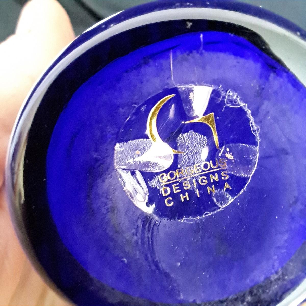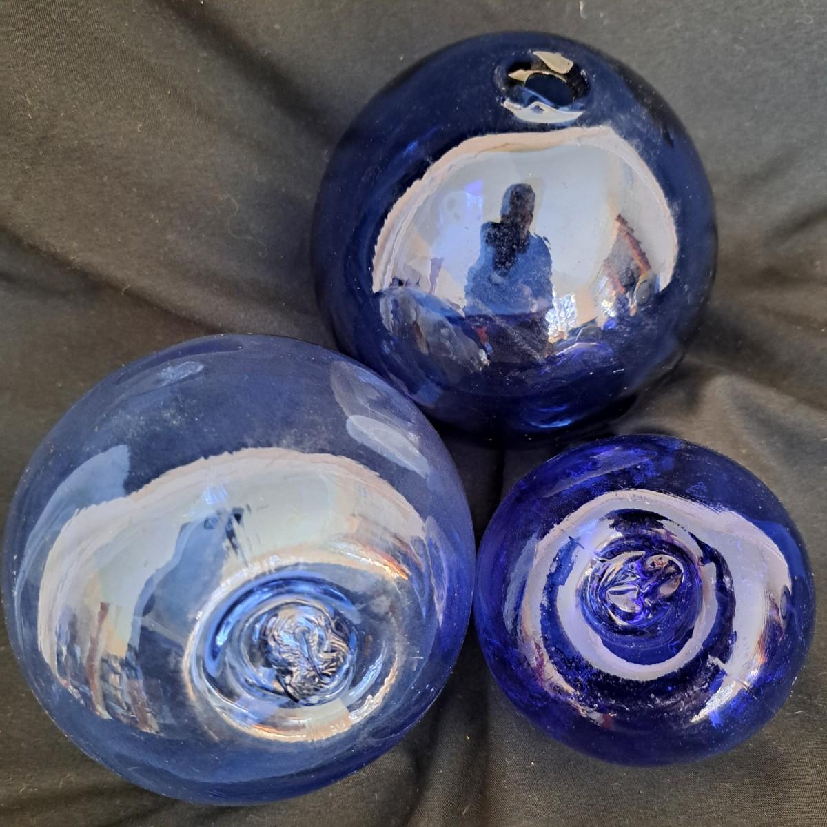 A fabulous collection of ten blue and yellow art glass ranging from a small hand-blown cobalt blue bubble 2"H to a swirled hand-blown teal and yellow Murano vase 12"H with a coiled metal collar at bottom of base. Although the vase is unmarked it appears to be Murano glass. Also, three additional hand-blown cobalt blue glass balls (*all have pontils at bottom), three yellow and blue Handpainted/Made in Italy hollow ceramic balls, a striped blue and white ceramic ball, blown glass cobalt perfume bottle with irridescent stopper (marked Georgia's Designs China; cannot remove stopper) and finally, a smaller hand-blown cobalt millefiori-type perfume bottle with swirled yellow stopper (*tiny bit if flaking around rim where stopper hits top of bottle) - for a grand total of ten fabulous and fanciful pieces! Shipping available. Shipping can be costly. We suggest contacting our preferred local shipping provider, Postage Express, with dimensions and getting an estimate before bidding: (828) 255-9250 or shipping@postageexpressnc.com.