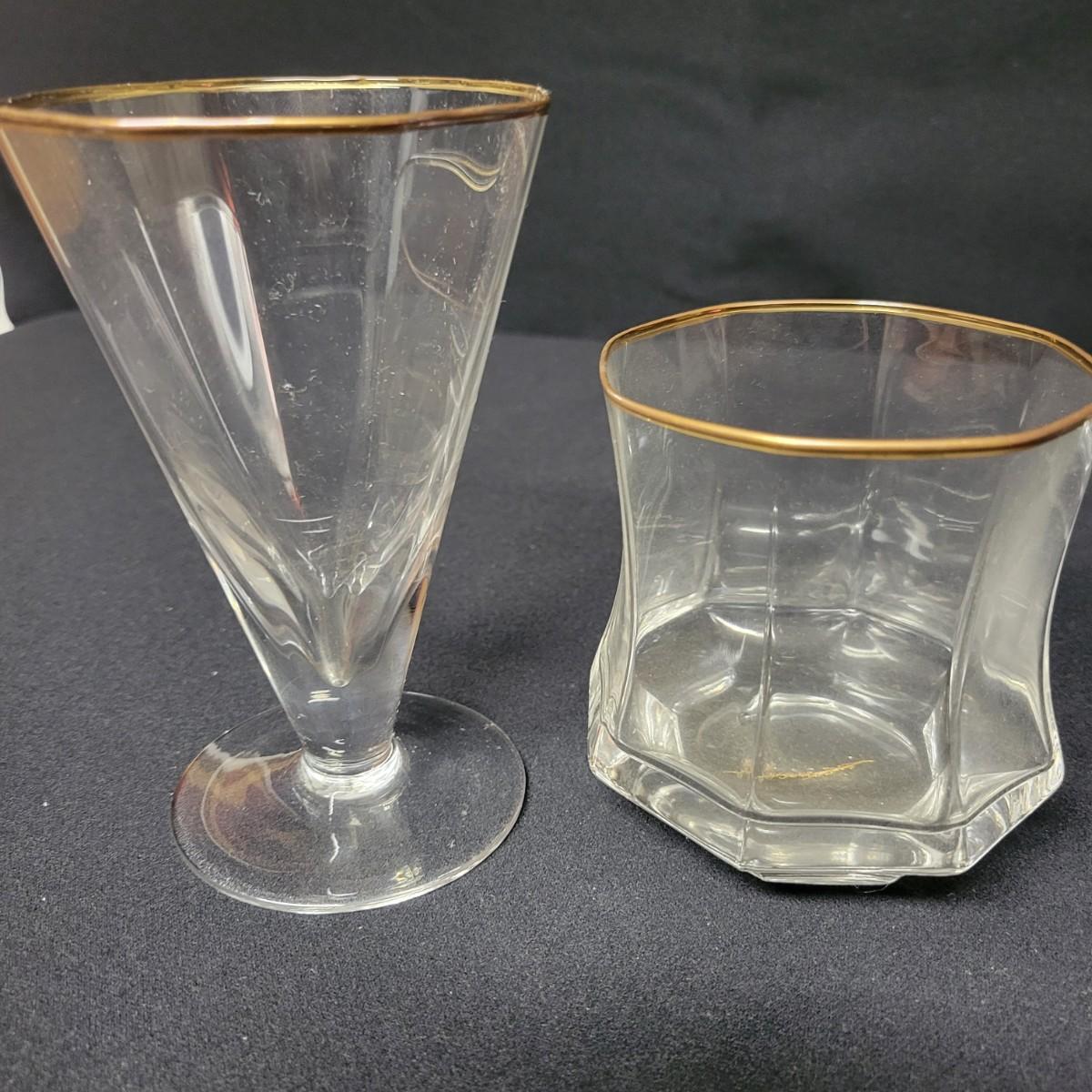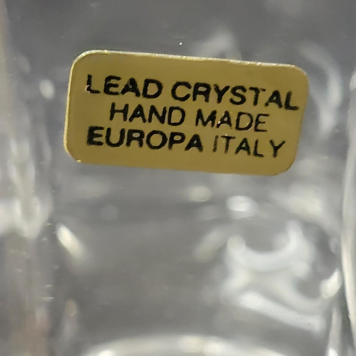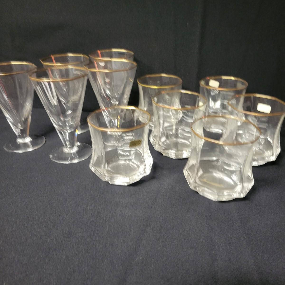 A set of 11 leaded crystal glasses made in Italy. All pieces are in excellent condition and features a gold filigree on the top of each glass. Largest glass measures approximately 3.5" x 5" Shipping available. Shipping can be costly please call UPS store at 828-252-6930 for quote