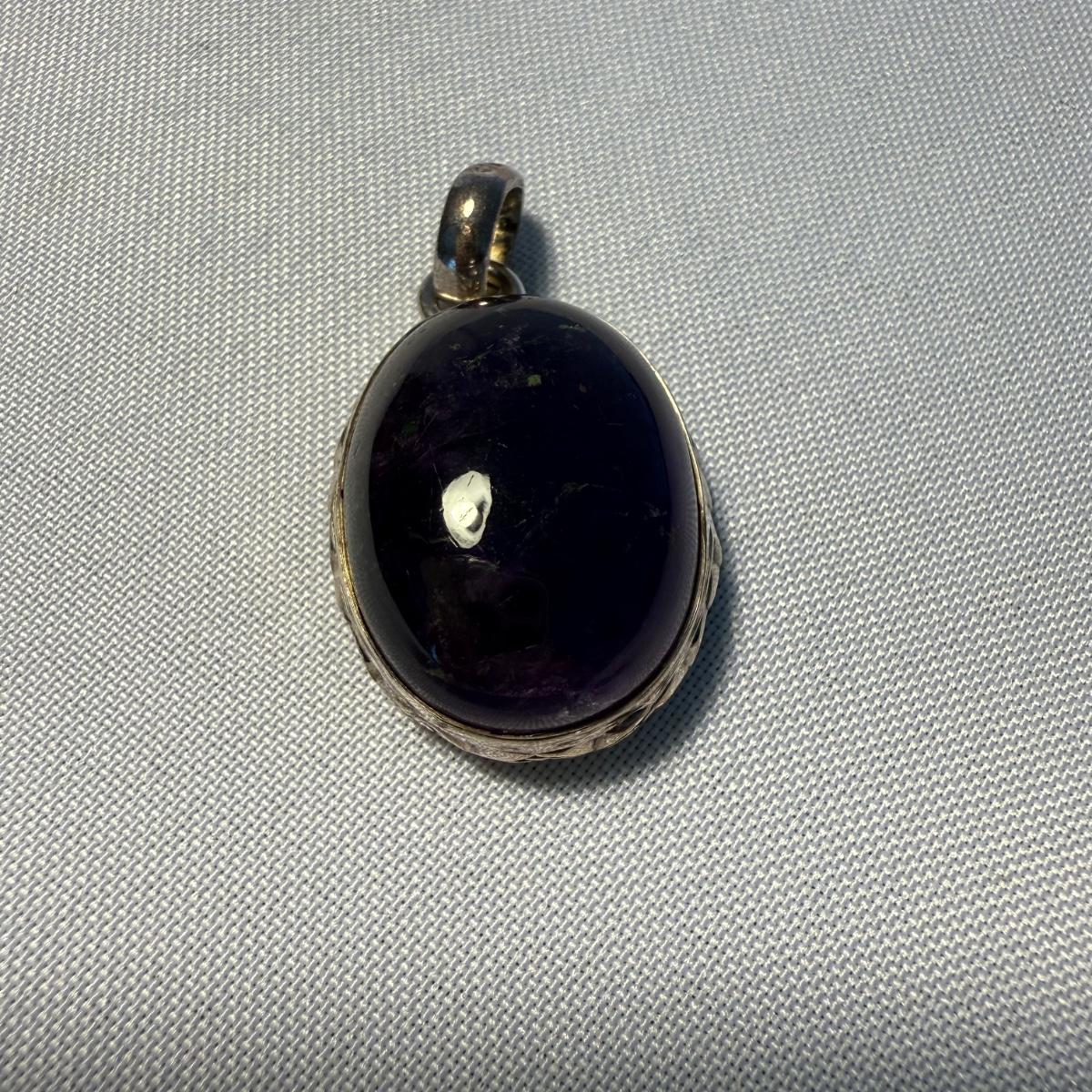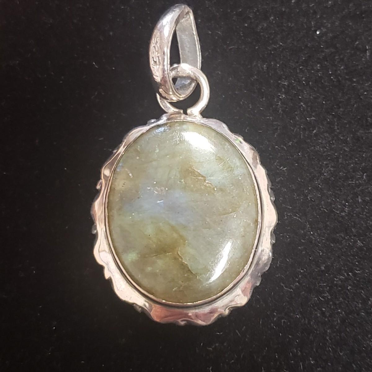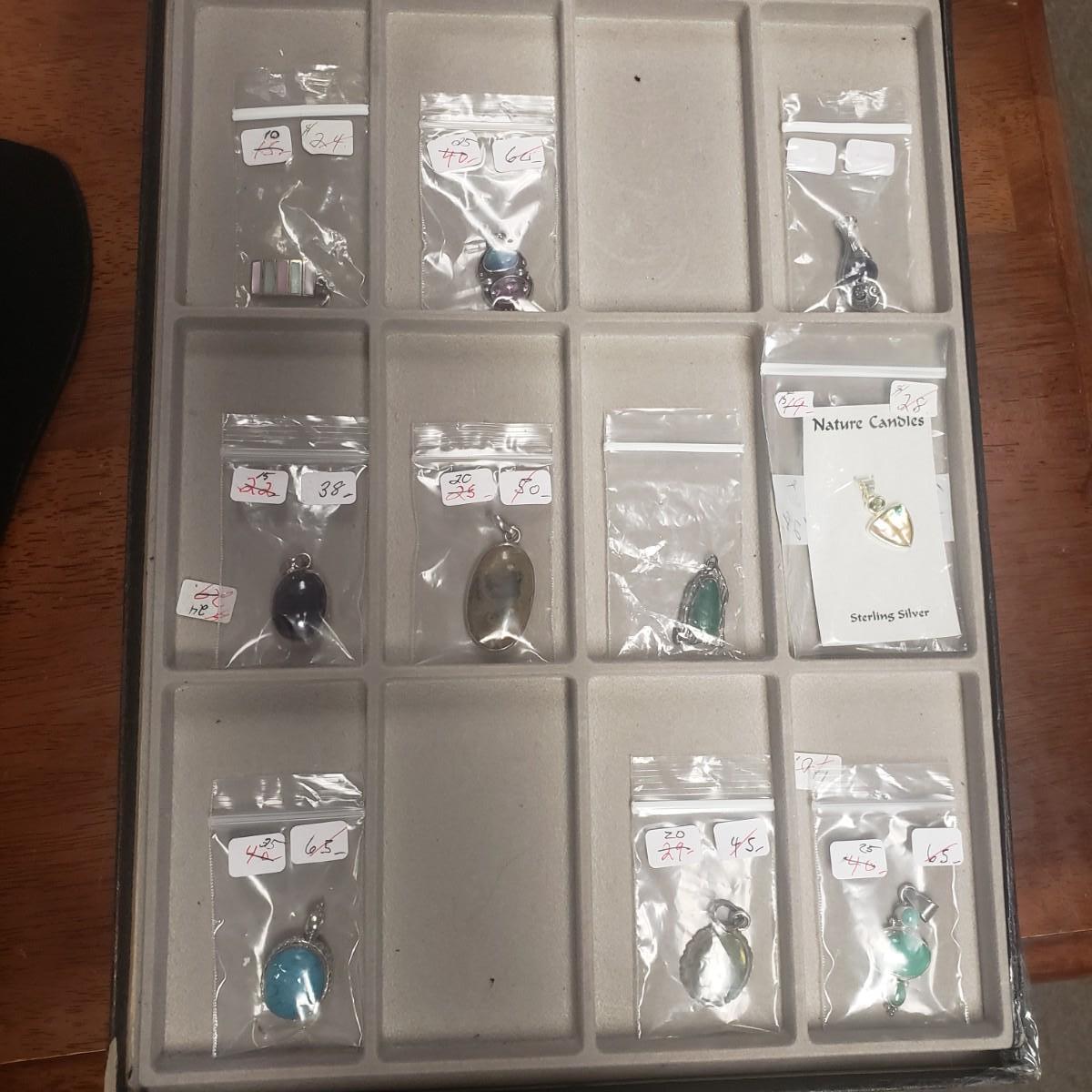These are ten sterling and stone pendants. There are a rainbow of colors in this lot! The pendants average 1". All pendants have a "925" stamp, which was hard to photograph. Pendants come in a velvet, hard cardboard case with a glass lid. The case is worn on the corners. Please note that any price tag seen on an item was not put there by Sterling Transitions and does not reflect the current value of the item.