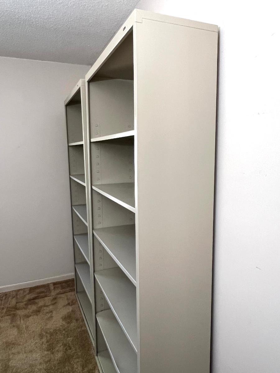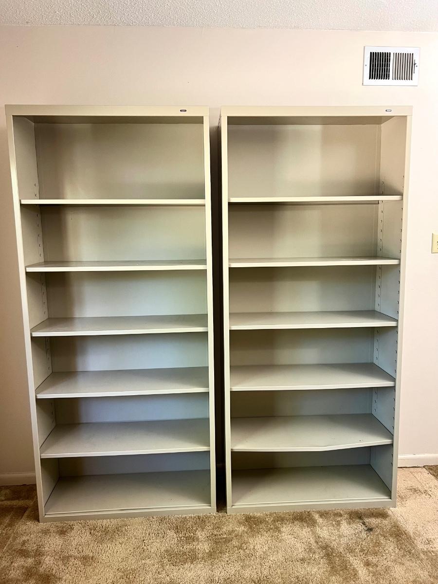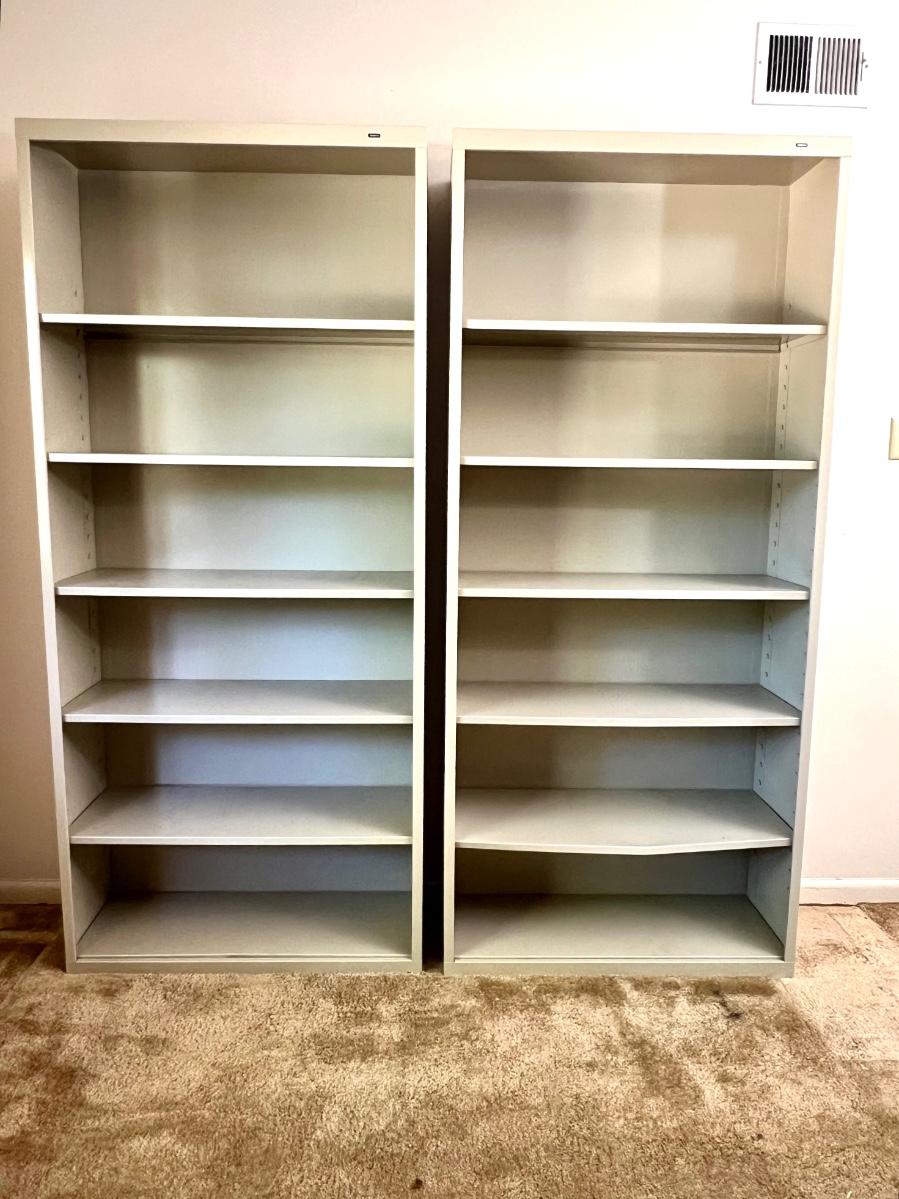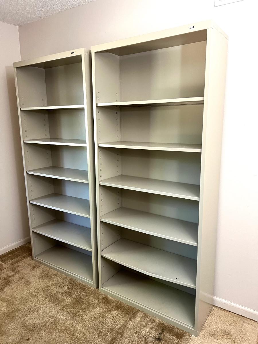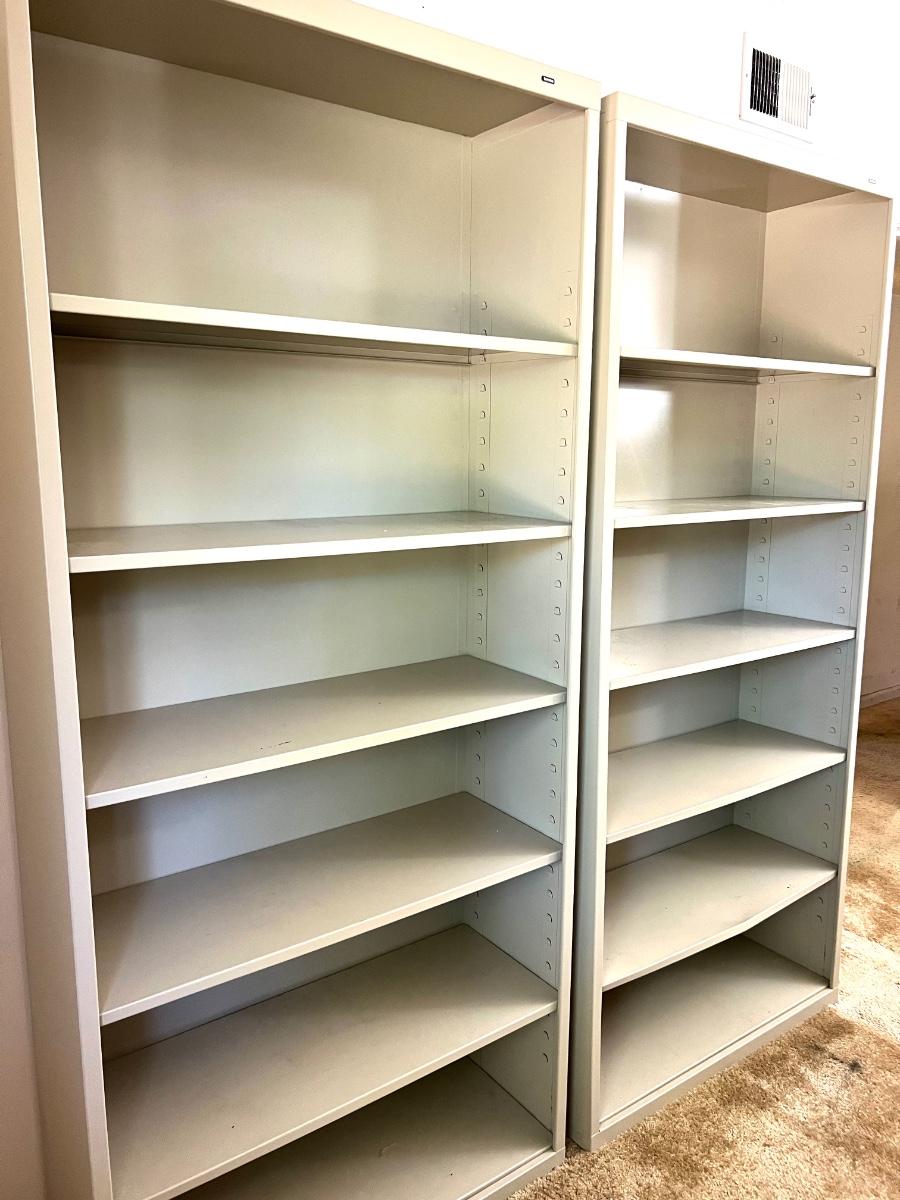 Pair (2) of TENNSCO Adjustable Metal Shelving. Measures 78 inches tall, 13 inches deep and 35 inches wide. Group 3 Shelves. Bottom shelf on one of the units is slightly bent, see pictures.