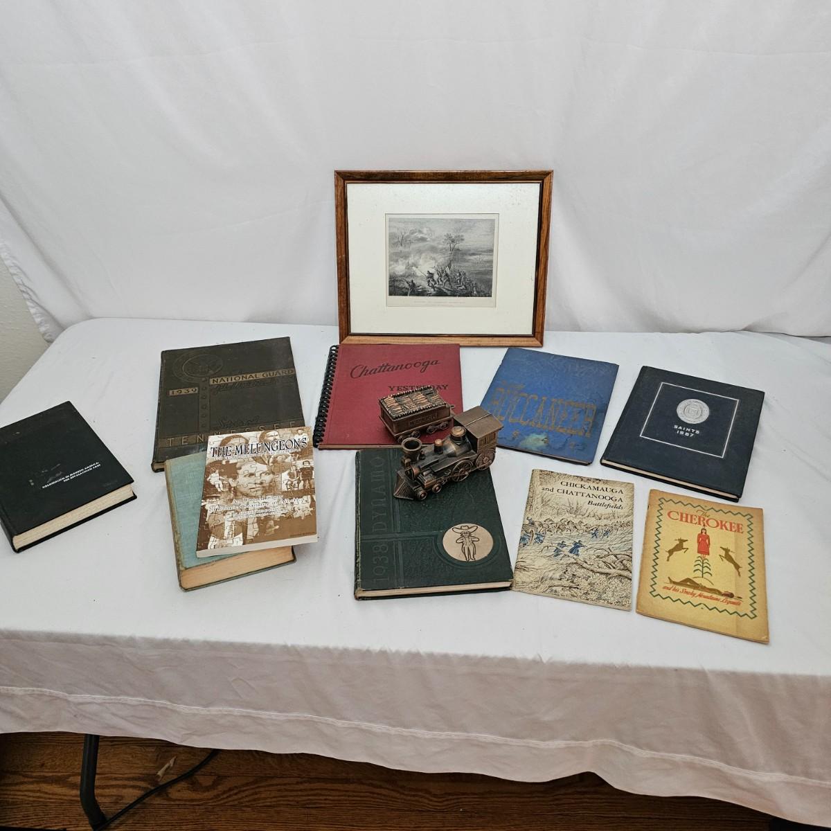 Yearbooks, chronicles and more about Tennessee and it's cities. Books from high school, college and the National Guard as well as a pictorial study of Chattanooga in years past. A metal bank replica of the General steam engine, famous for its part in the Civil War, 7" x 3" x 3"H. A framed print of the battle of Lookout Mountain, measures 12" x 15". Books have seen some use and have worn edges. See photos for details. Shipping available.