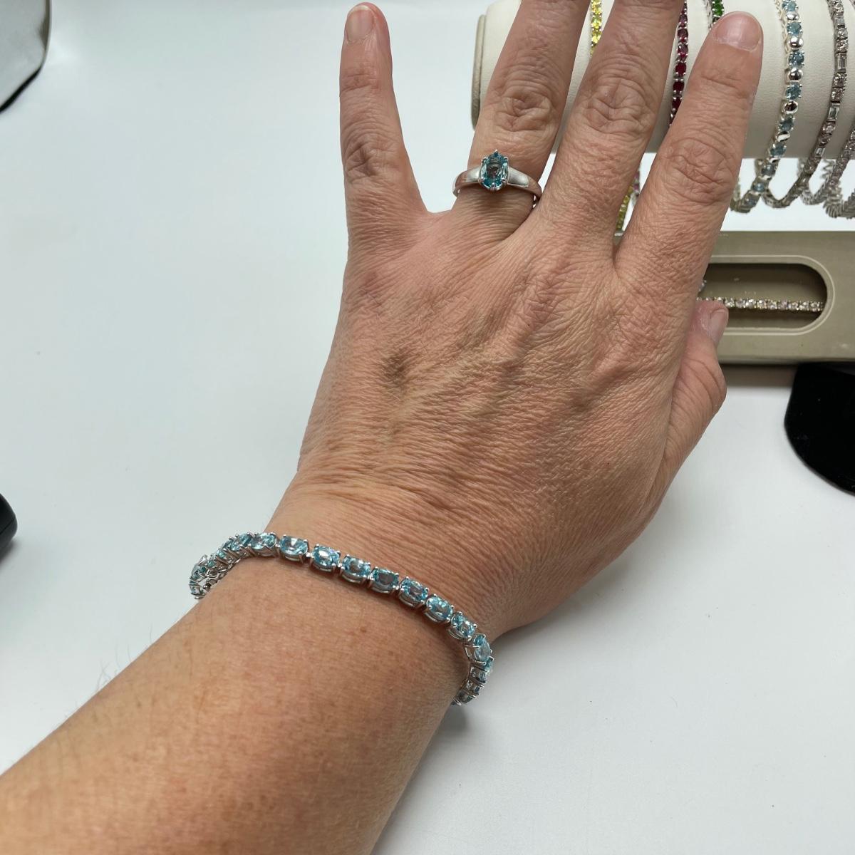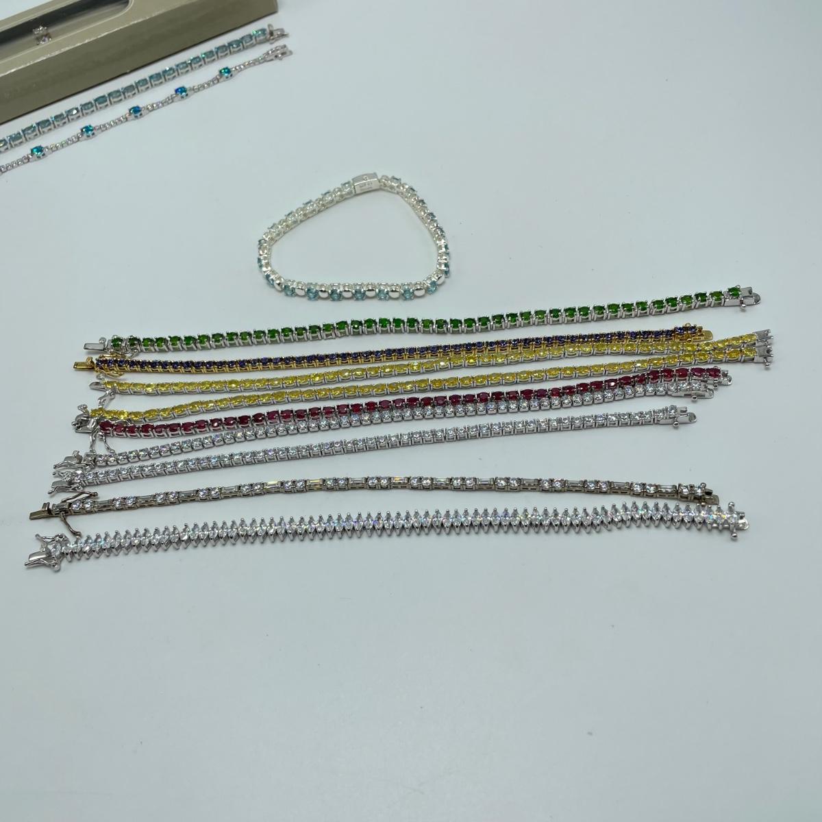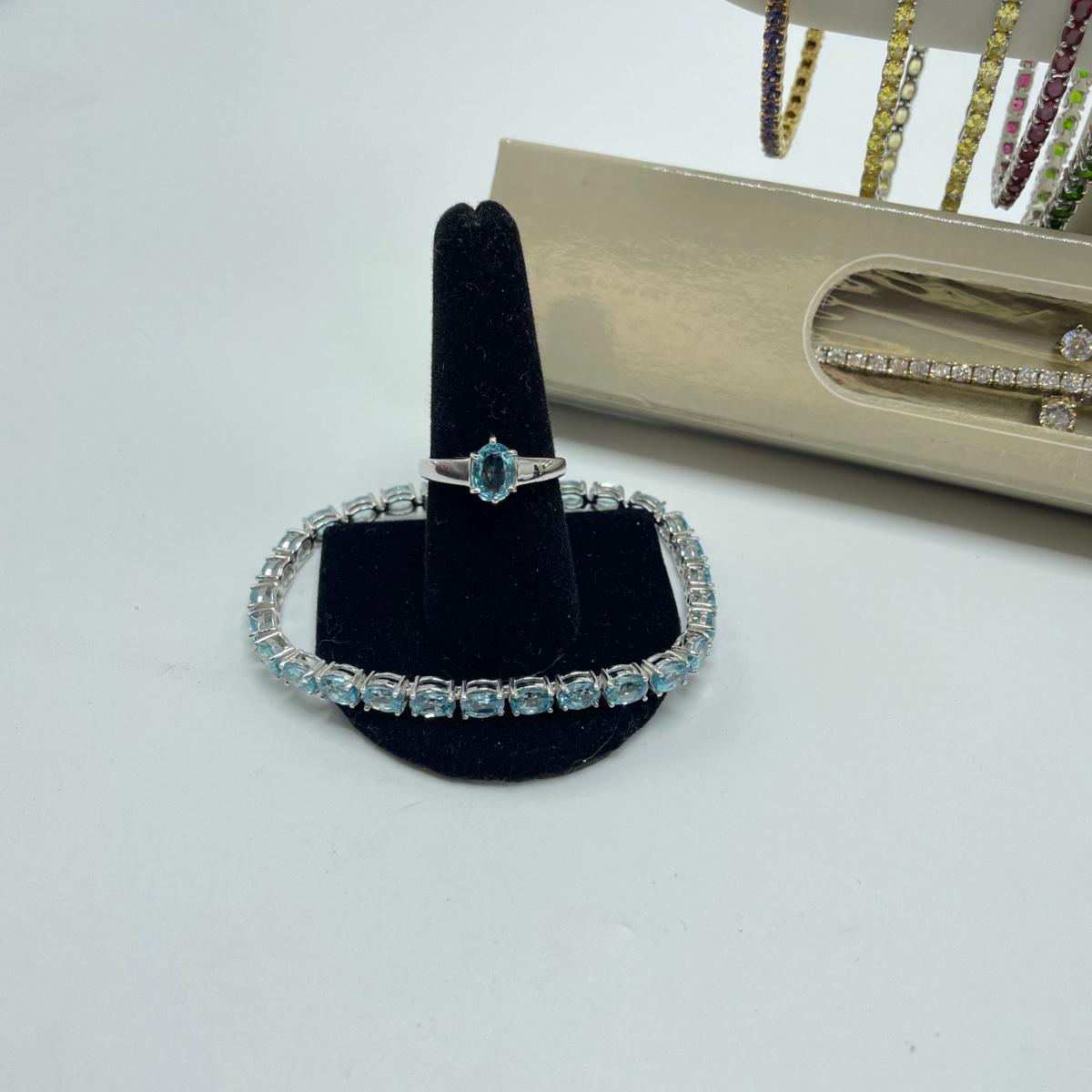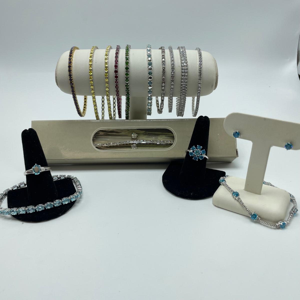 13 sparkling bracelets, two pairs of earrings for pierced ears and two rings complete this lot. One ring with an aqua marine colored stone matches one bracelet and another bright blue ring has complementing stud earrings and bracelet. The last set has crystal clear gems and is still set in its gift box. Most are marked 925 with the exception of the yellow gold colored bracelet with purple gems. The silver bead-like bracelet with aquamarine colored stones is closed, it may open again, but seems to be stuck at the moment. Please see photos for all markings found. We cannot guarantee the authenticity of the gemstones. All sales are final. No returns or refunds. Please bid accordingly.
