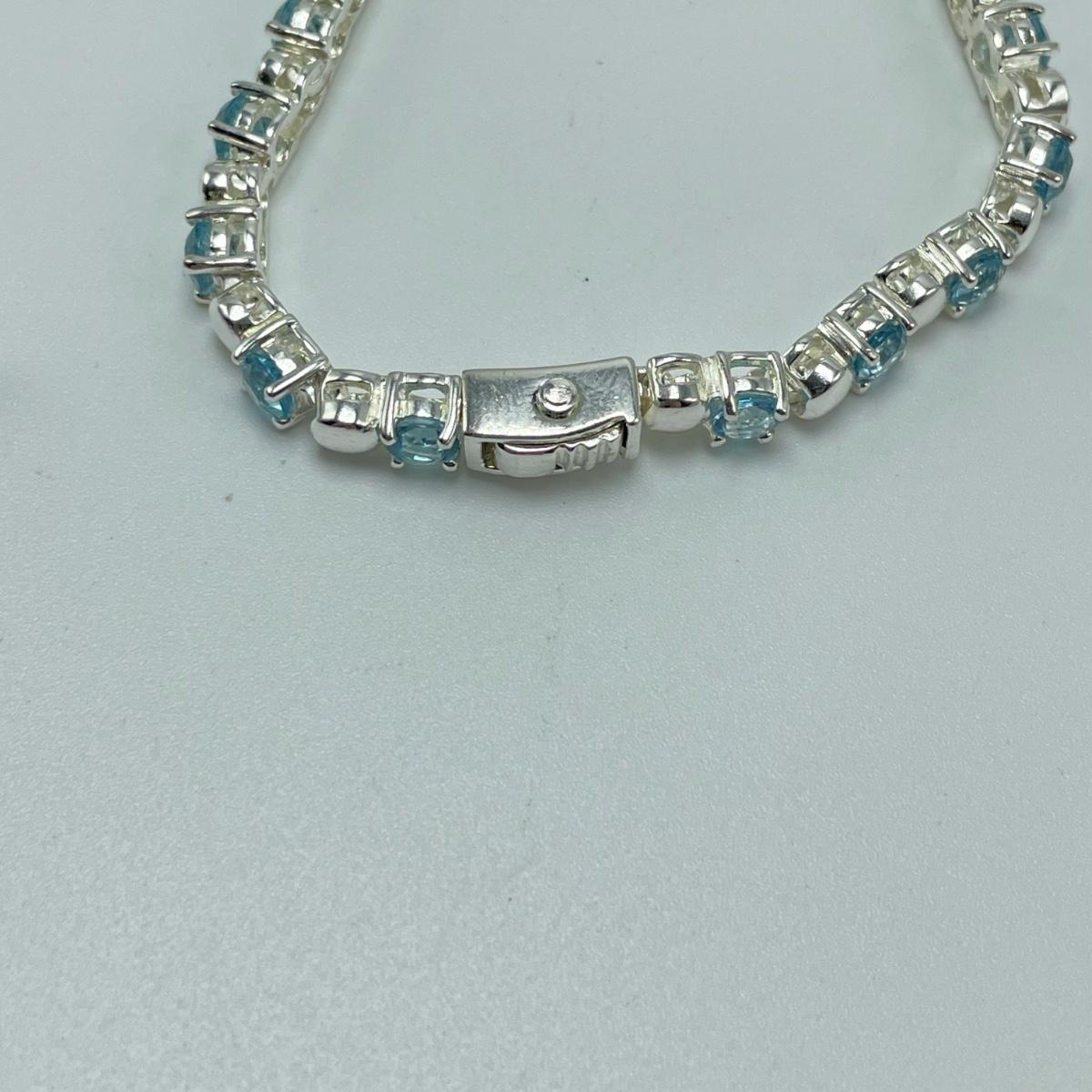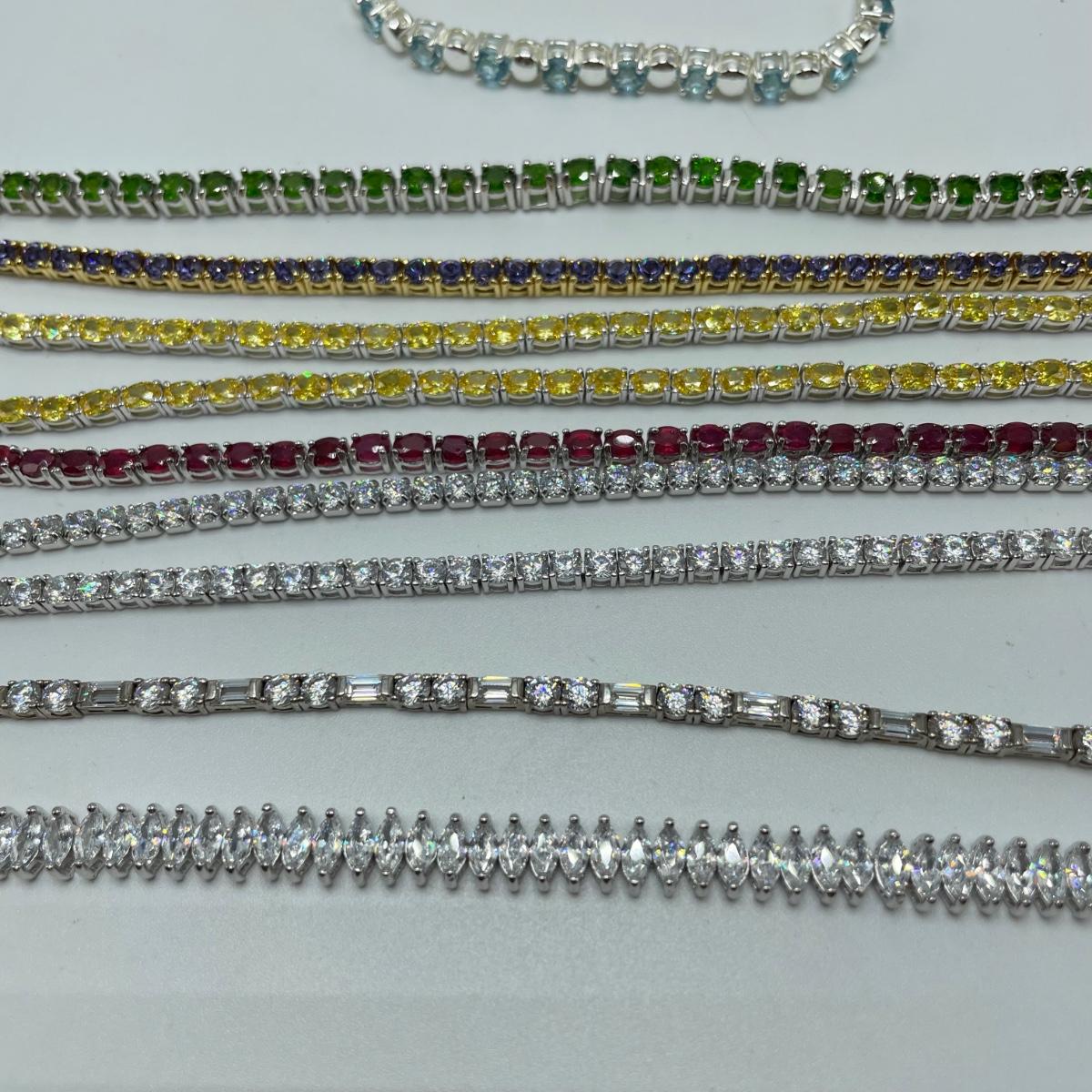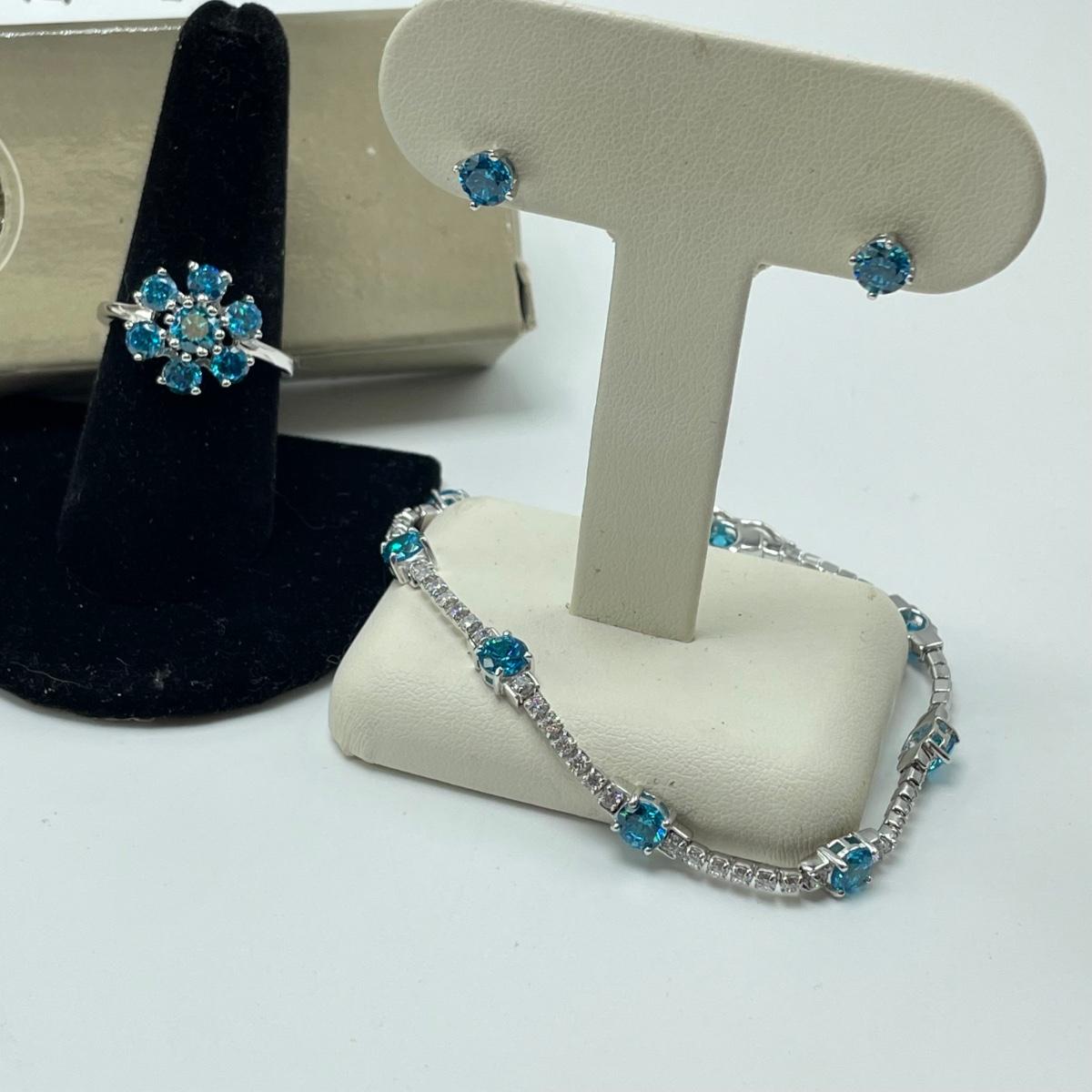 13 sparkling bracelets, two pairs of earrings for pierced ears and two rings complete this lot. One ring with an aqua marine colored stone matches one bracelet and another bright blue ring has complementing stud earrings and bracelet. The last set has crystal clear gems and is still set in its gift box. Most are marked 925 with the exception of the yellow gold colored bracelet with purple gems. The silver bead-like bracelet with aquamarine colored stones is closed, it may open again, but seems to be stuck at the moment. Please see photos for all markings found. We cannot guarantee the authenticity of the gemstones. All sales are final. No returns or refunds. Please bid accordingly.