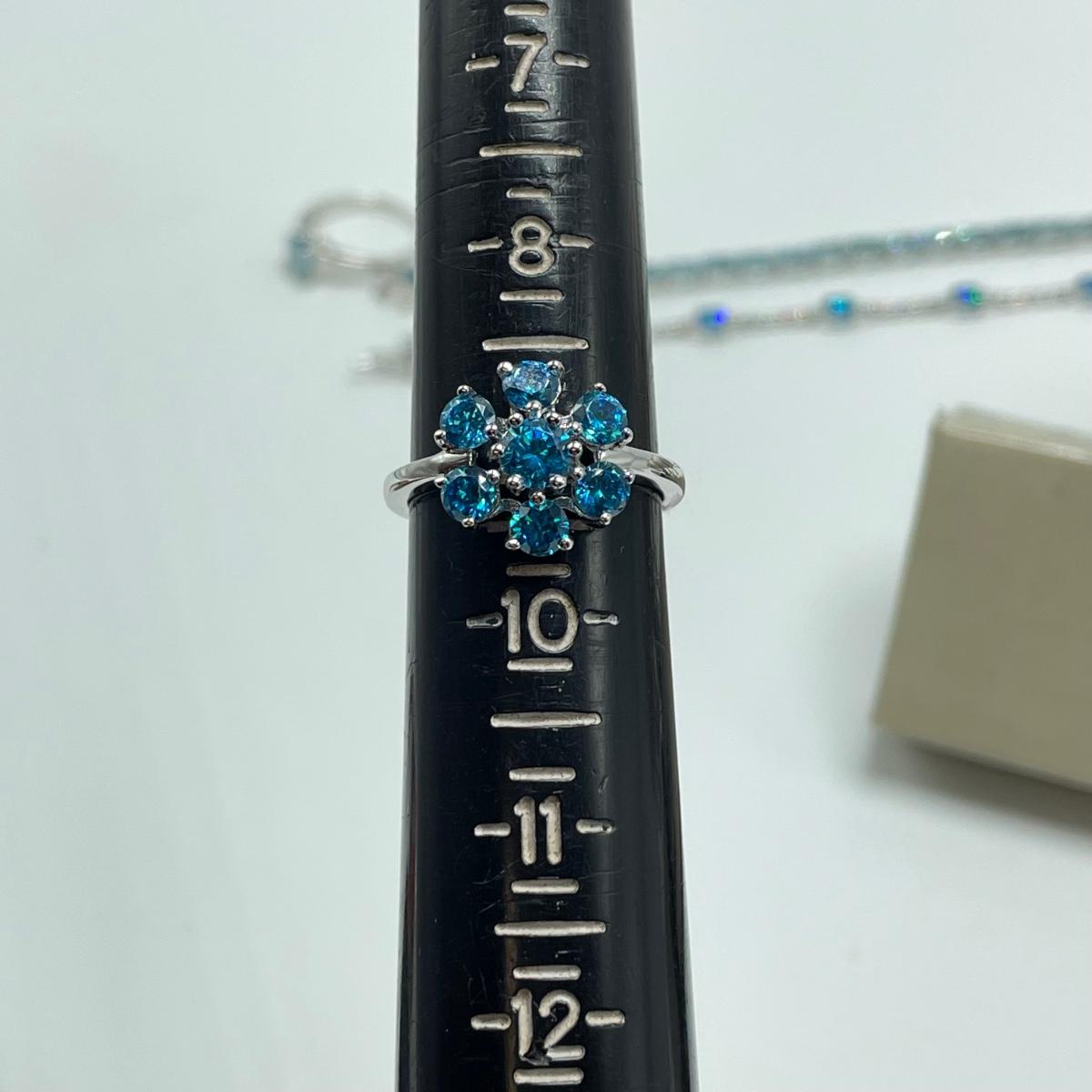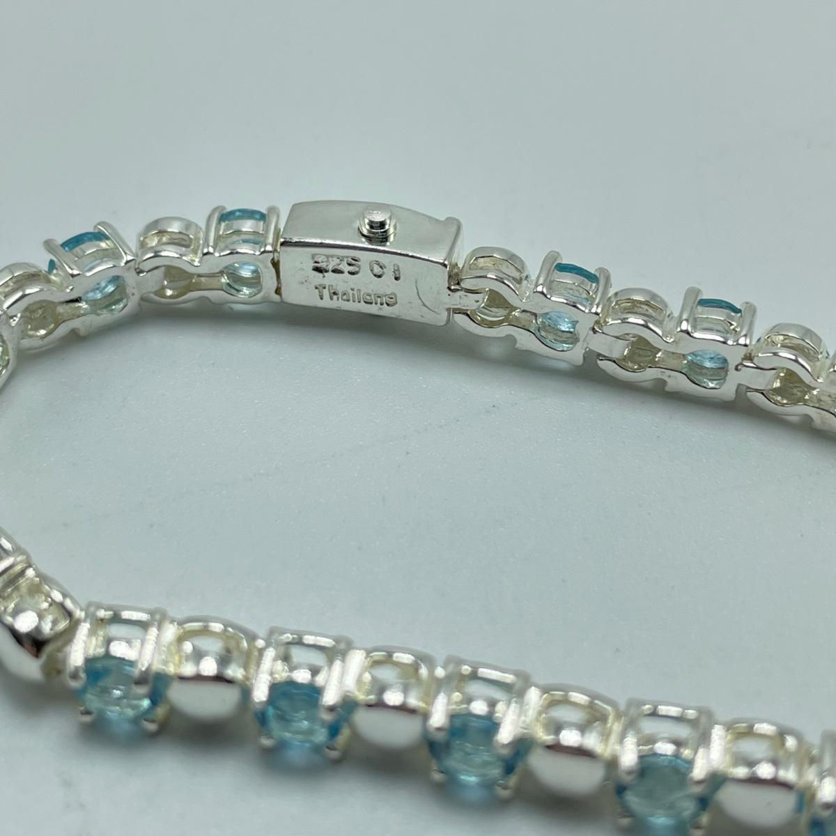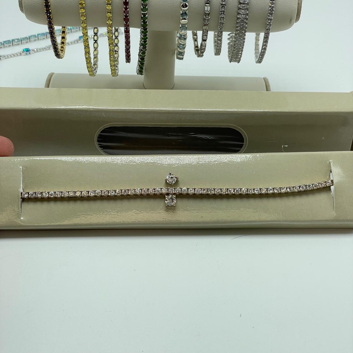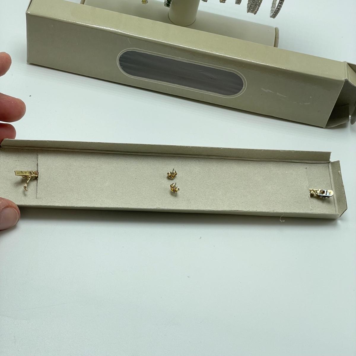 13 sparkling bracelets, two pairs of earrings for pierced ears and two rings complete this lot. One ring with an aqua marine colored stone matches one bracelet and another bright blue ring has complementing stud earrings and bracelet. The last set has crystal clear gems and is still set in its gift box. Most are marked 925 with the exception of the yellow gold colored bracelet with purple gems. The silver bead-like bracelet with aquamarine colored stones is closed, it may open again, but seems to be stuck at the moment. Please see photos for all markings found. We cannot guarantee the authenticity of the gemstones. All sales are final. No returns or refunds. Please bid accordingly.