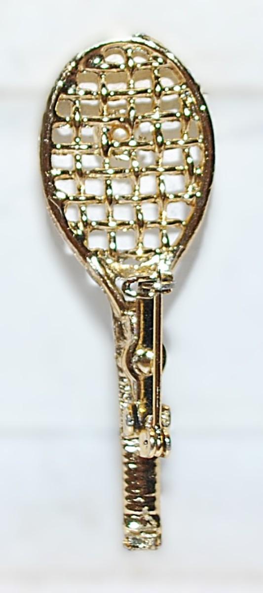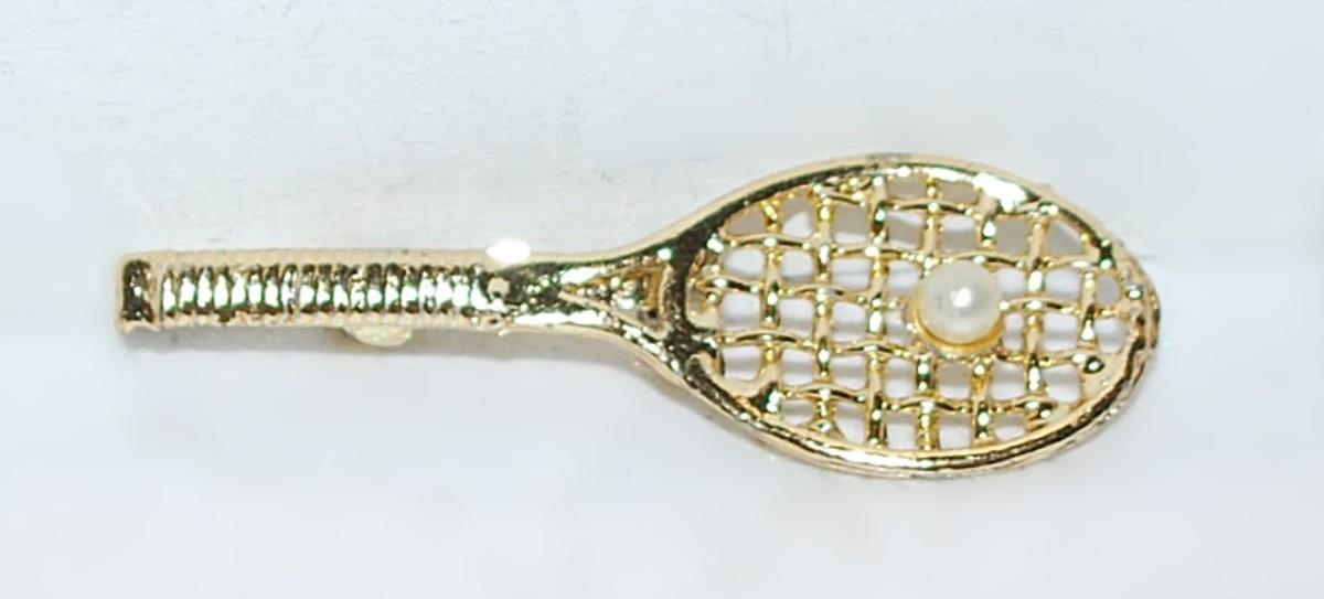 "Tennis Racket & Pearl" BROOCH (2" x ¾") on a Gold Tone Setting