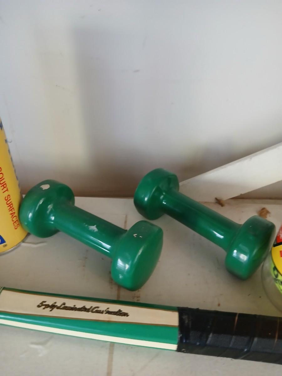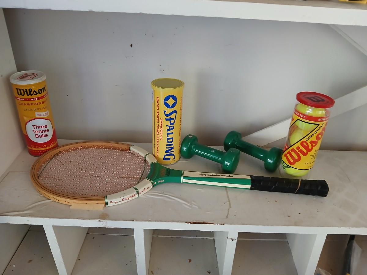 Tennis Raquet, tennis balls and a pair of hand weights