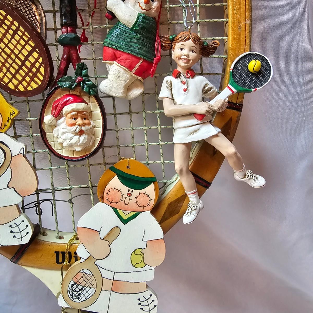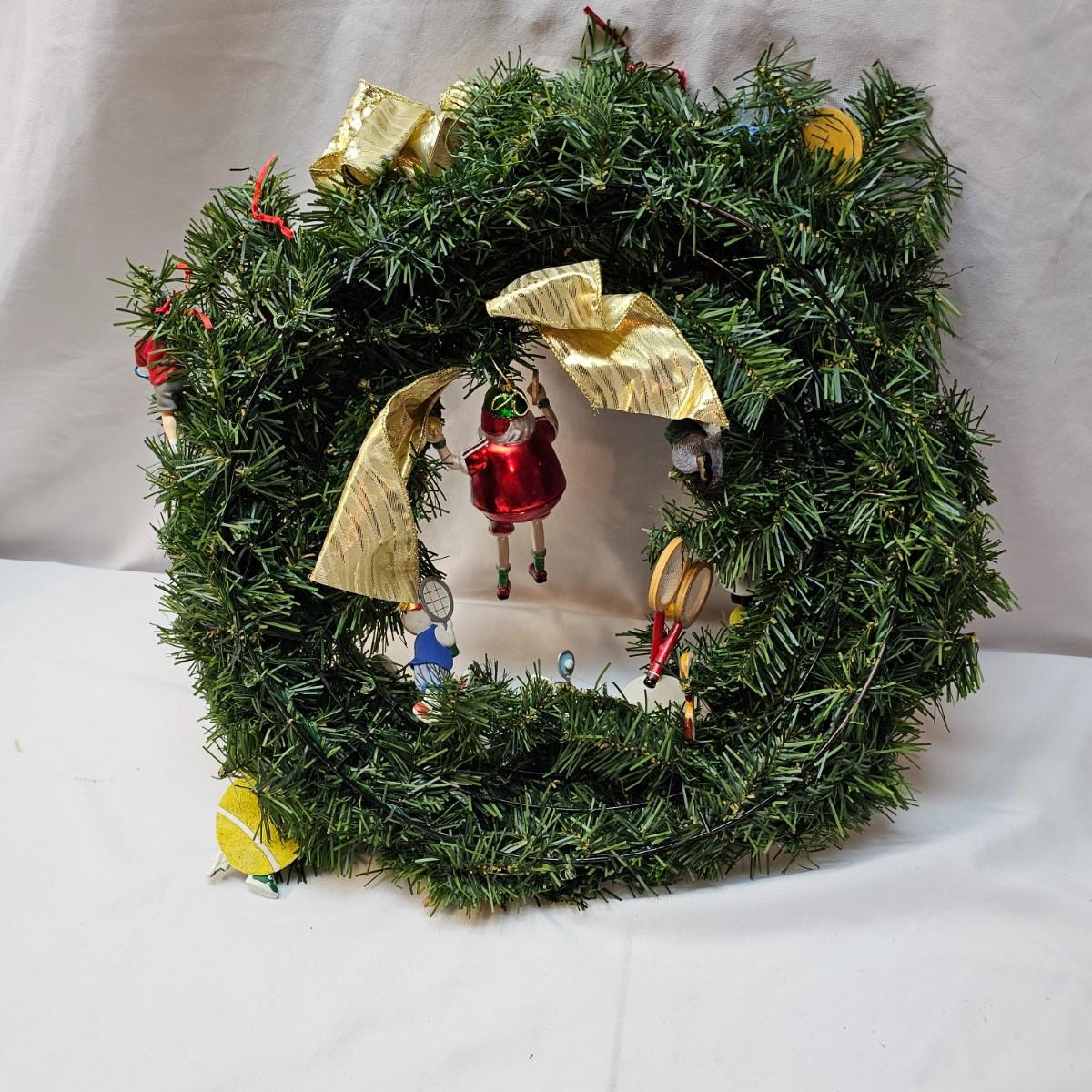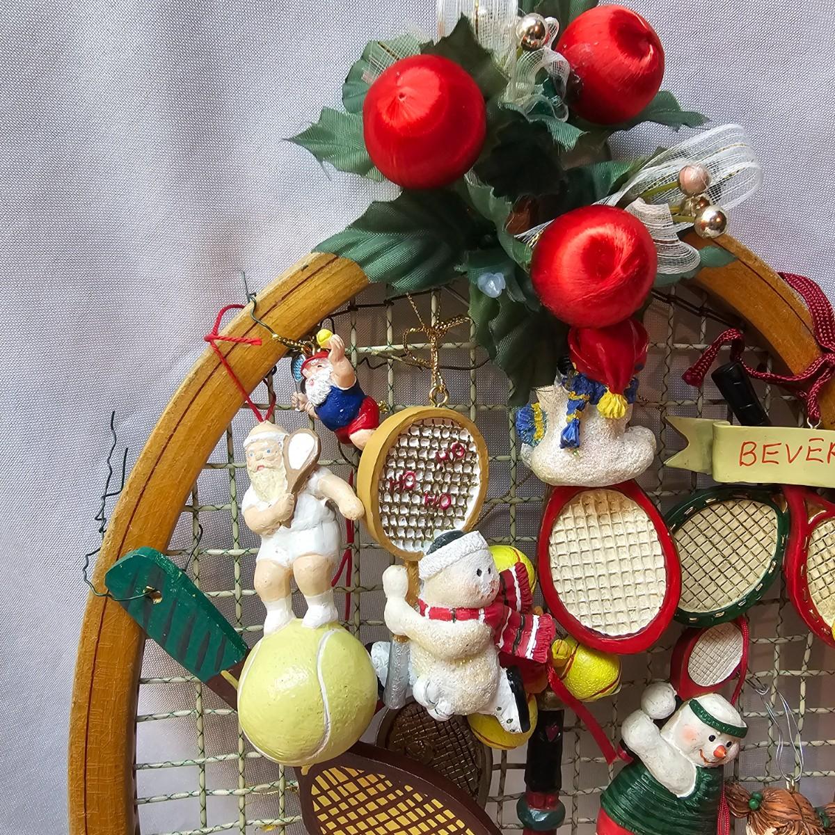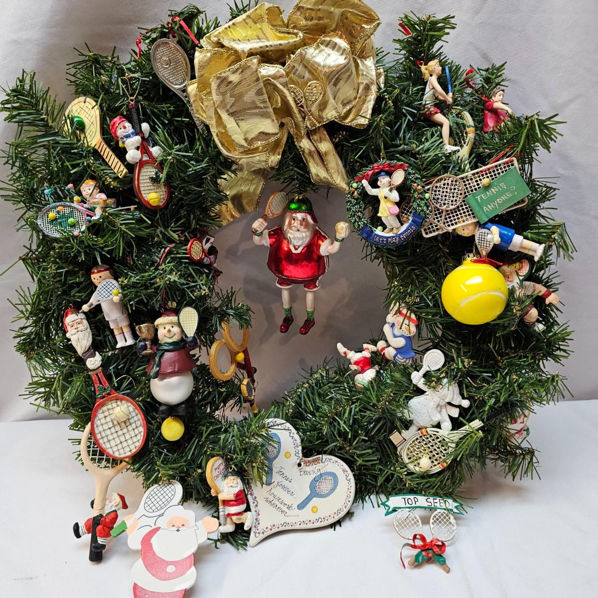 For the tennis aficionado a fun wreath and racket decorated with everything tennis. Kids, adults, snowmen and Santa all ready for the next serve. Also includes several other loose ornaments as well. See photos for details. Shipping available.