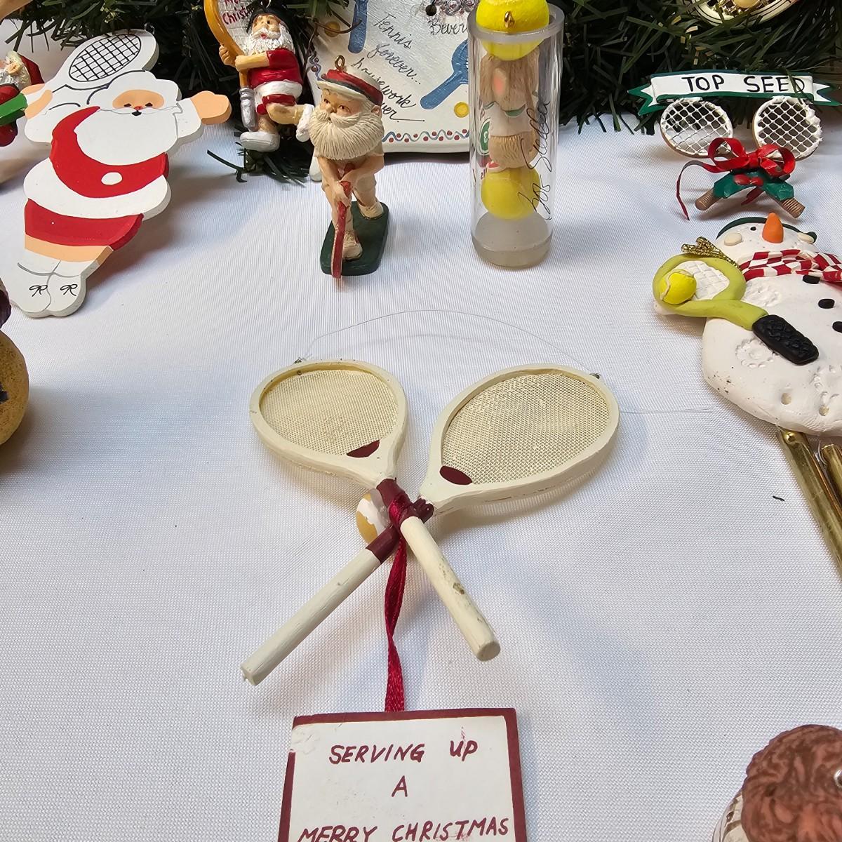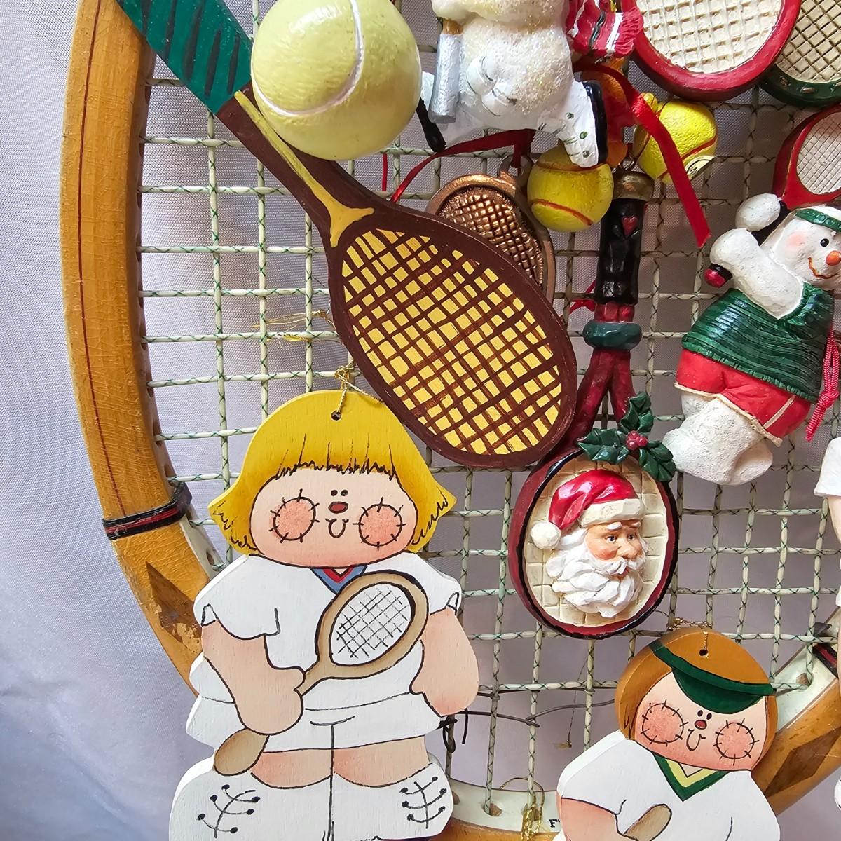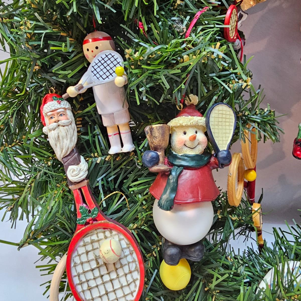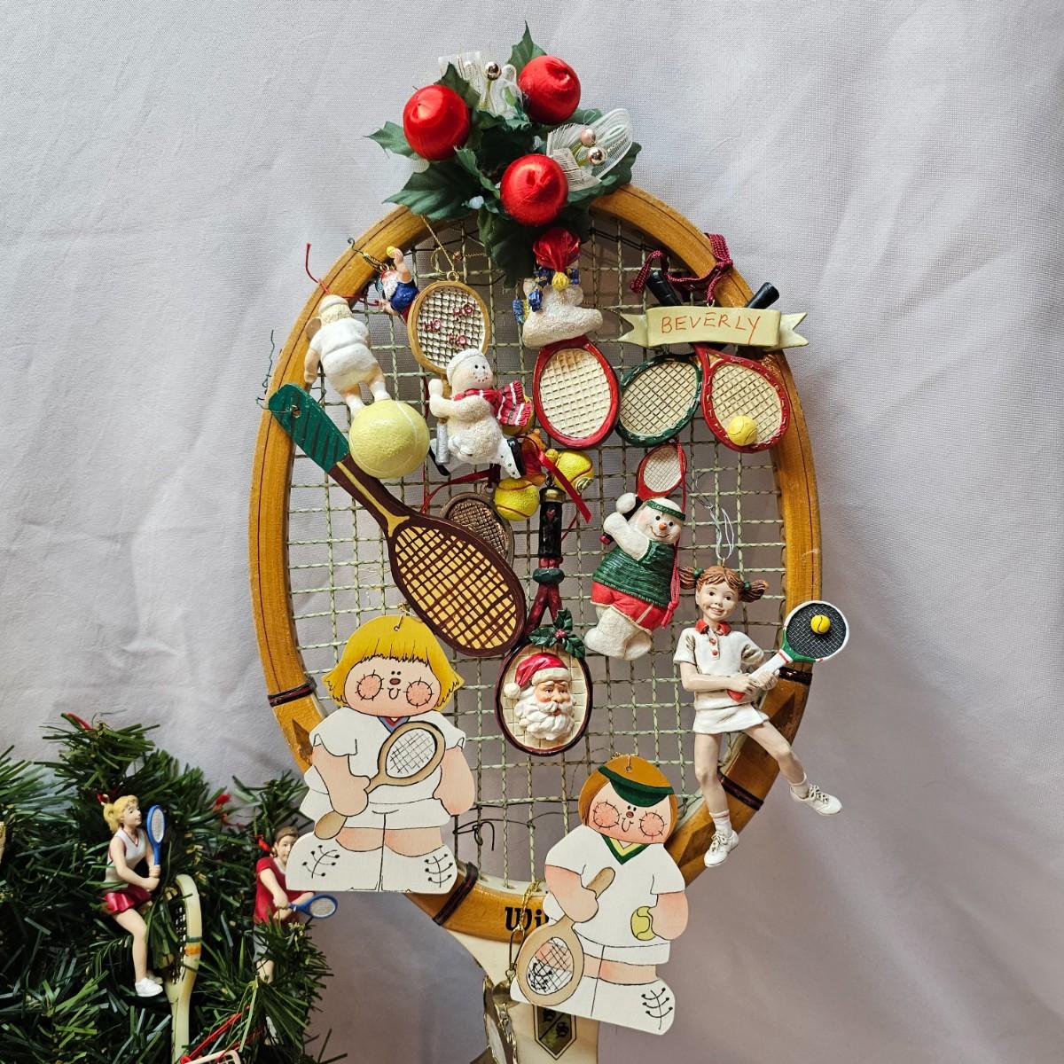 For the tennis aficionado a fun wreath and racket decorated with everything tennis. Kids, adults, snowmen and Santa all ready for the next serve. Also includes several other loose ornaments as well. See photos for details. Shipping available.