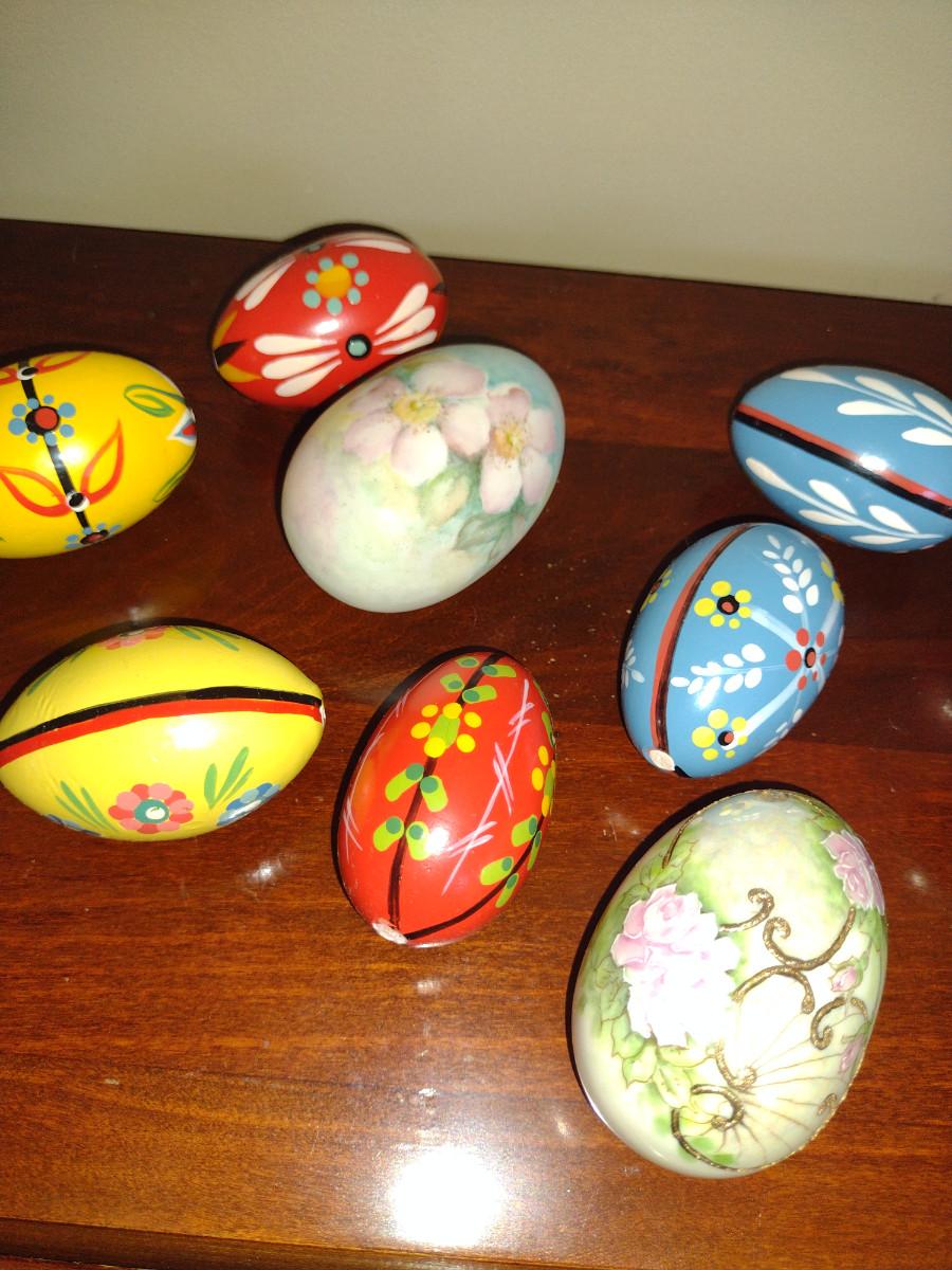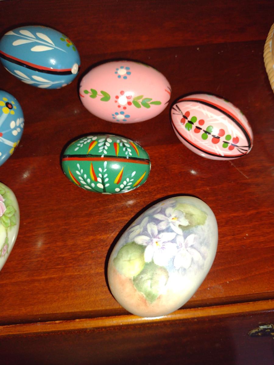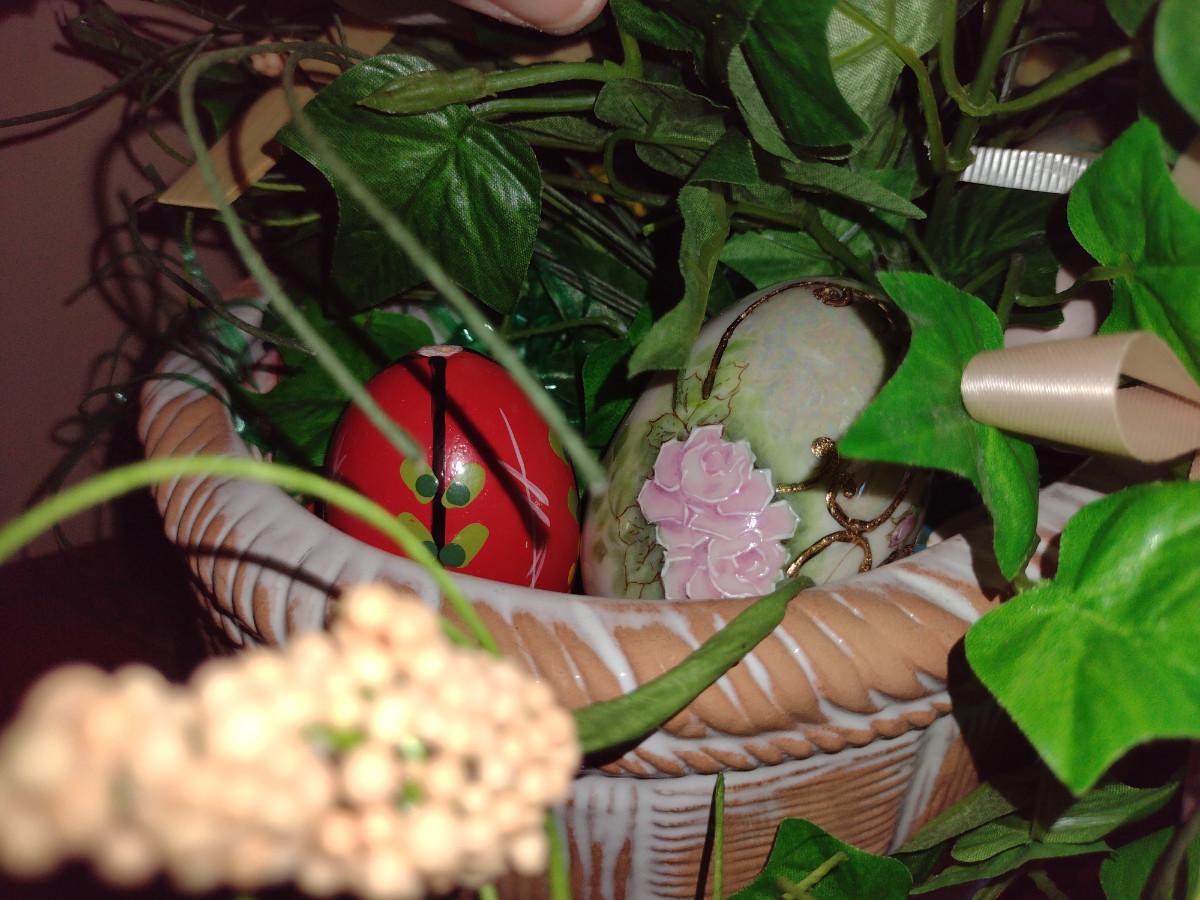 Terra Cotta Basket with Hand Painted Porcelain and Wooden Eggs.