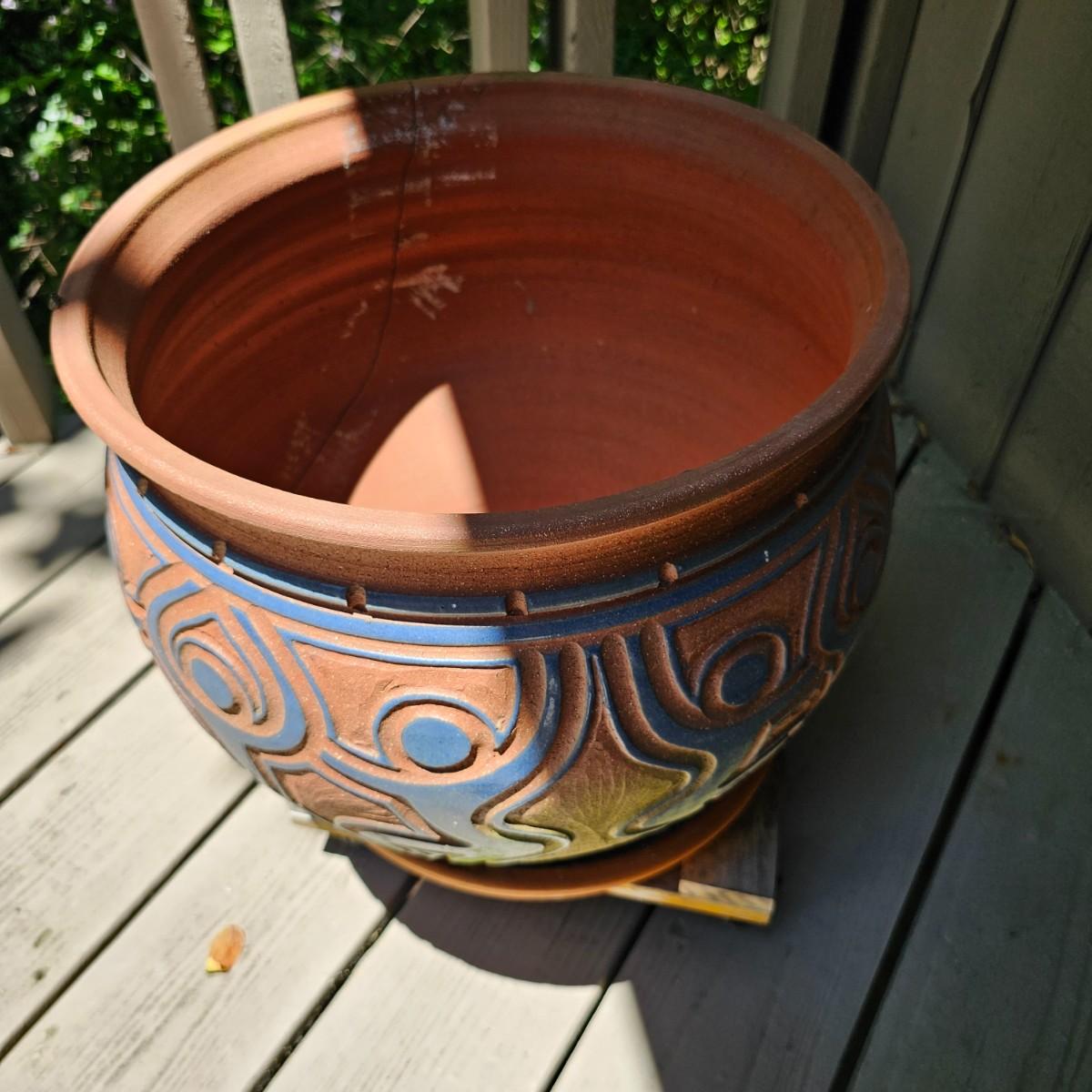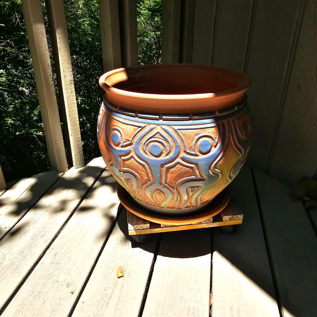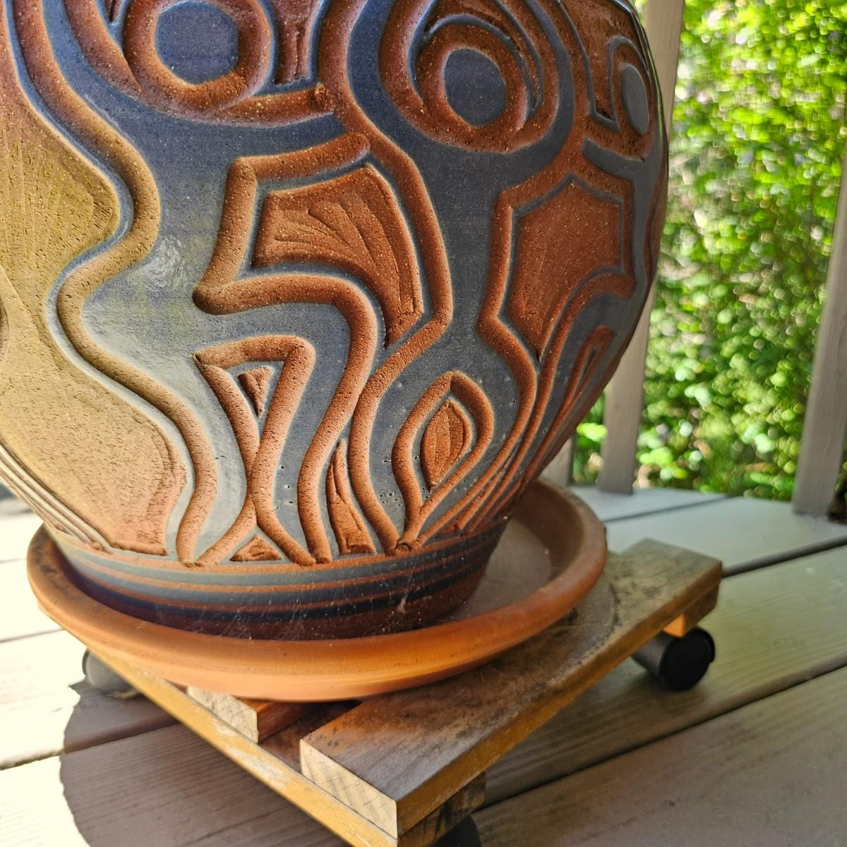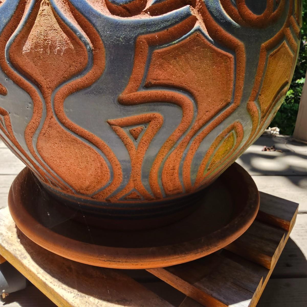 Beautiful terra cotta carved pot with dancers cavorting around the outside. Pot measures 17"D x 13"H, sits on clay saucer and wood rolling stand. Pot has several cracks and chips, see photos for details. Local pickup only.