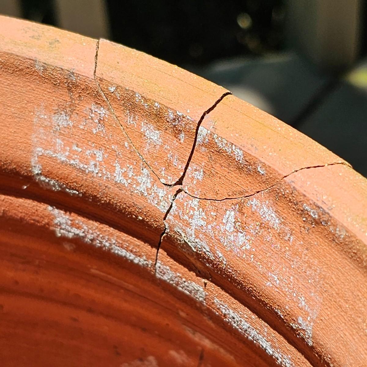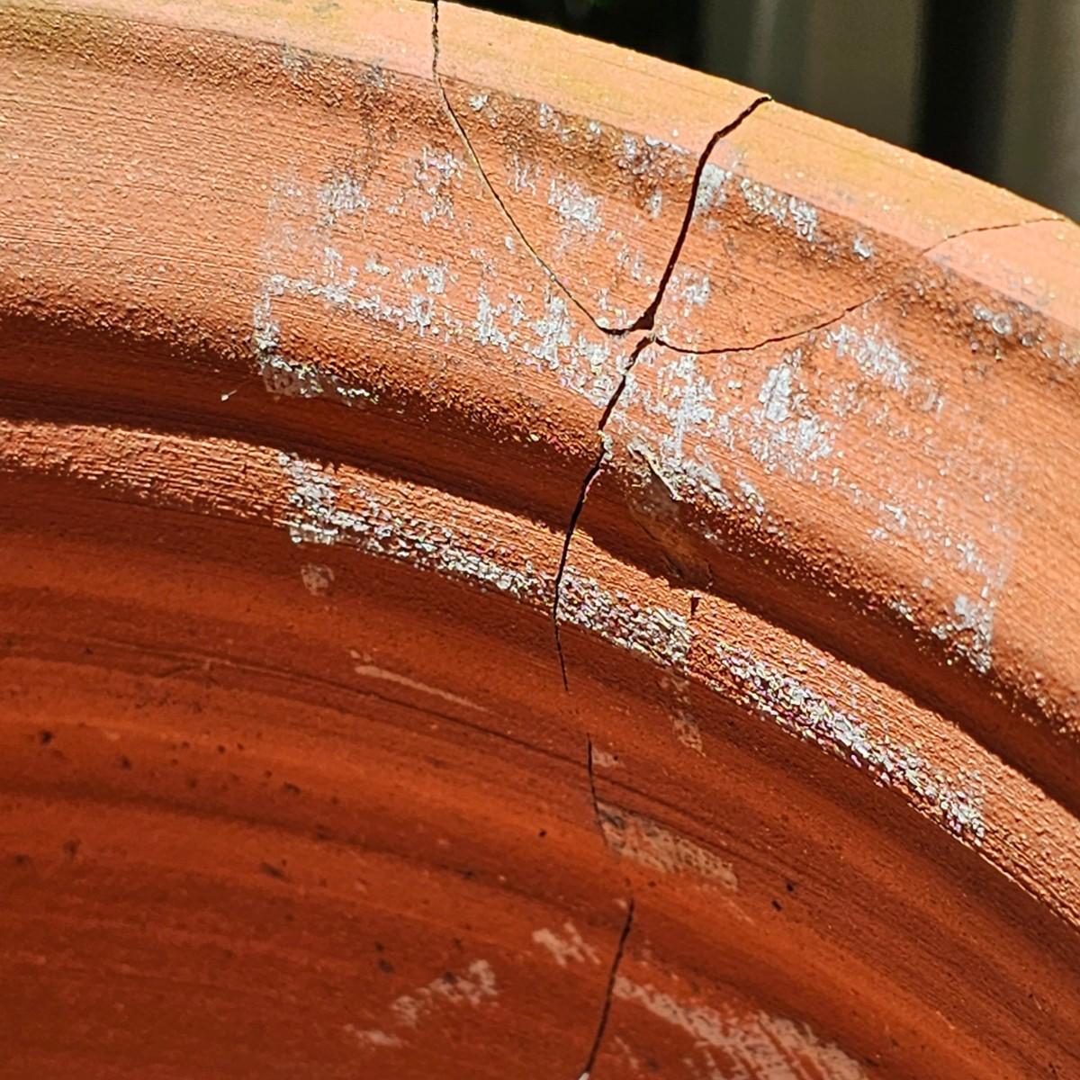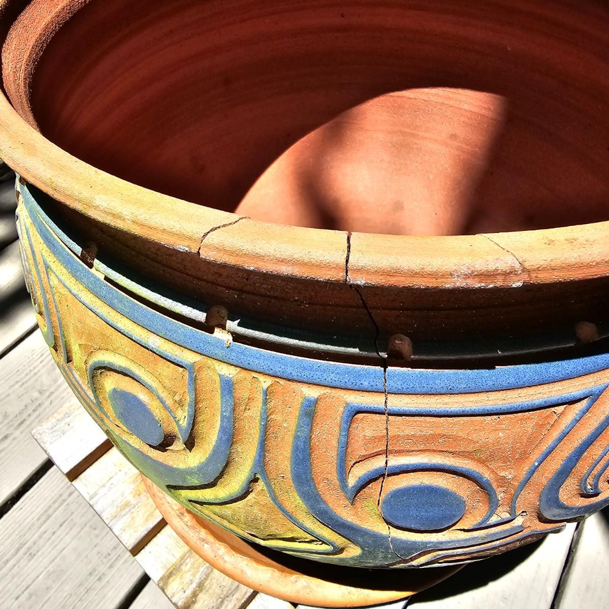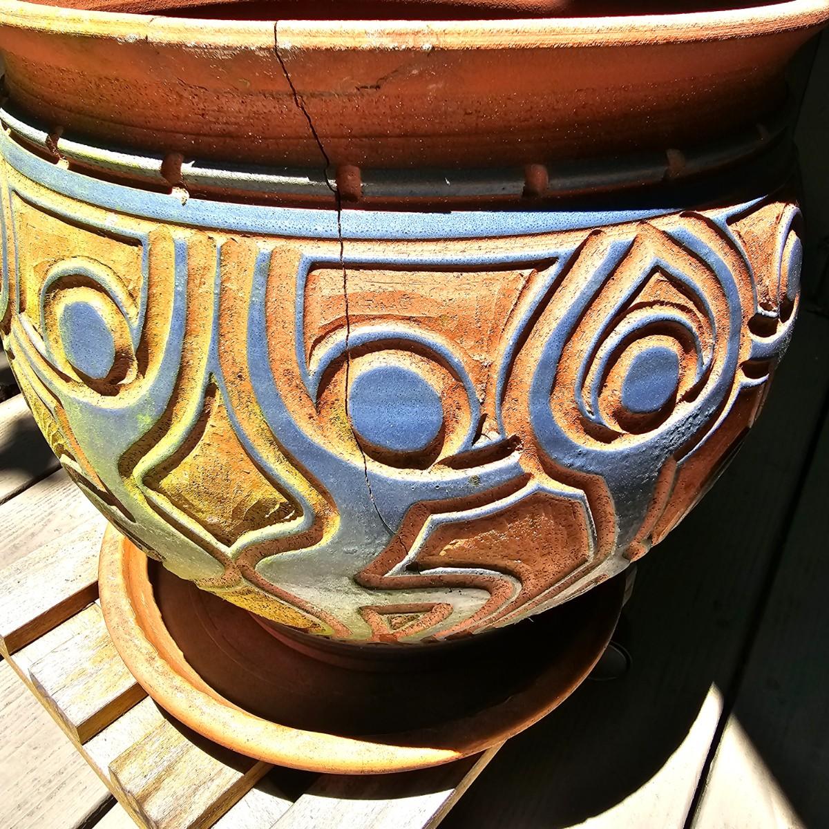 Beautiful terra cotta carved pot with dancers cavorting around the outside. Pot measures 17"D x 13"H, sits on clay saucer and wood rolling stand. Pot has several cracks and chips, see photos for details. Local pickup only.