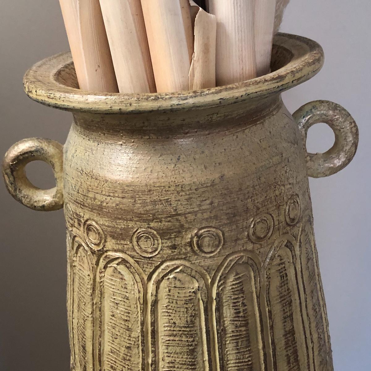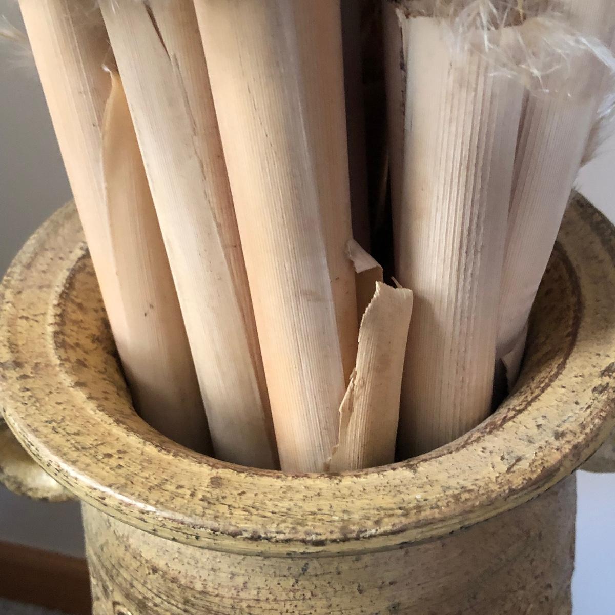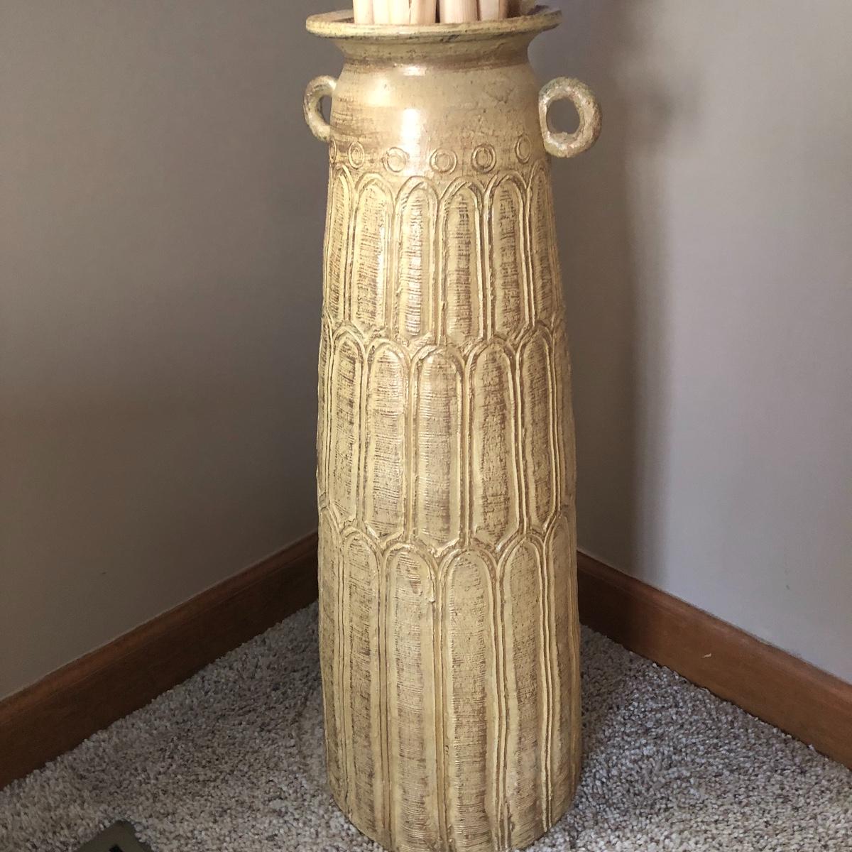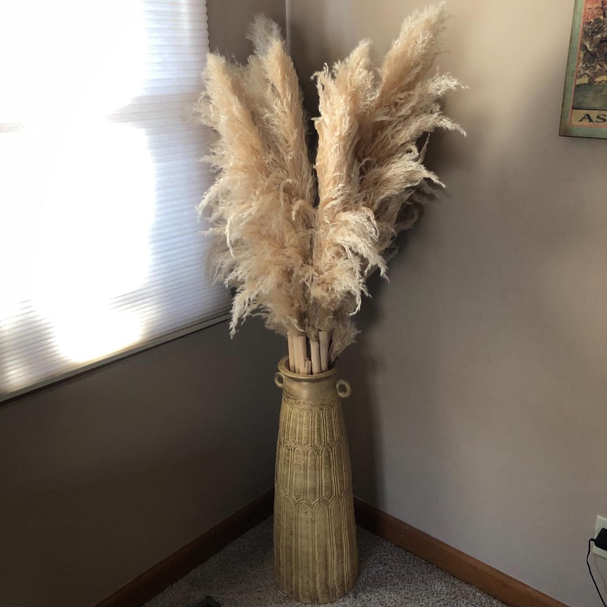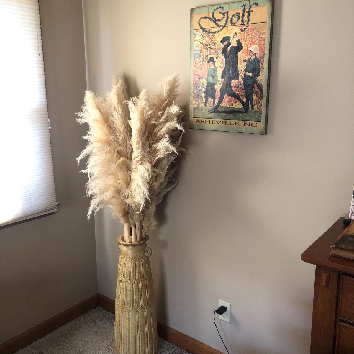 The floor vase is 28.5” tall and the base is 10” in diameter. The grasses make it about 62” tall. The pallet like Art measures 17” x 23”. Local pick up only.