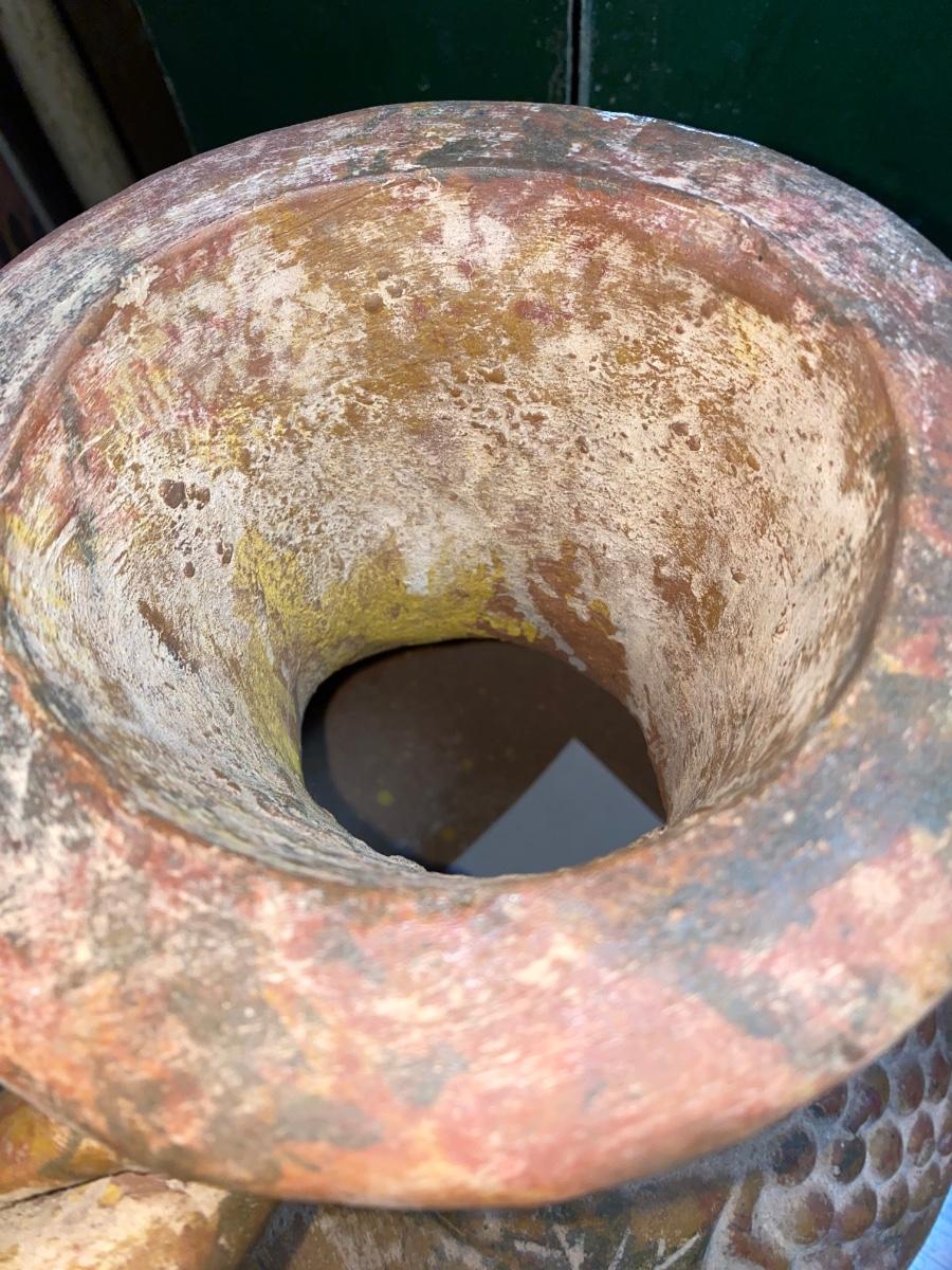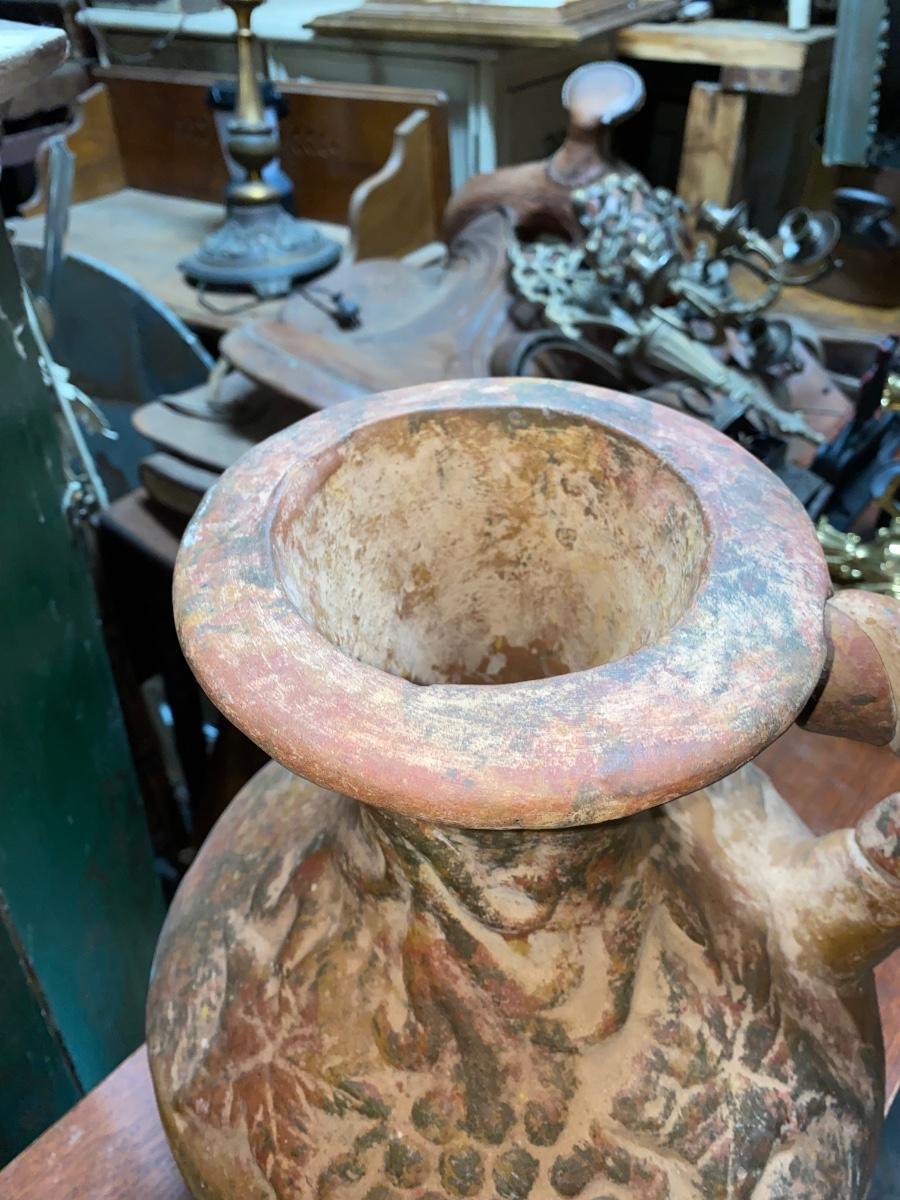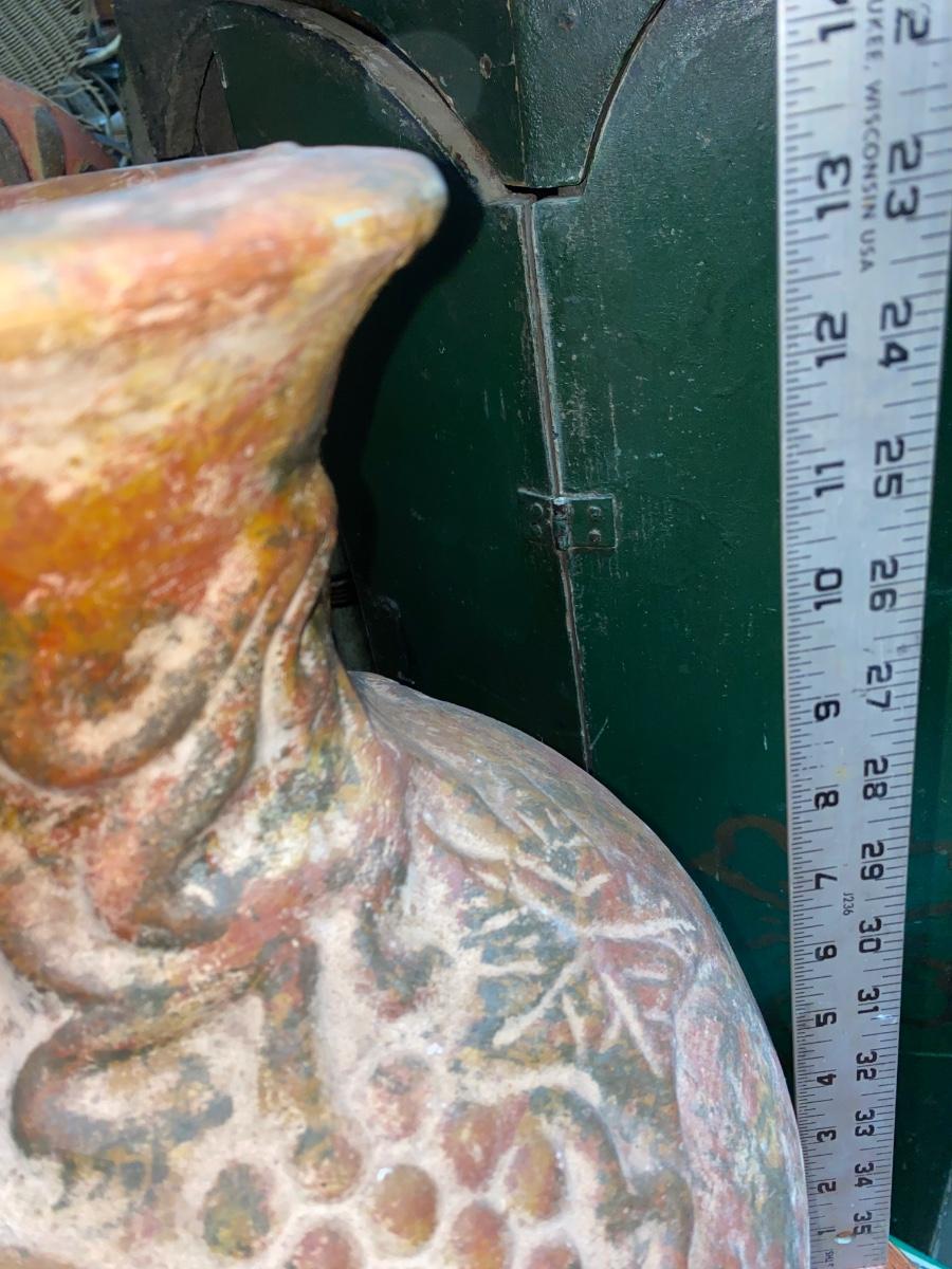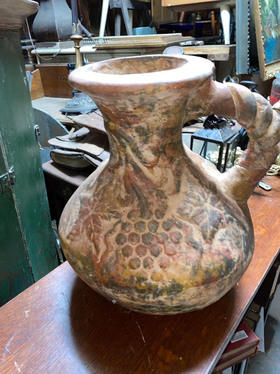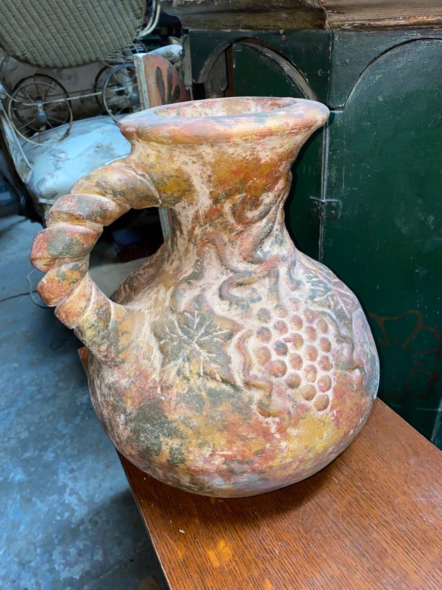 Terra cotta jug with twist handle and vine and grape relief pattern. It is HEAVY!